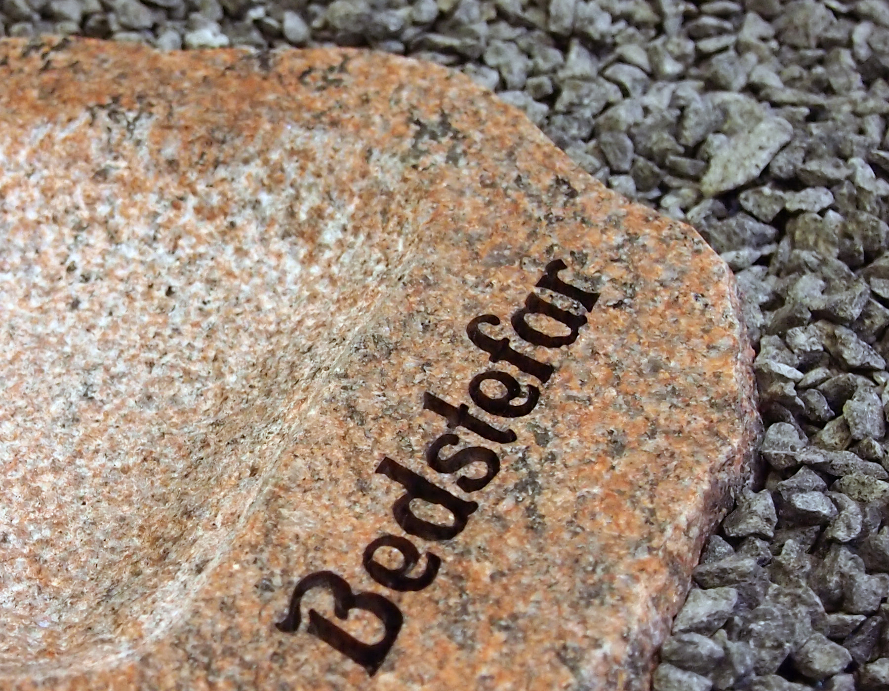 Lille tekst indhugget tekst eller tegning i sten såsom trædesten, bænke, fuglebad, figurer eller andre naturstens produtker.