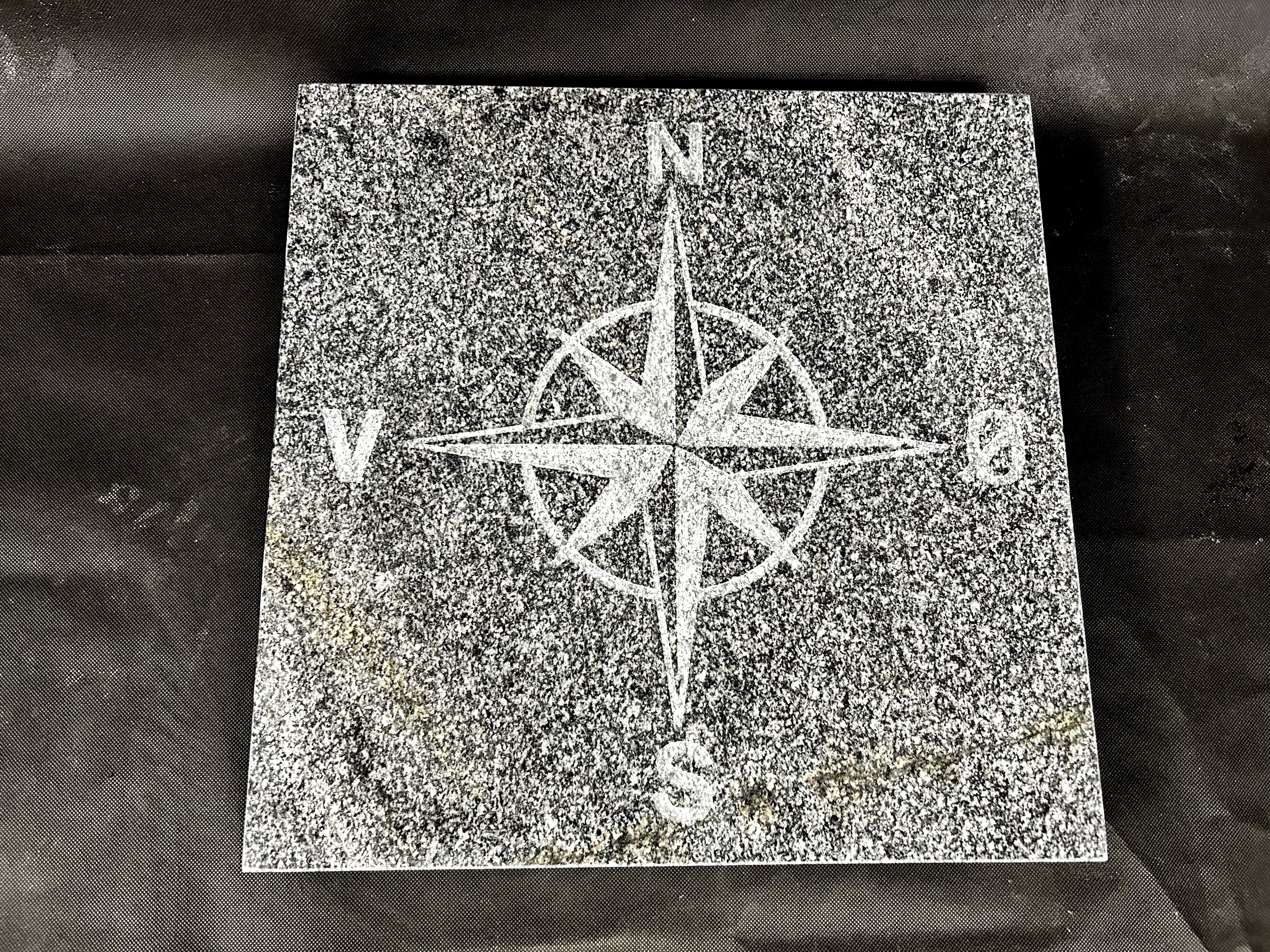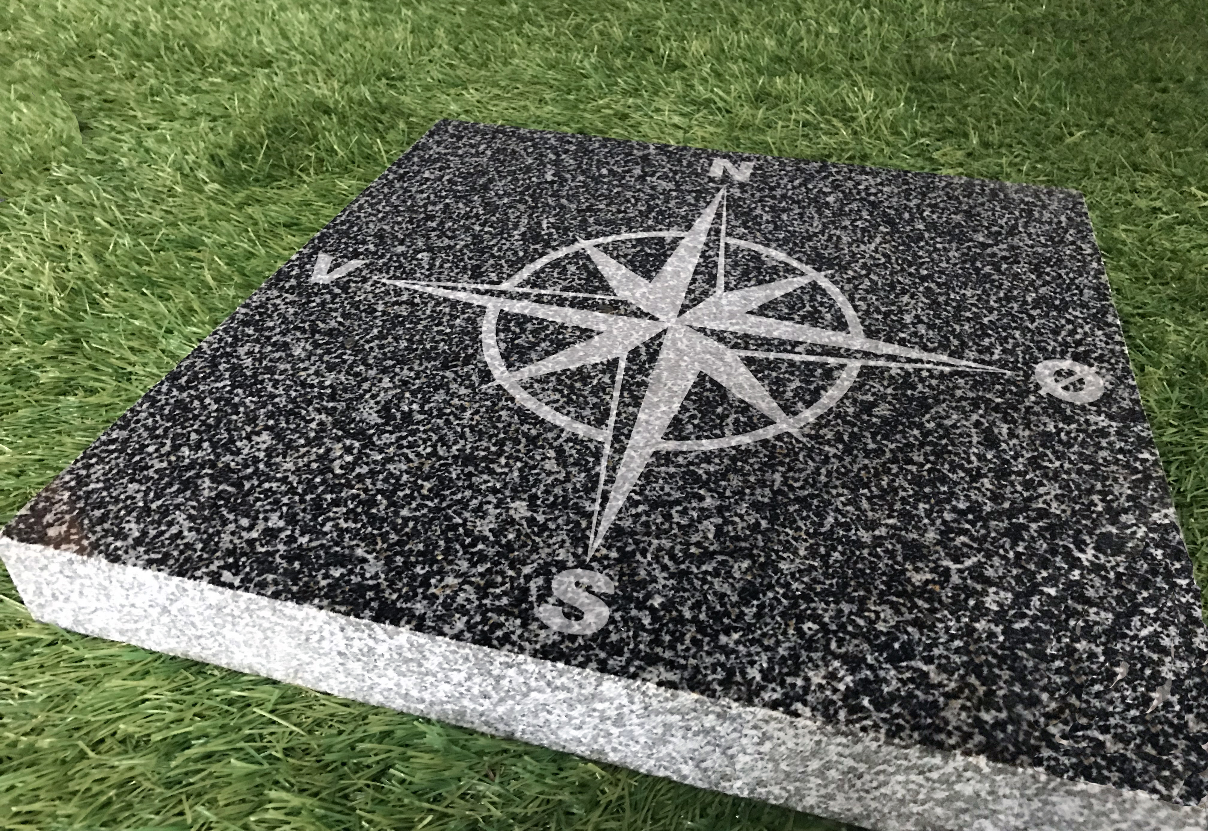 Firkantet flise i gråsort indisk granit med sandblæst motiv. Den kvadratiske flise skiller sig ud fra kompasrose familien, da den netop er firkantet. Dette gør dog at den passer perfekt ind på terrassen. Flisens kompas er sandblæst og derfor tydelig i den polerede overflade.
