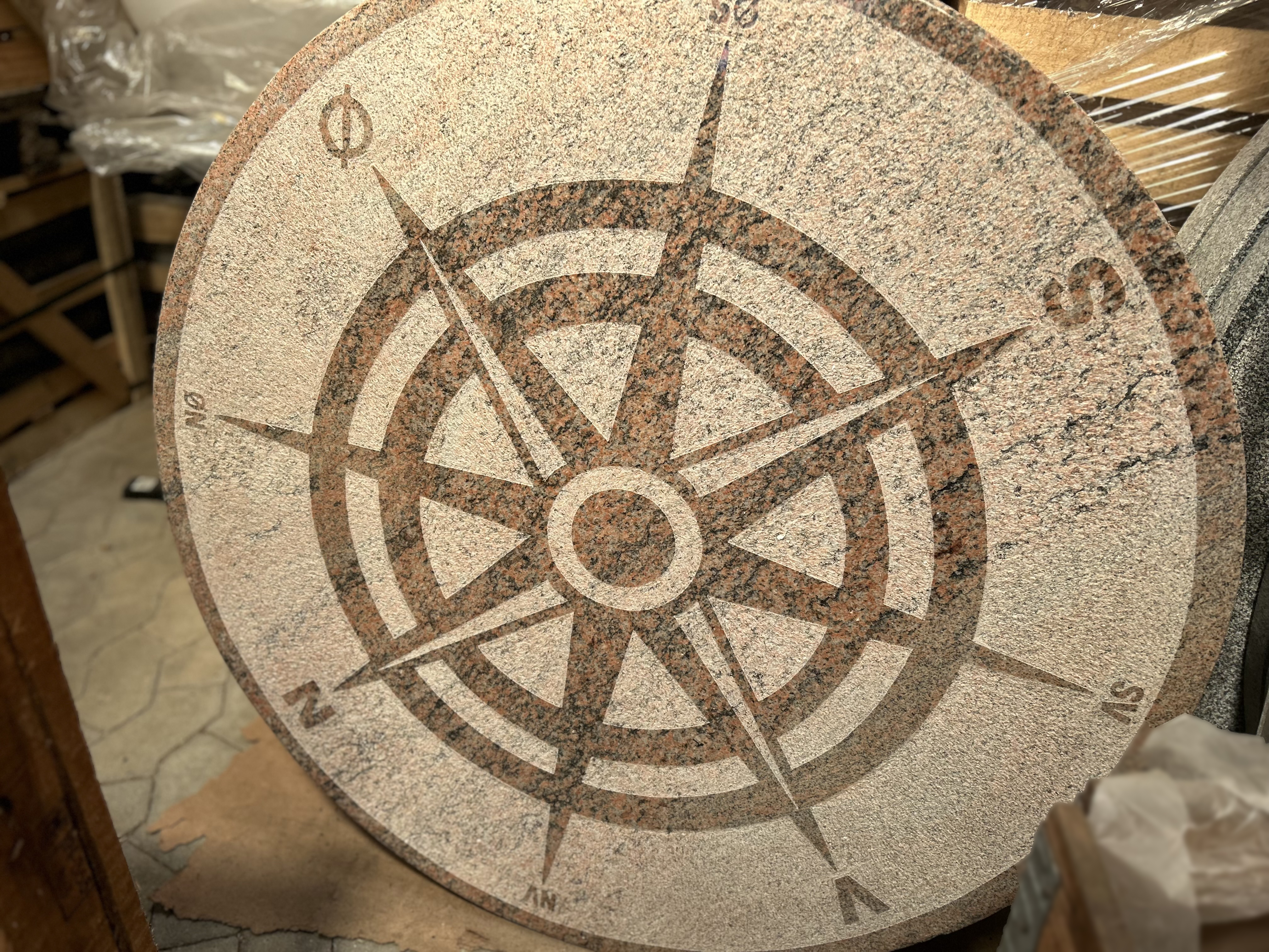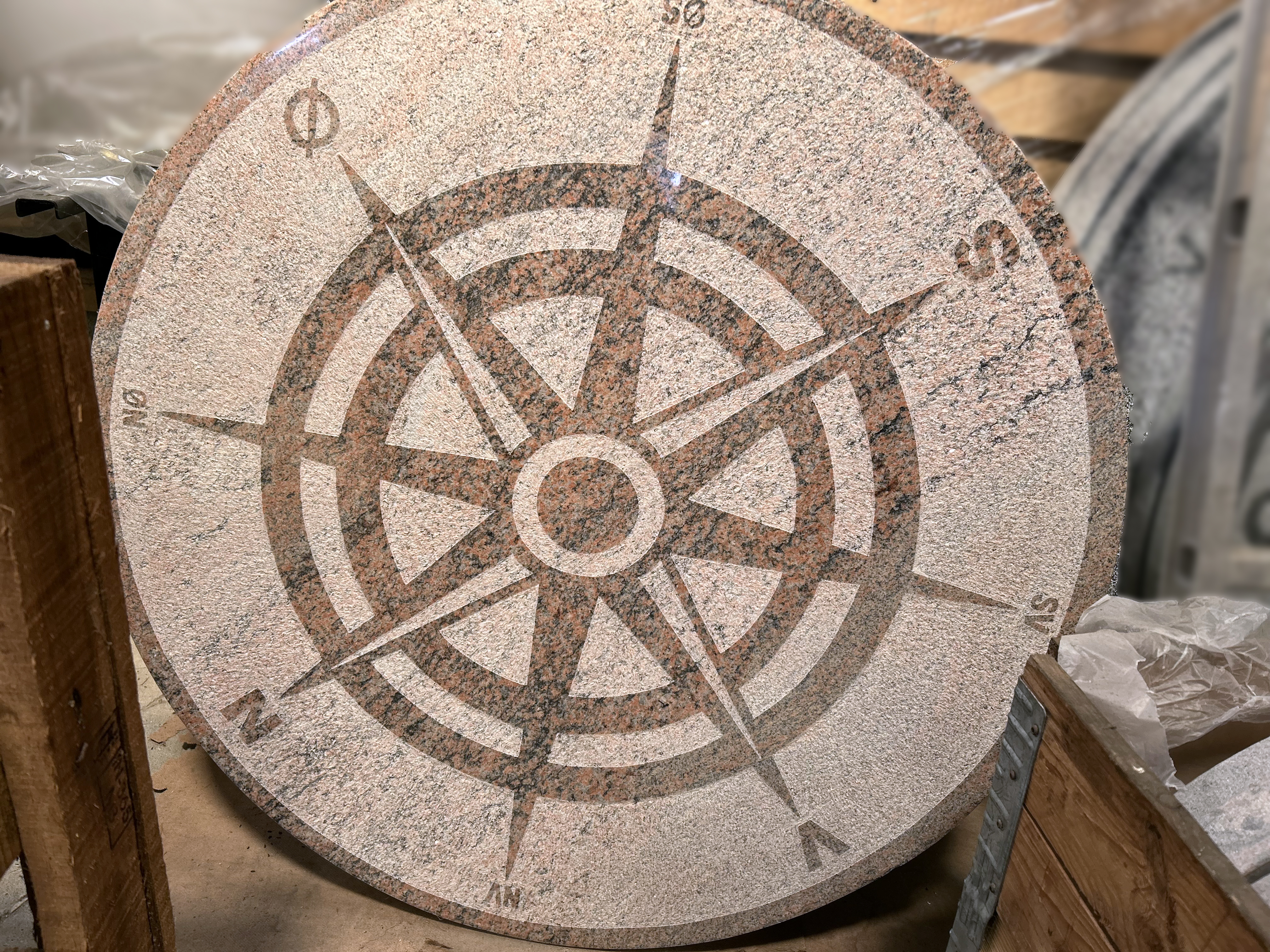 Den røde granit kompasrose på billedet er et rundt, dekorativt stykke, der måler cirka 100 cm i diameter. Kompasrosen er indgraveret i granitten og viser de fire hovedretninger: nord (N), syd (S), øst (Ø) og vest (V), samt mellem retningerne nordøst (NØ), nordvest (NV), sydøst (SØ) og sydvest (SV). Granitten har en rødlig tone med naturlige korn og mønstre. Detaljerne er polerede mens resten er rustik i overfladen.