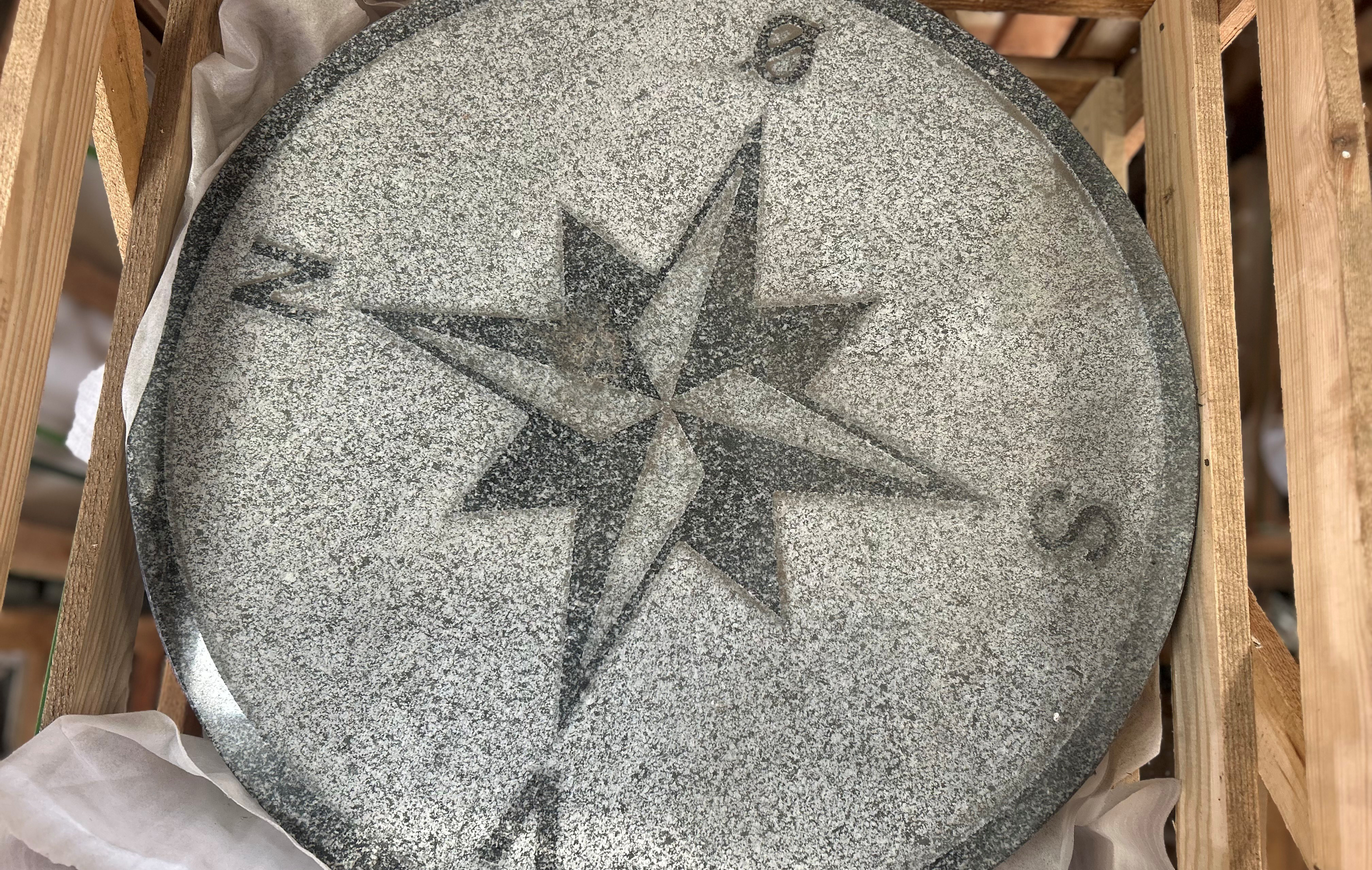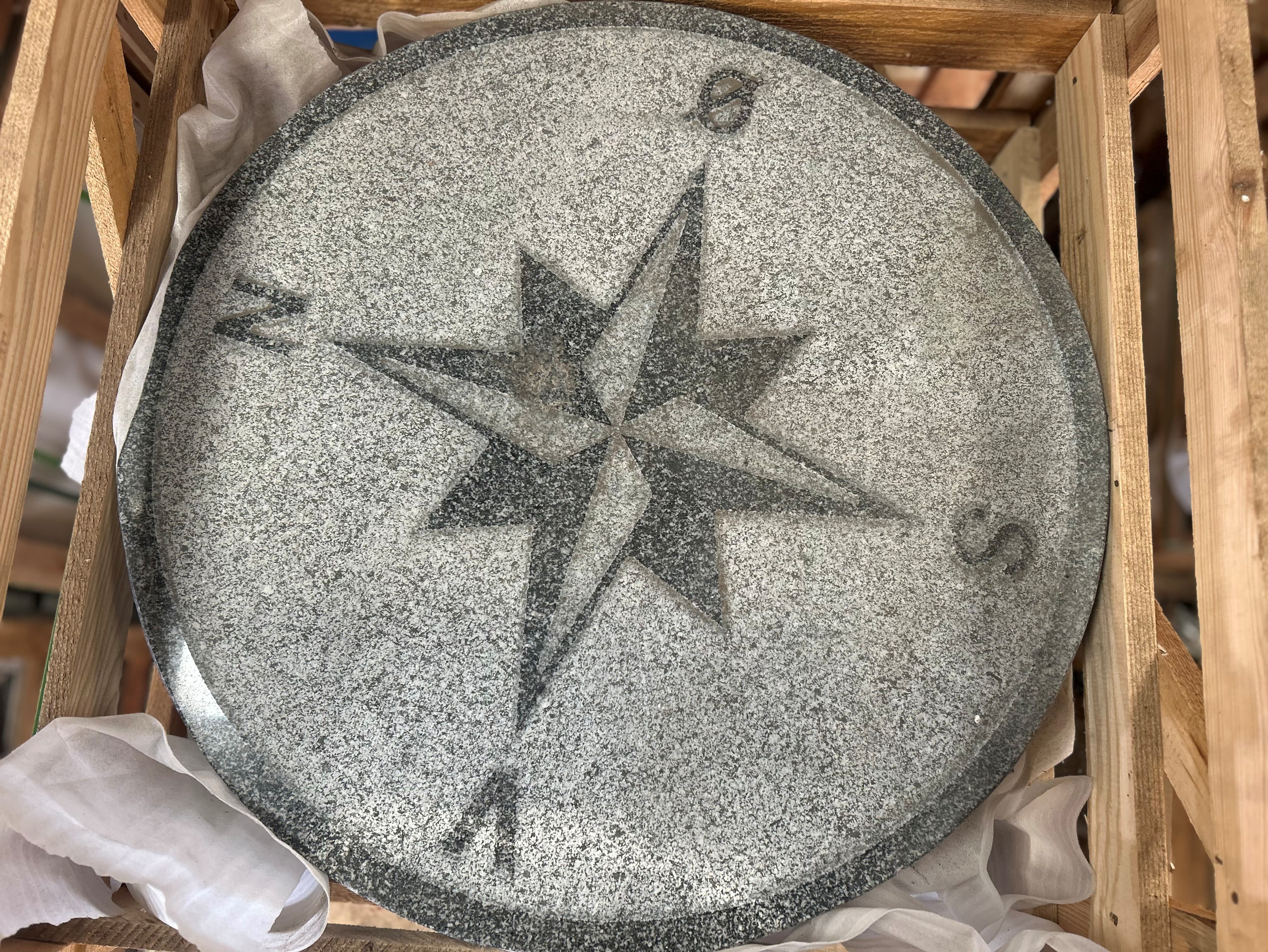 Vis de 4 verdenshjørner i din have eller i din øvrige belægning med denne yderst dekorative store kompassten. Produceret i gråsort granit med polerede bogstaver, stjerne og kant. Fås i forskellige størrelser, så de kan bruges som pynt i haven, eller som dækken over eventuelt et brønddæksel.