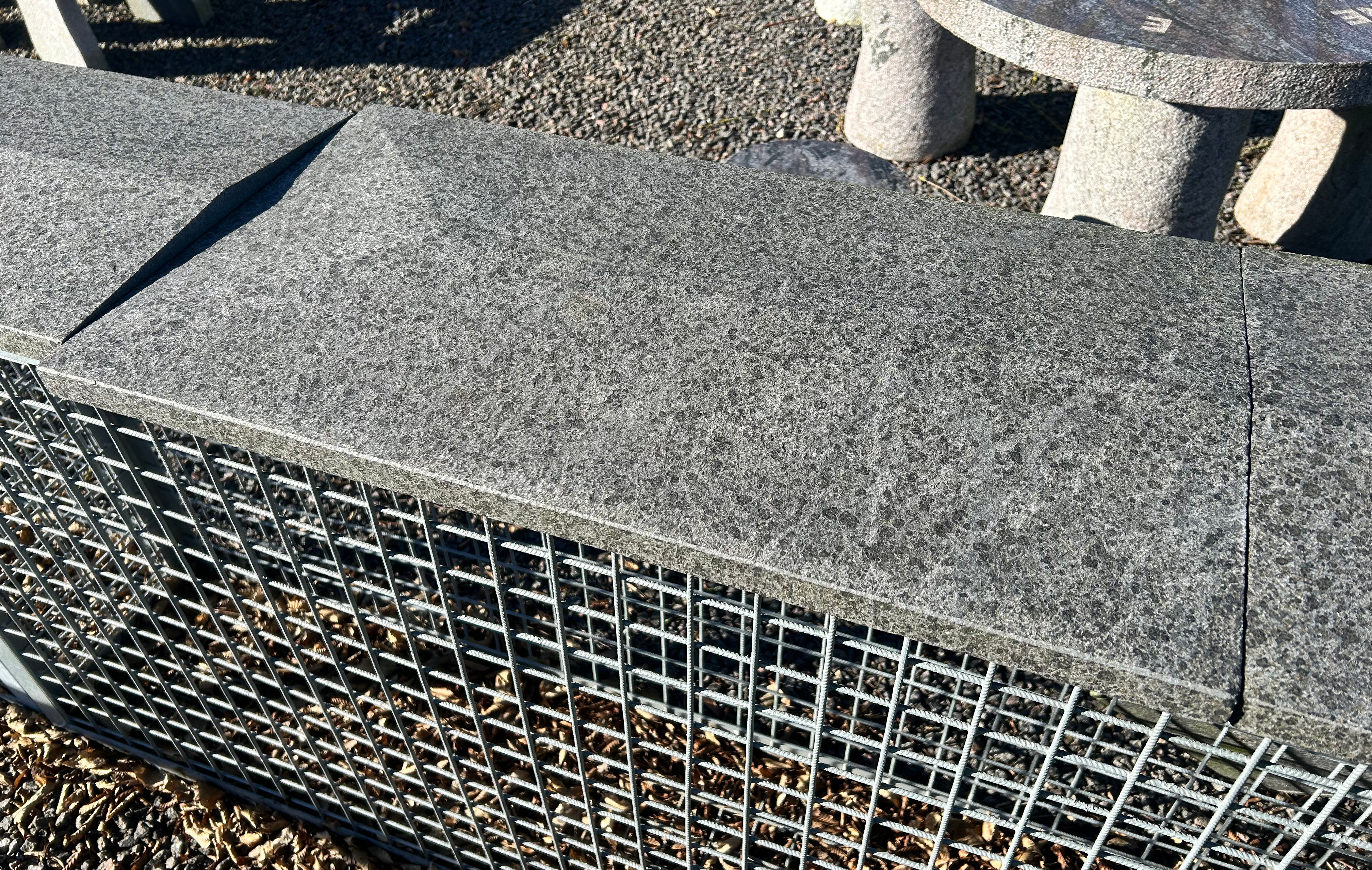 Murafdækning i sort basalt med jetbrændt overflade. Måler ca. 41 x 75 x 4,5 cm. Endestykke der kan kombineres med lige stykker. Inkl. vandnæse ca. 1 cm fra kanten.