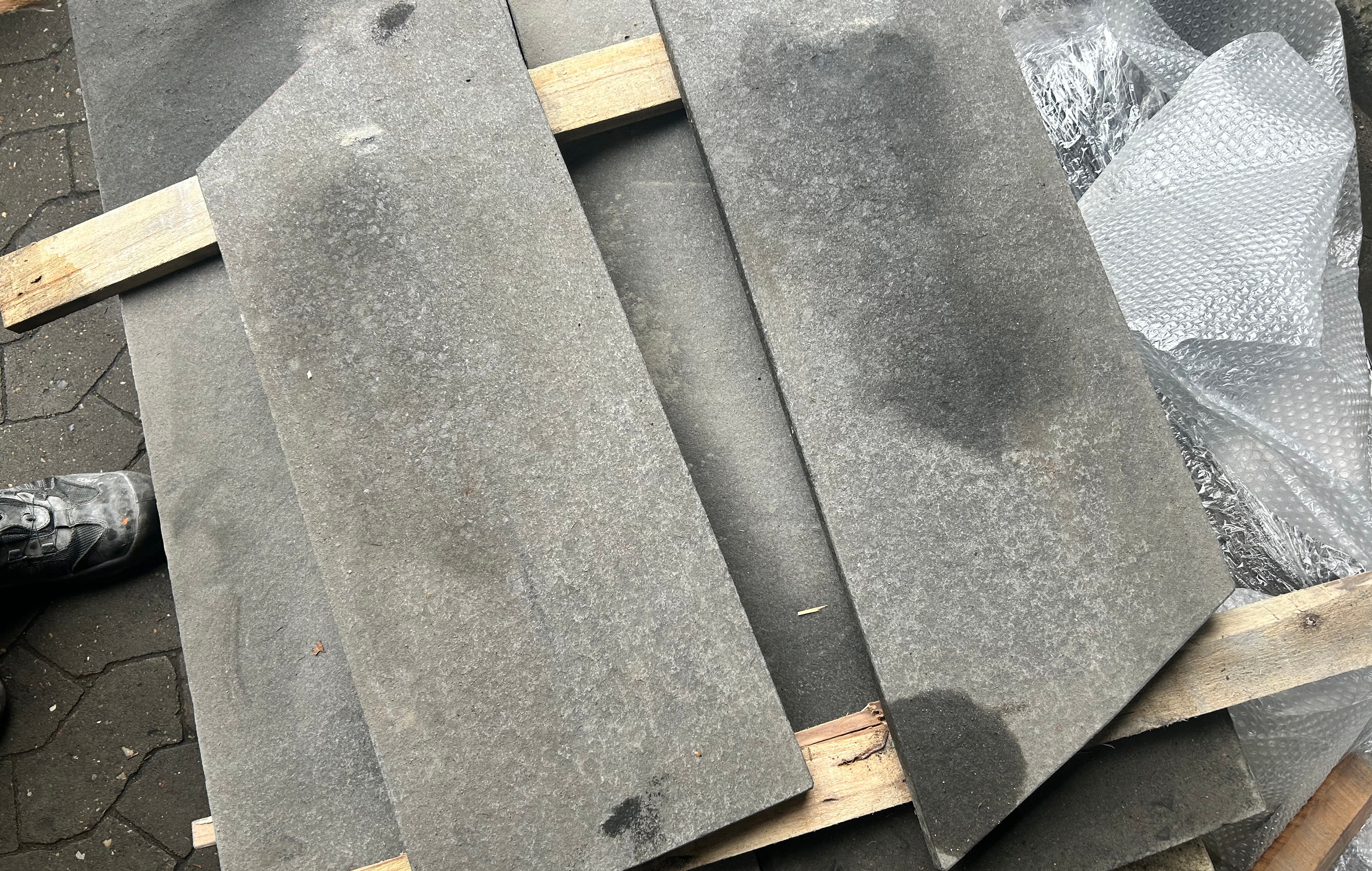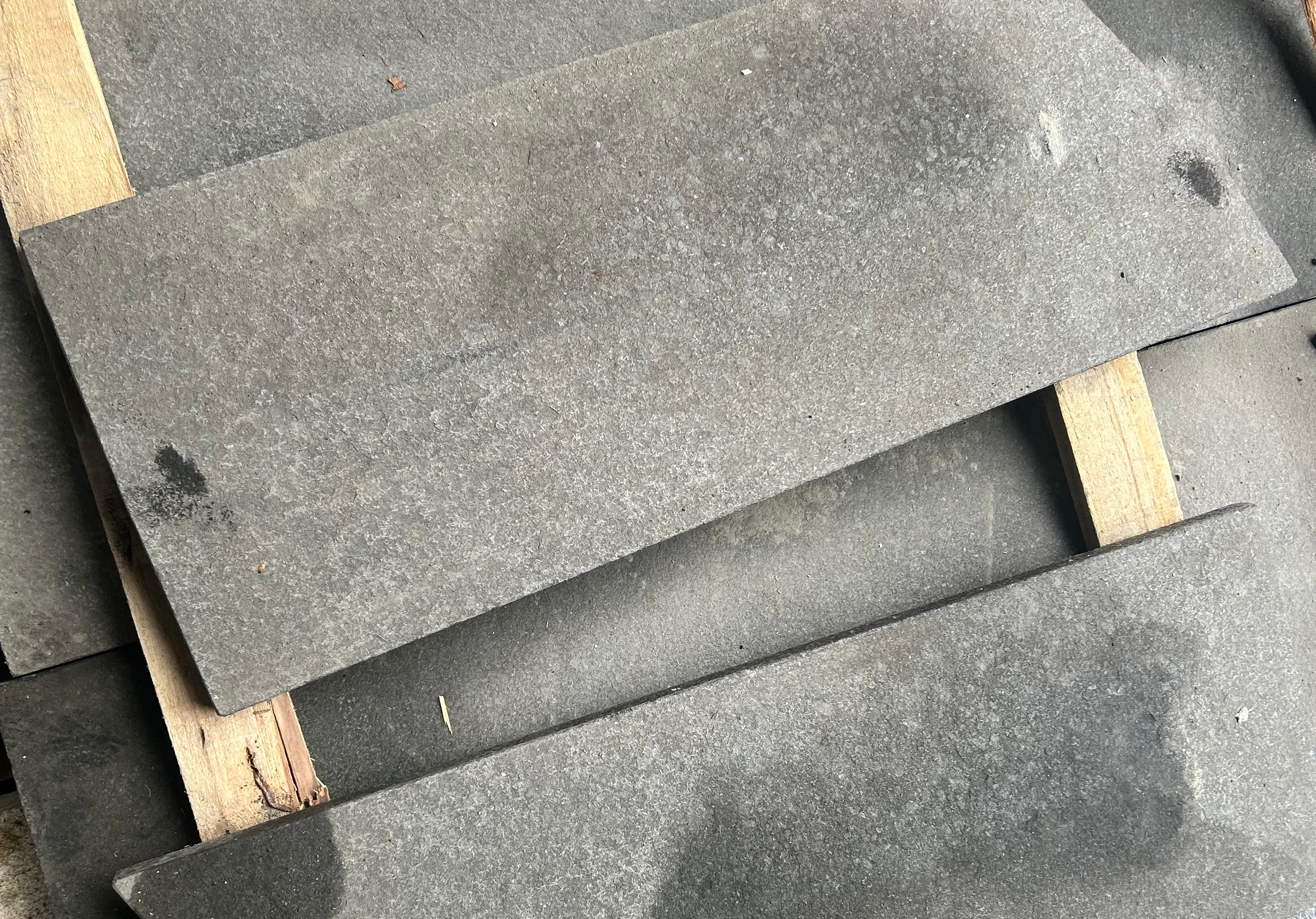 Murafdækning i sort basalt med jetbrændt overflade. Måler ca. 77/64 x 29 x 4,5 cm. Inkl. vandnæse ca. 1 cm fra kanten.