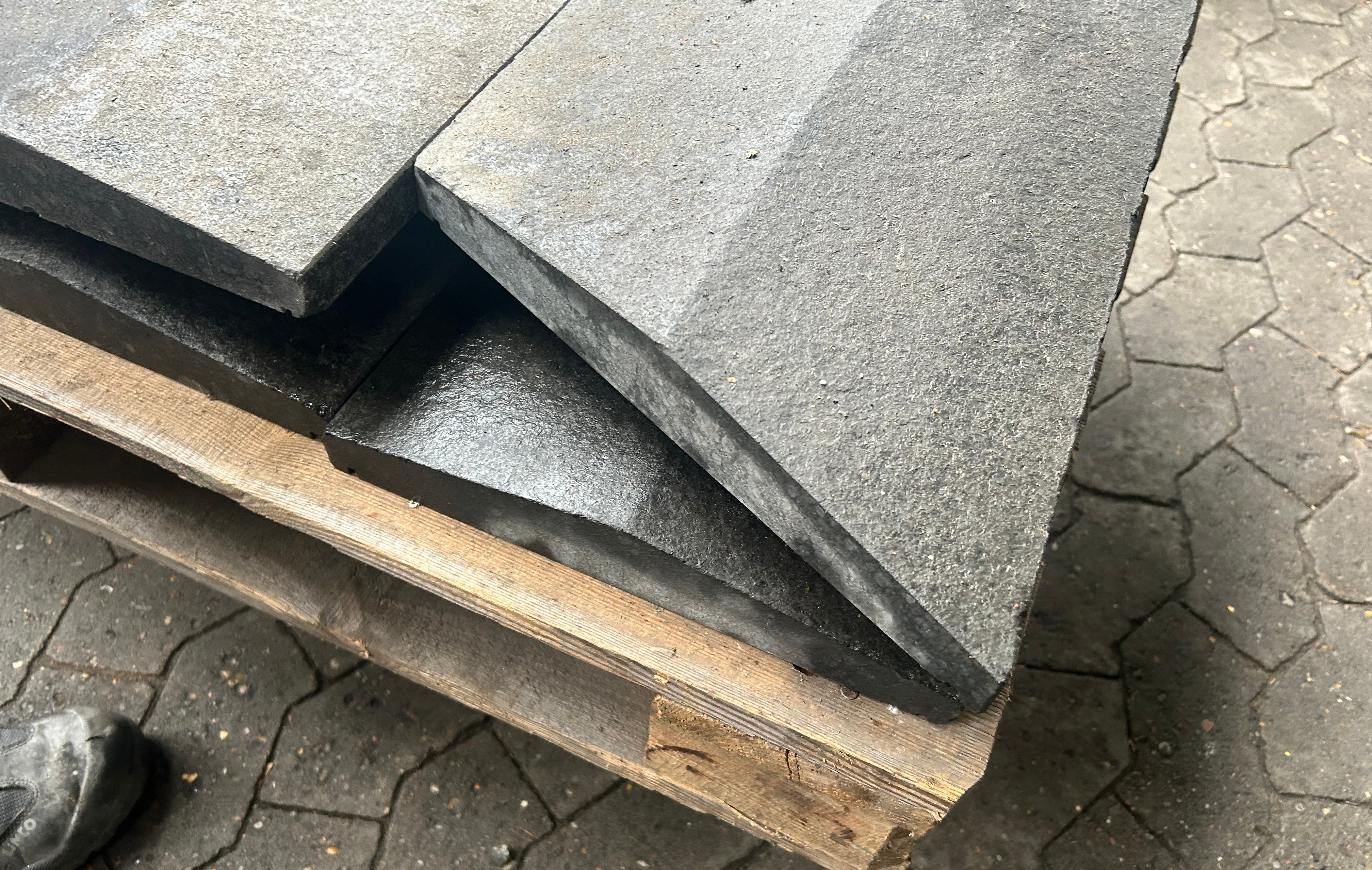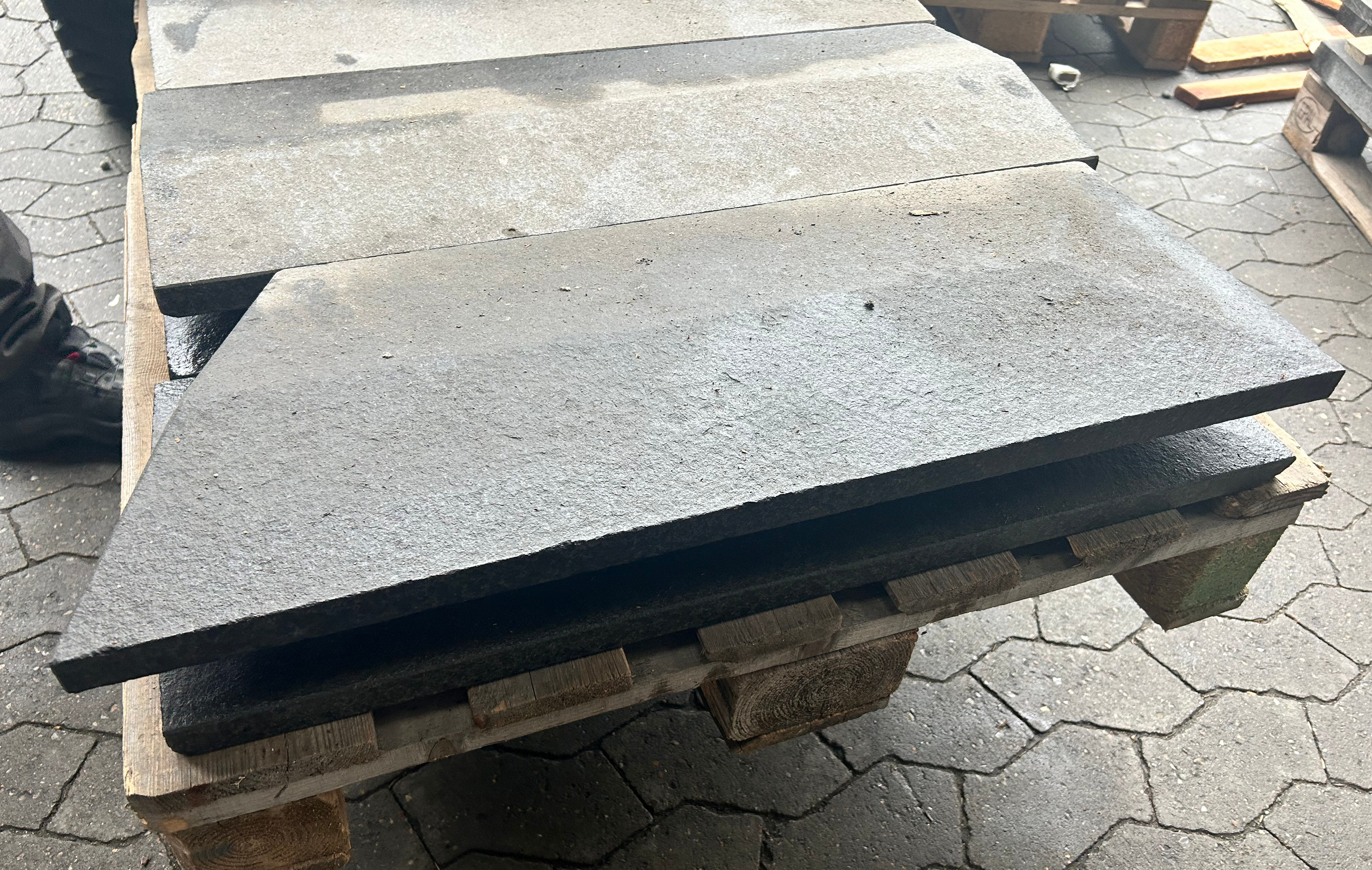 Murafdækning i sort basalt med brændt overflade. Måler ca. 79/66 x 29 x 4,5 cm. Inkl. vandnæse ca. 1 cm fra kanten.
