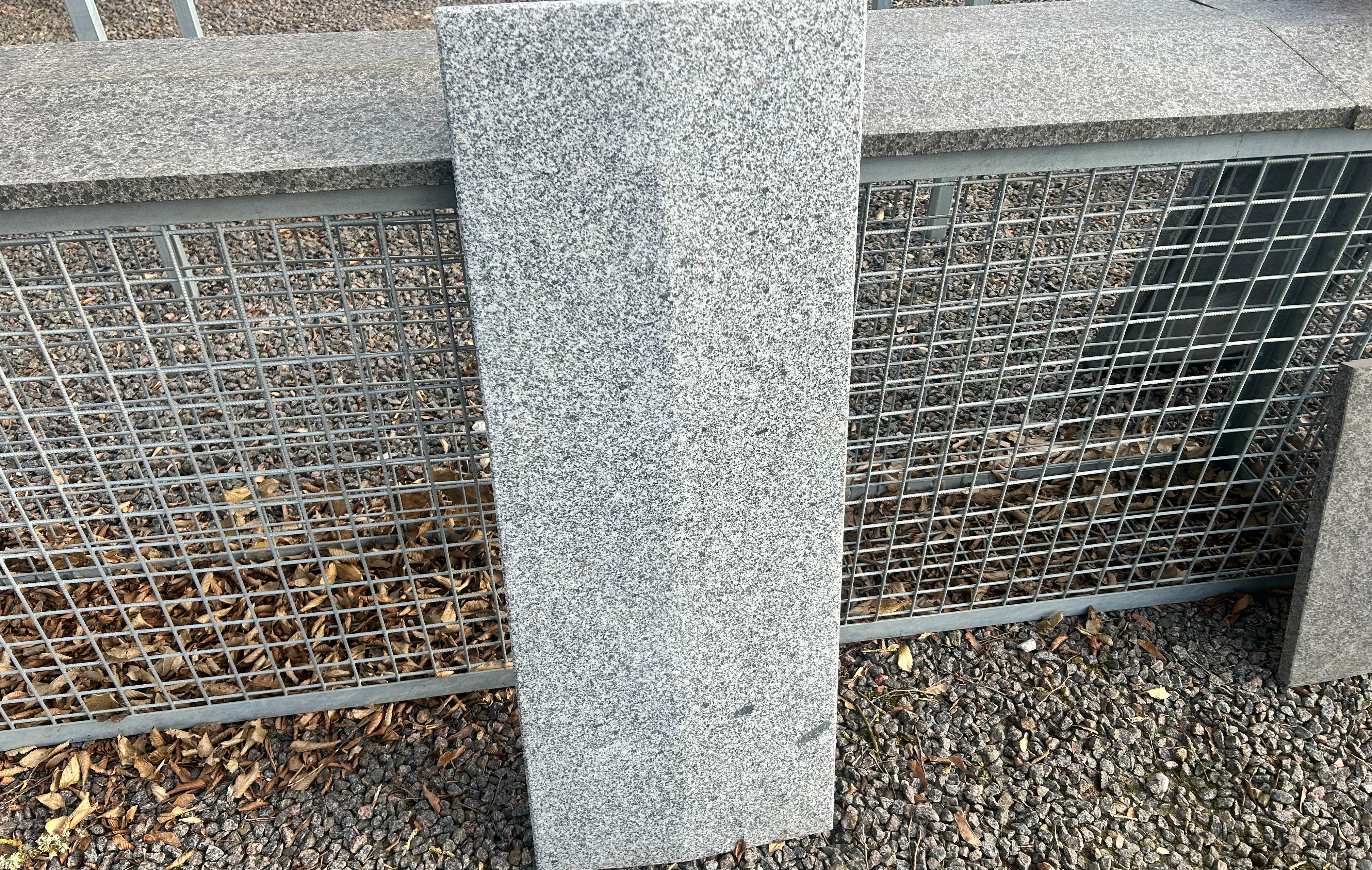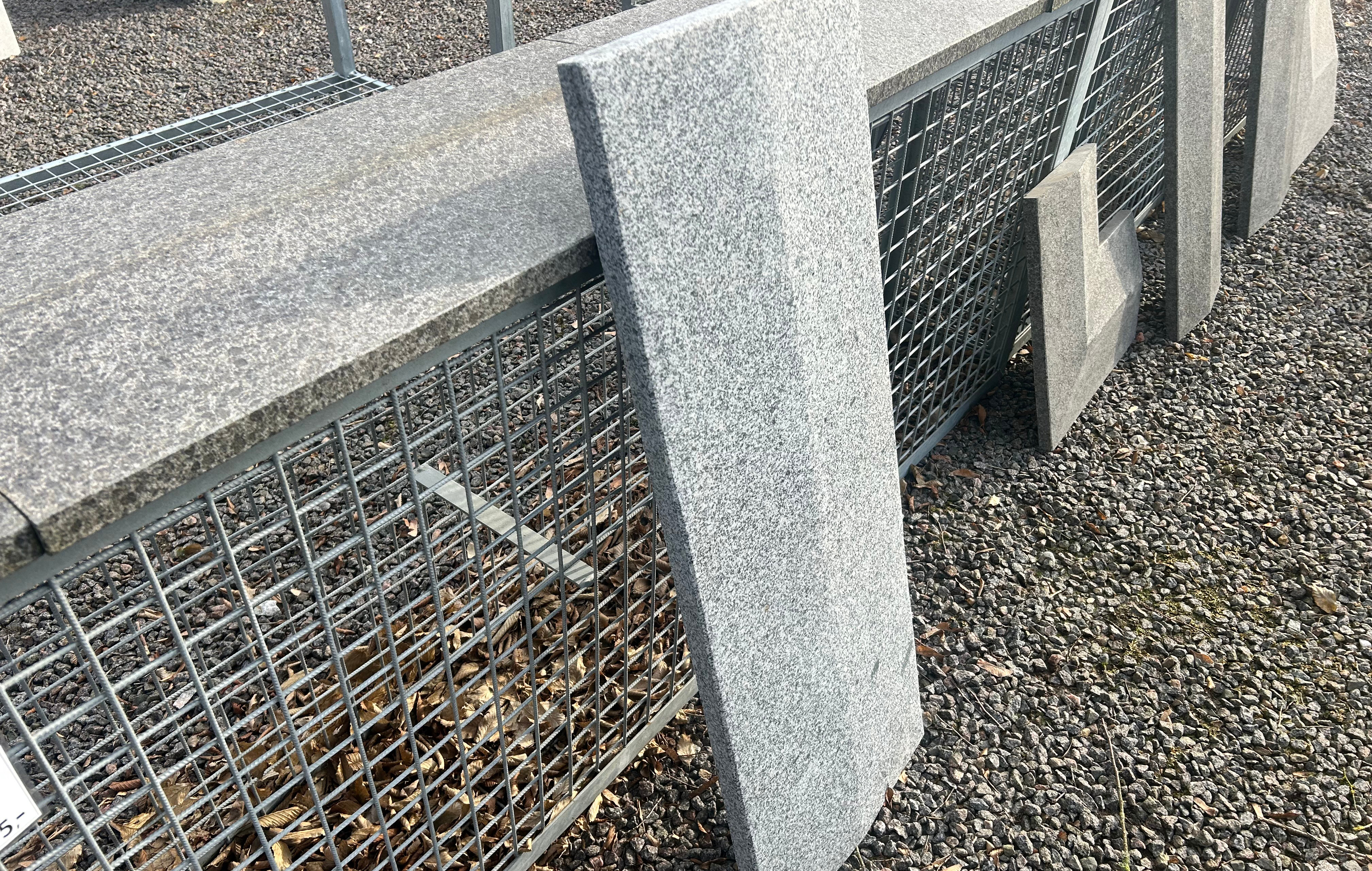 Murafdækning i lysgrå poleret/matslebet granit. Måler ca. 100 x 38 x 5 cm. Inkl. vandnæse ca. 2 cm fra kanten. Hver stykke har slebne ender, som kan bruges som endestykke.