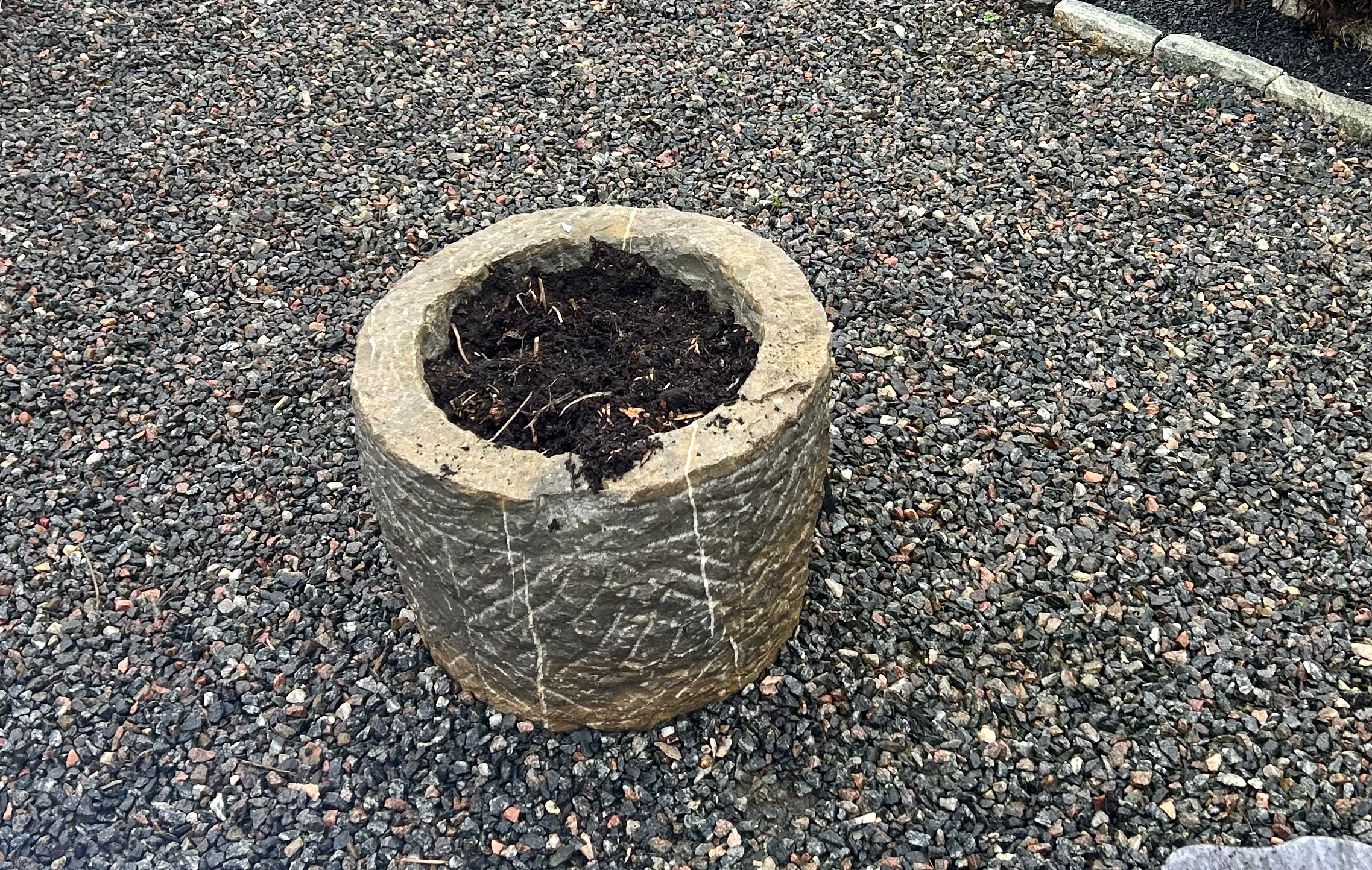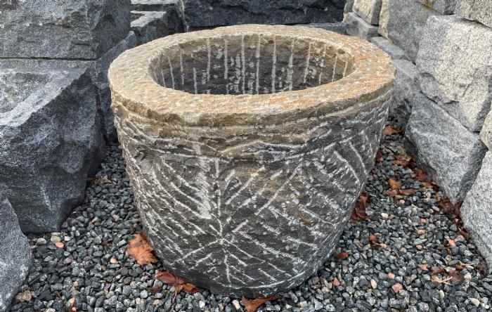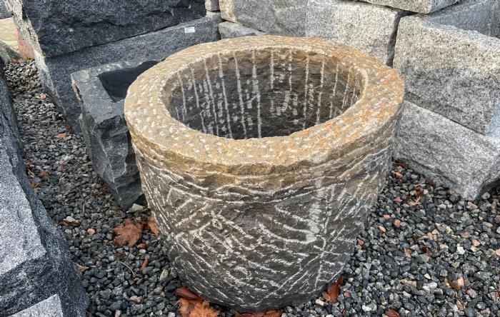 Rundt antikt trug, lavet i granit med flotte detaljer på de kløvede sider, og et varierende farvespil. Der ses naturlige åreløb i truget, hvilket gør truget unikt.