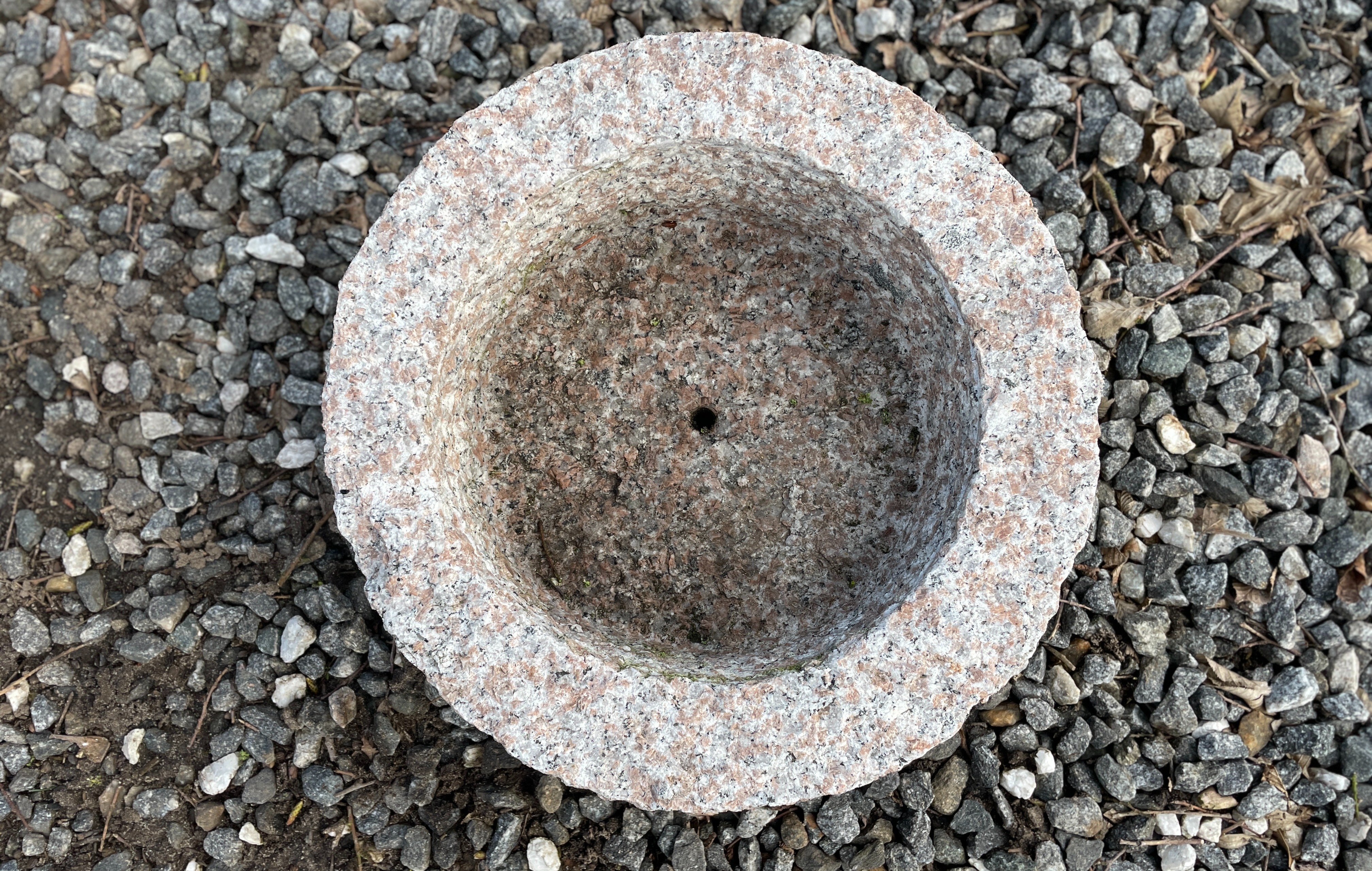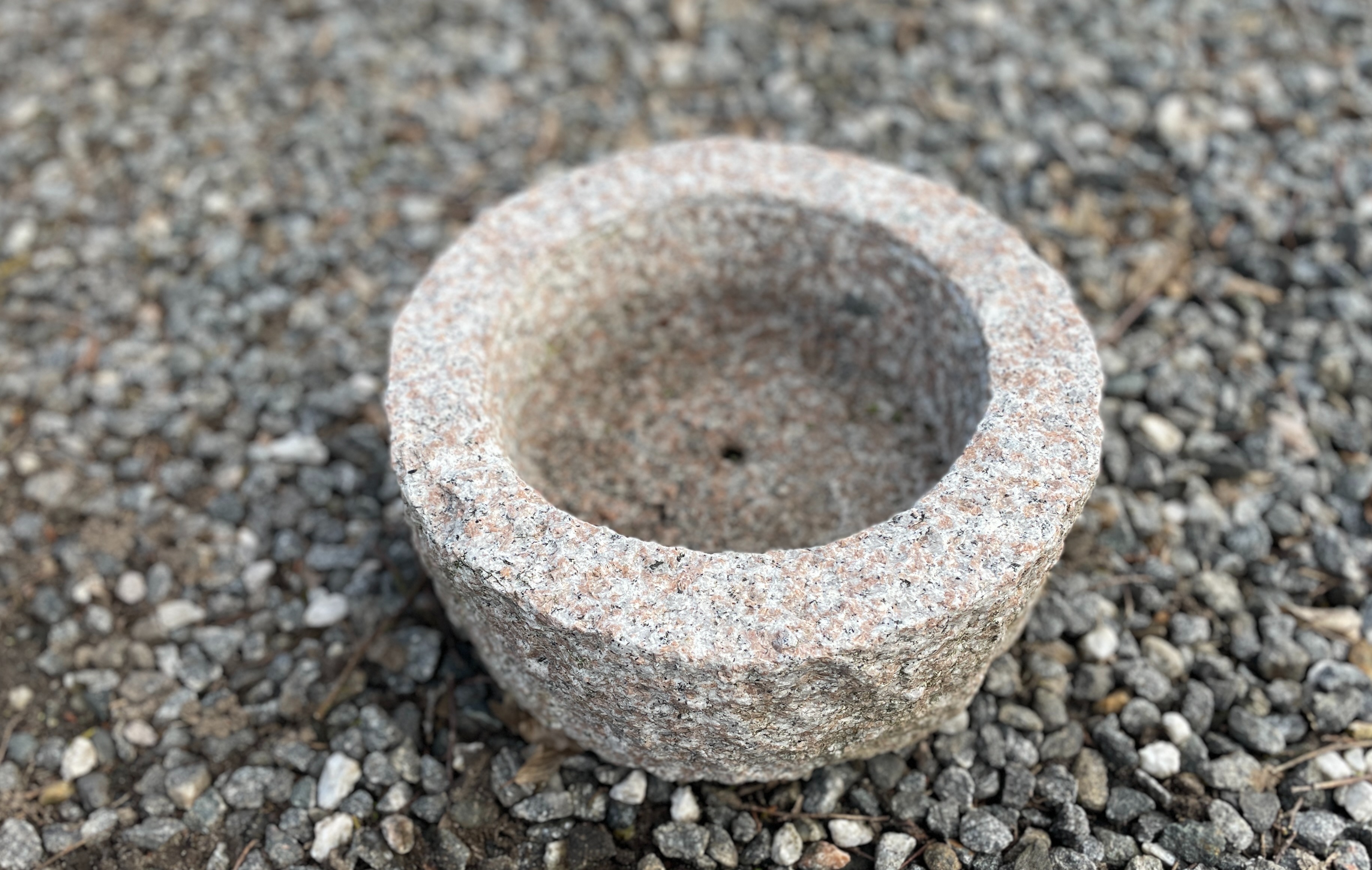 Lille plantekumme lavet i rosa granit med mindre drænhul