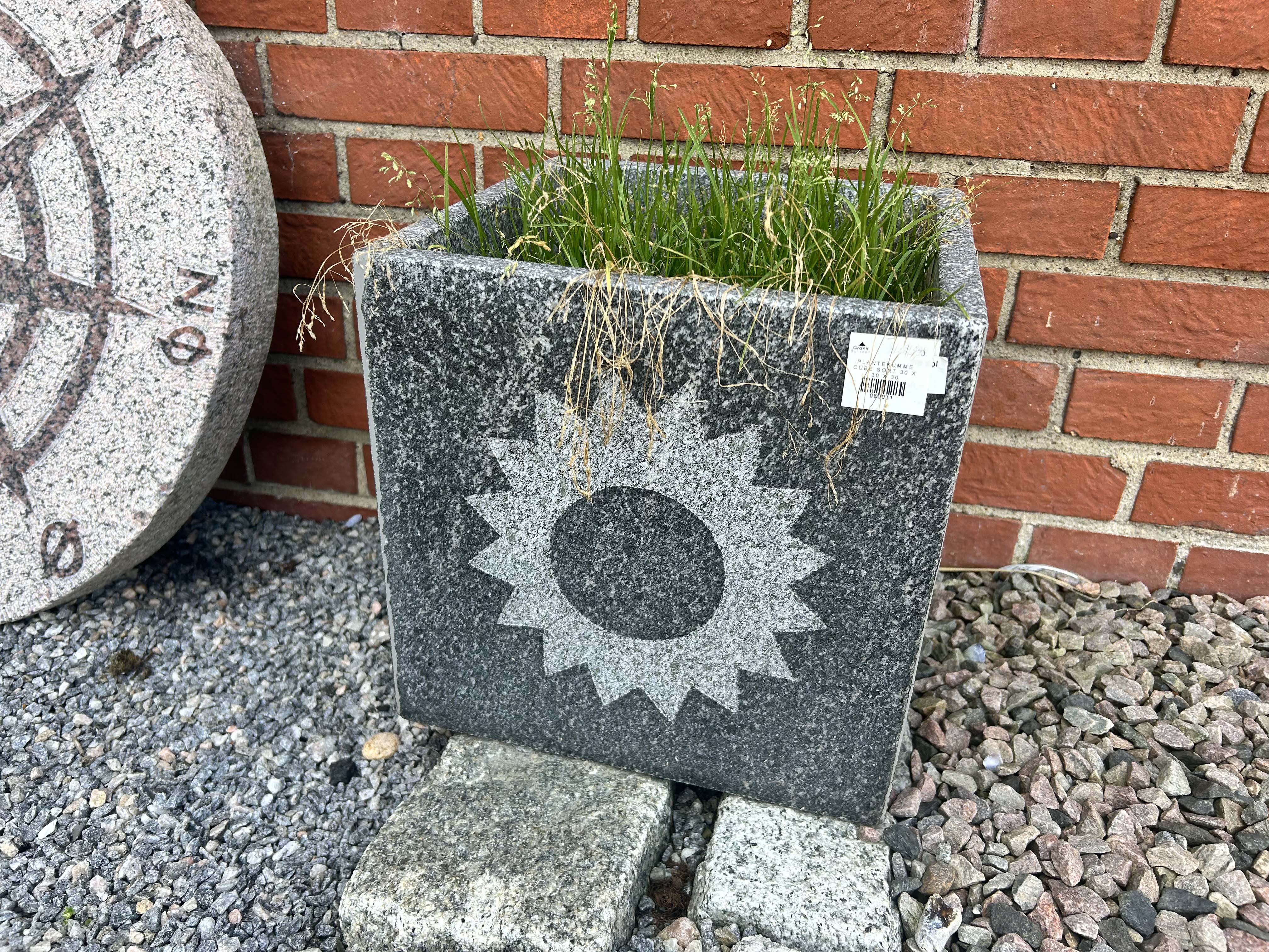 Plantekumme i gråsort poleret granit med sol motiv sandblæst i kummen så det fremstår lysere. Der er drænhuller til vand i bunden af kummen.