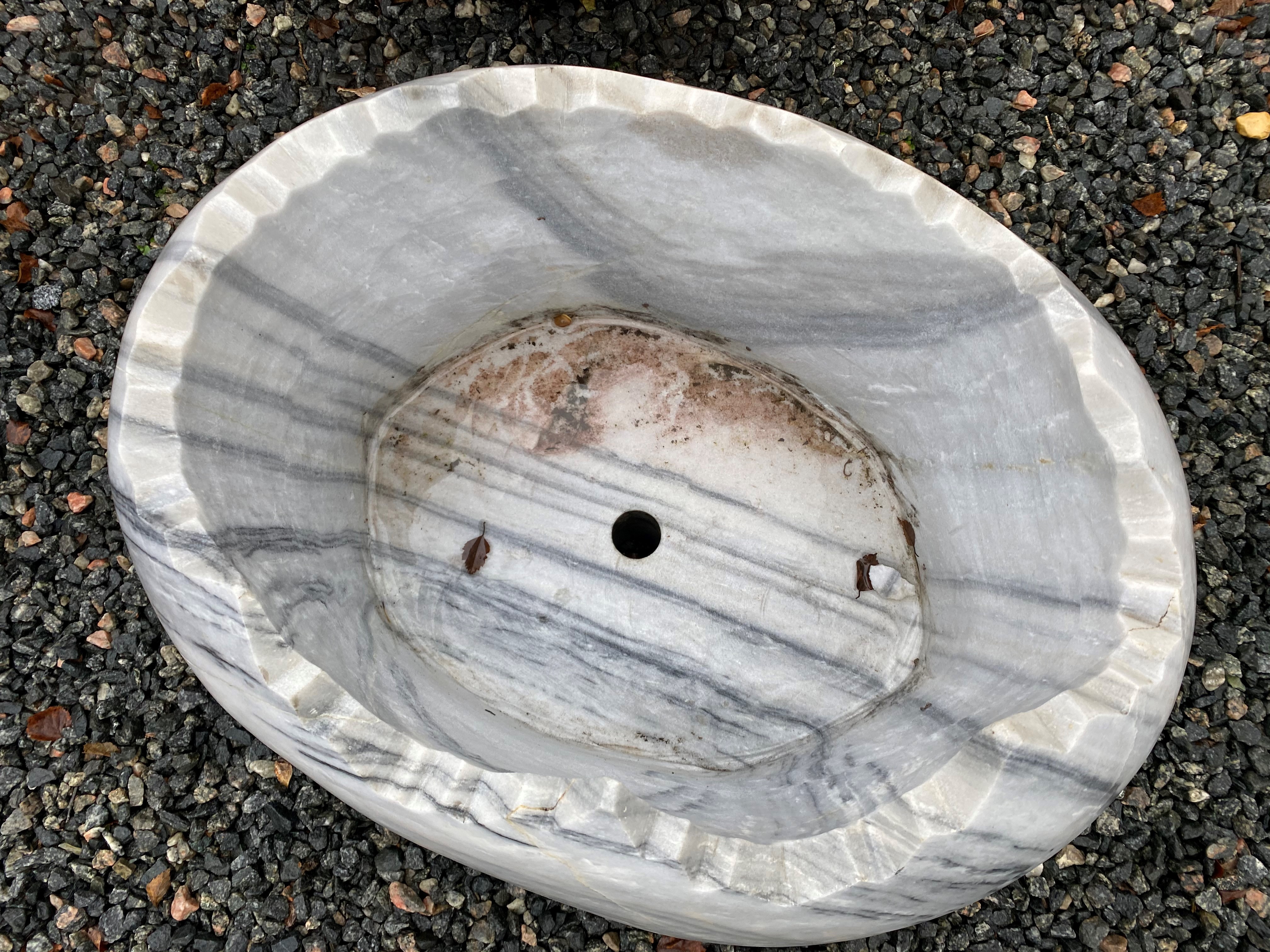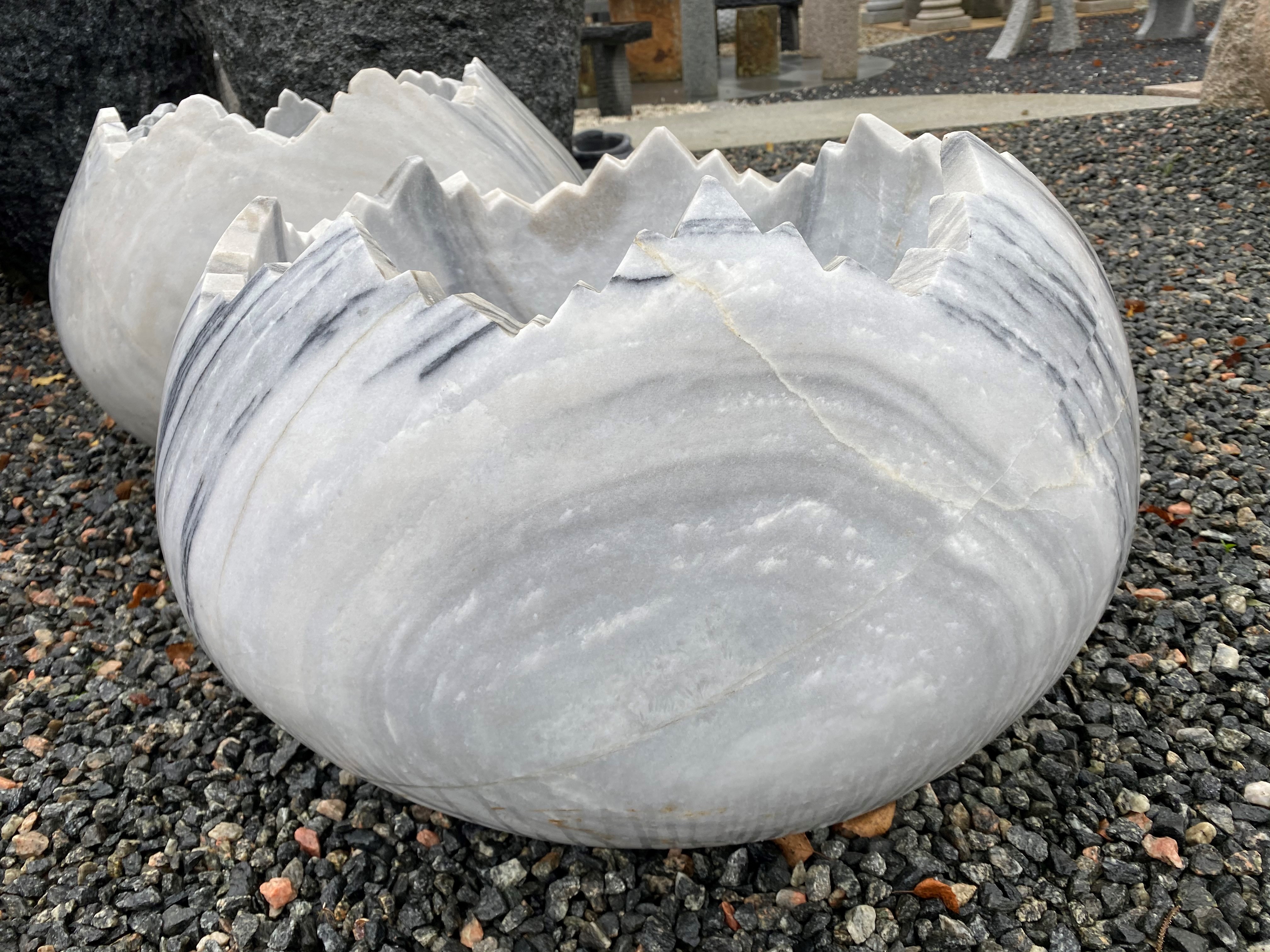 Ødelagt æggeskal til beplantning af blomster og planter. Æggeskallen er lavet i hvid/grå marmor og har tydelige og naturlige striber.