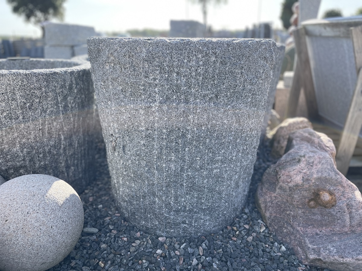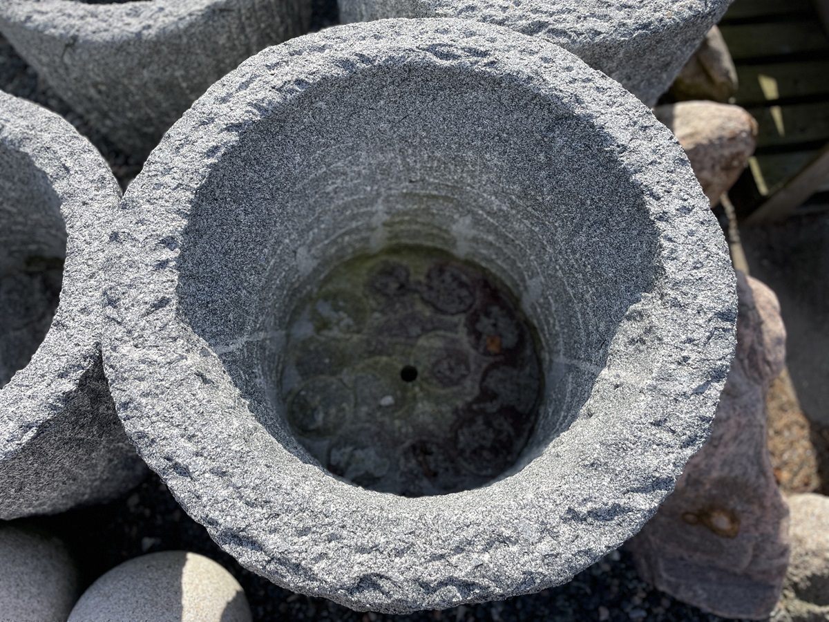 Trug i konisk form, med råkløvede sider lavet i gråsort granit.