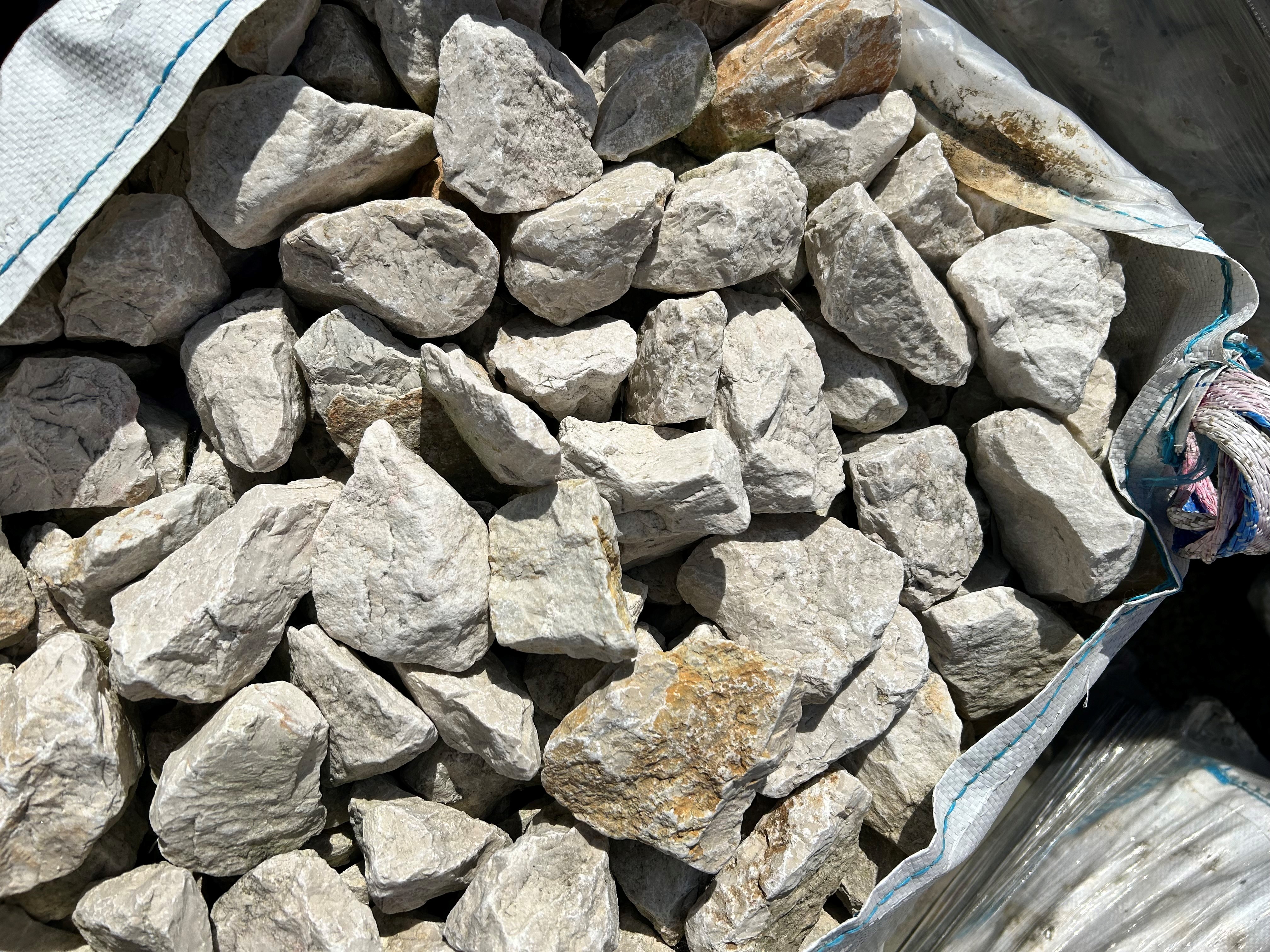 250 kilo natursten i lys beige italiensk sten. Små sprængstykker til dekoration i havebedet eller måske som gabionsfyld.