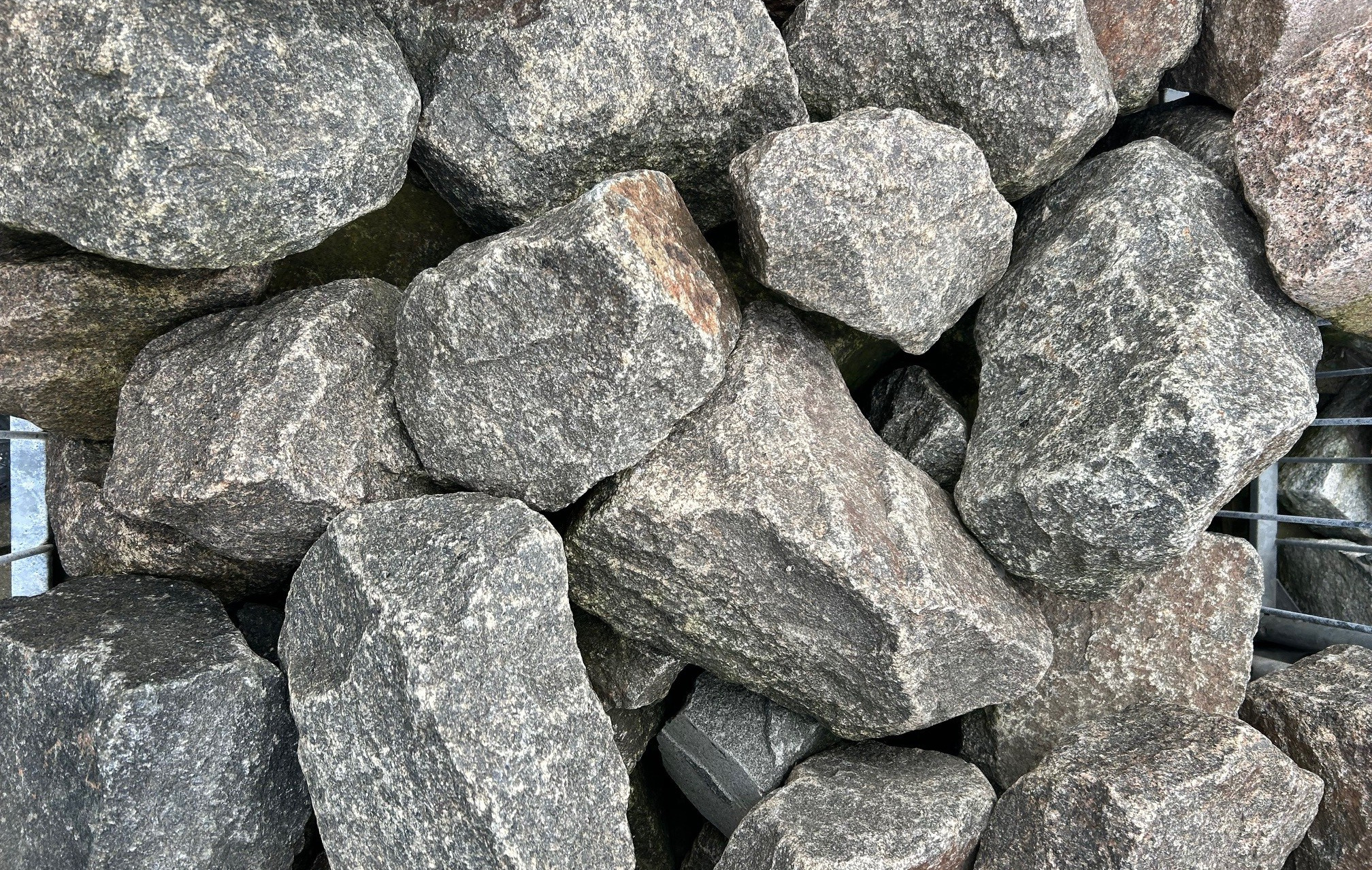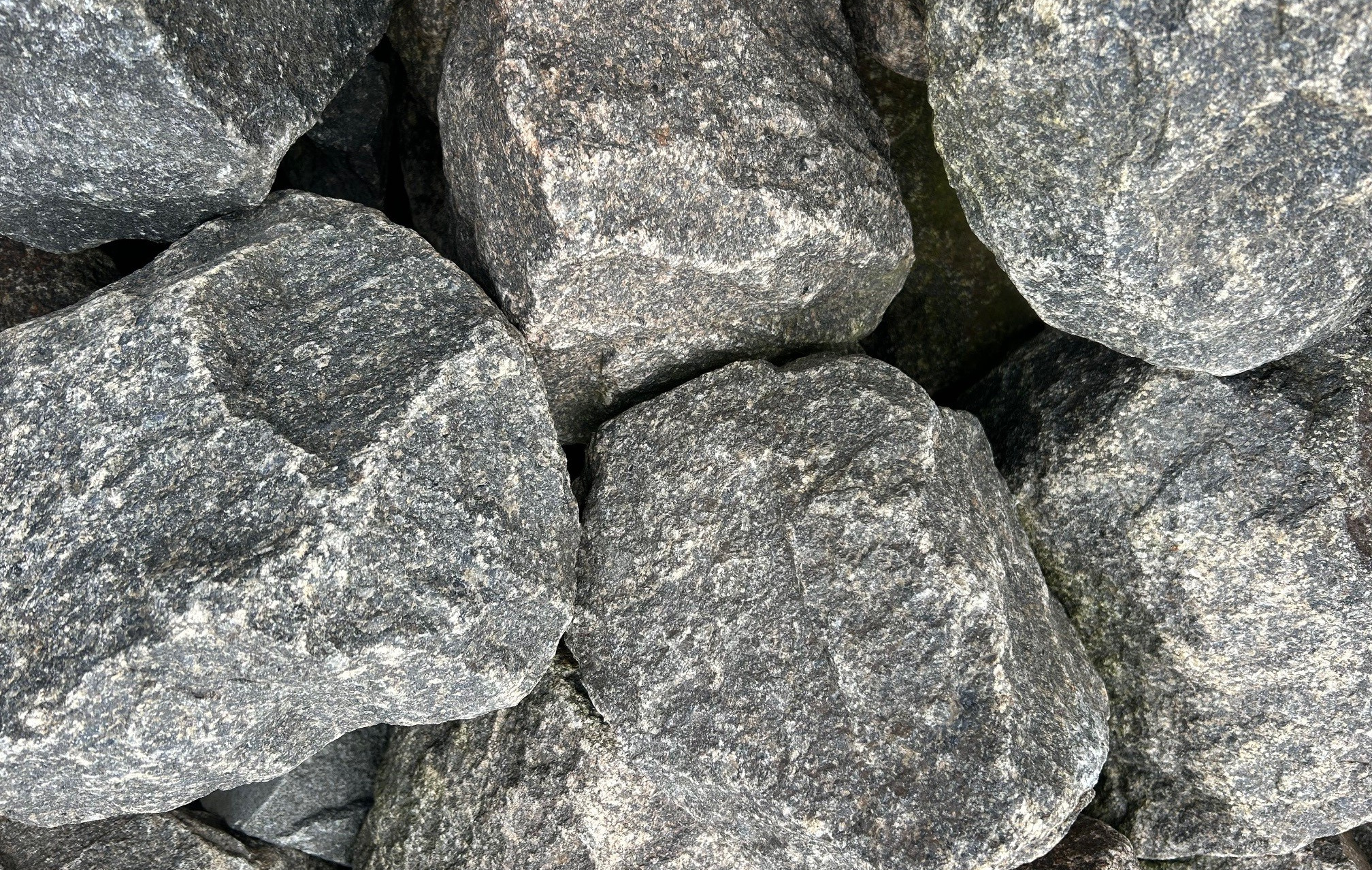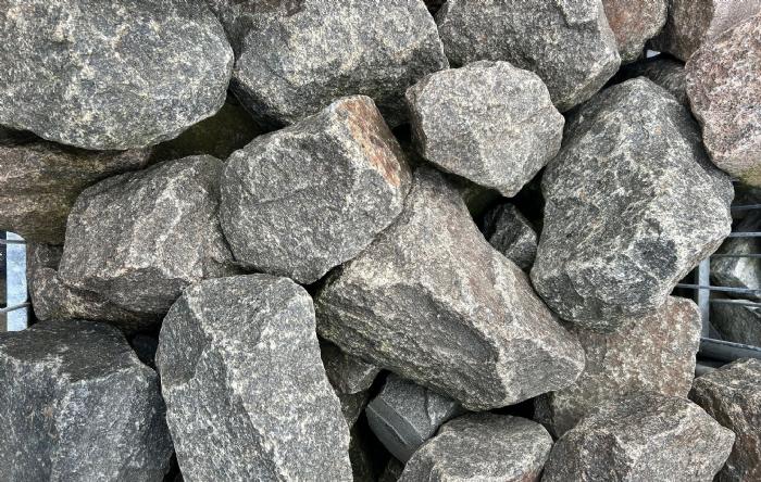 Små sprængstykker i grønlig/grå granit med naturlig overflade. Sprængstykkerne varierer i størrelse og det er derfor vilkårligt hvilken sten man vil modtage ved bestilling.