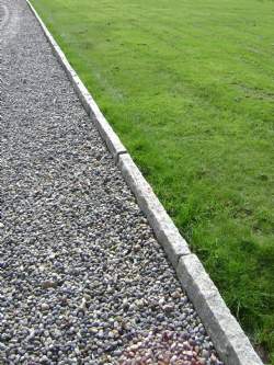 Granit kantsten produceret i gråmeleret granit med kløvet overflade. En stabil kantsætning ved afgrænsning af for eksempel havebedet, grusgangen eller op til græsplænen.