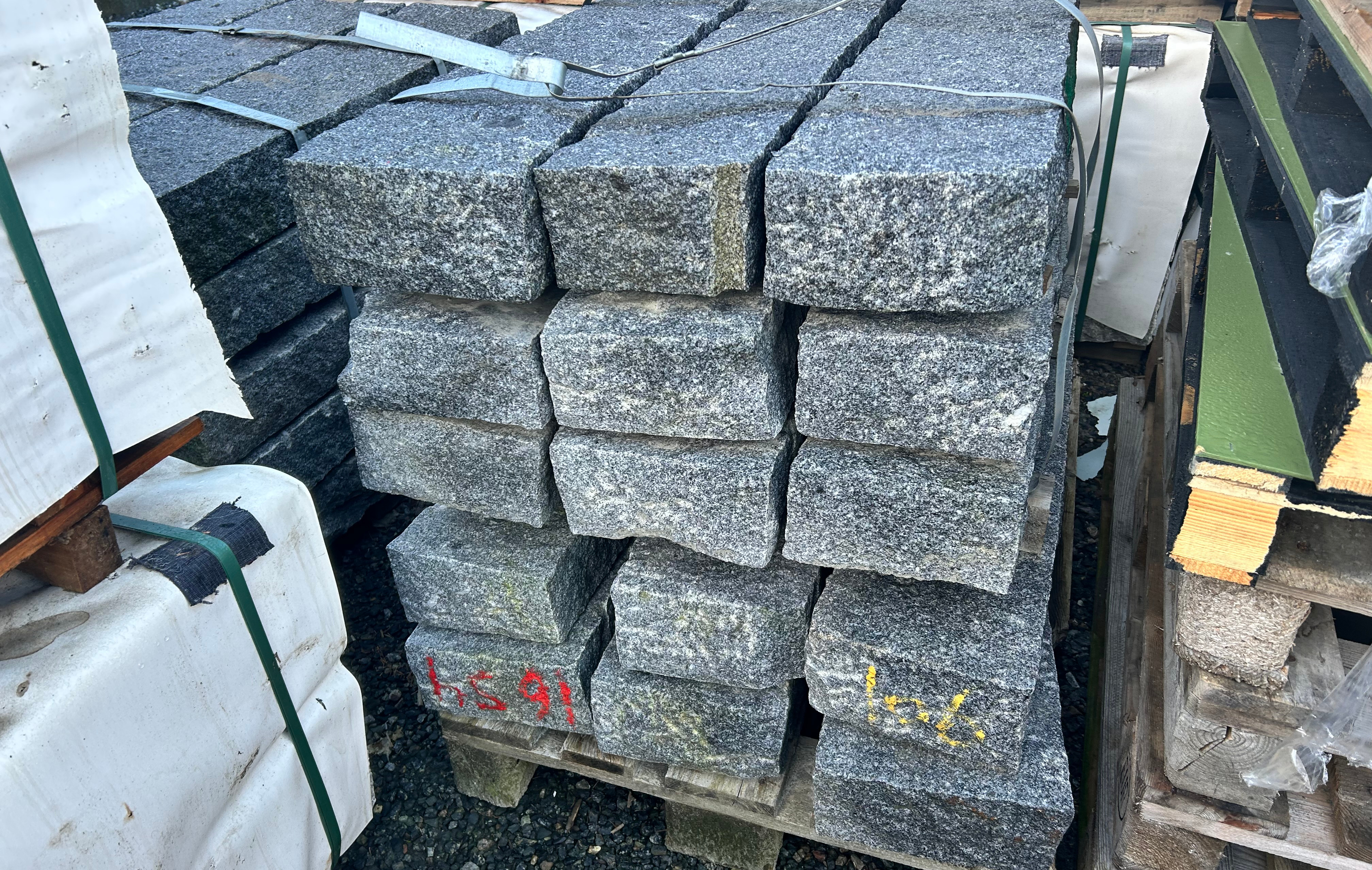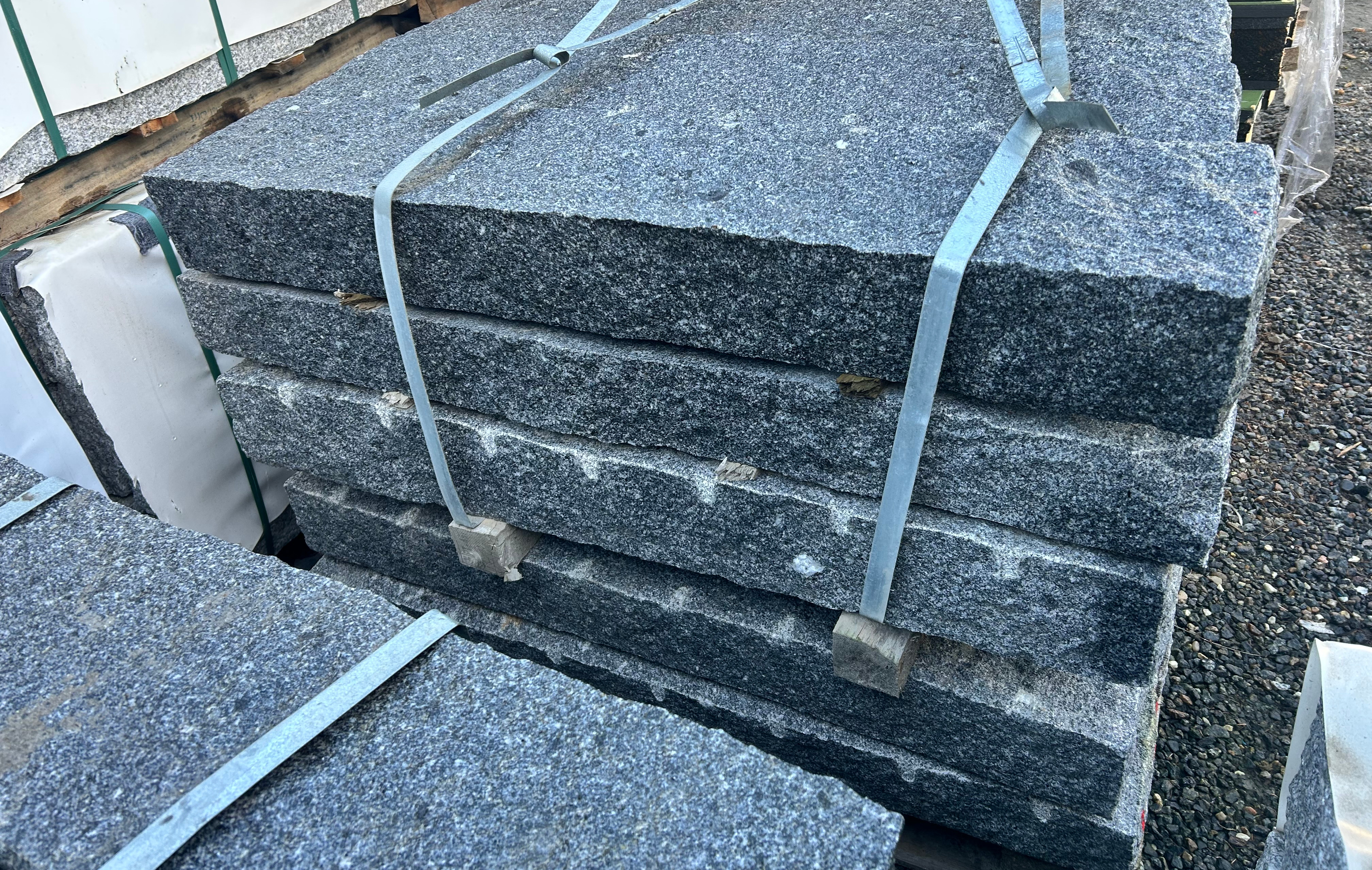 Bunden på kantstenene, der er beregnet til nedgravning, har grovere struktur end top og front.