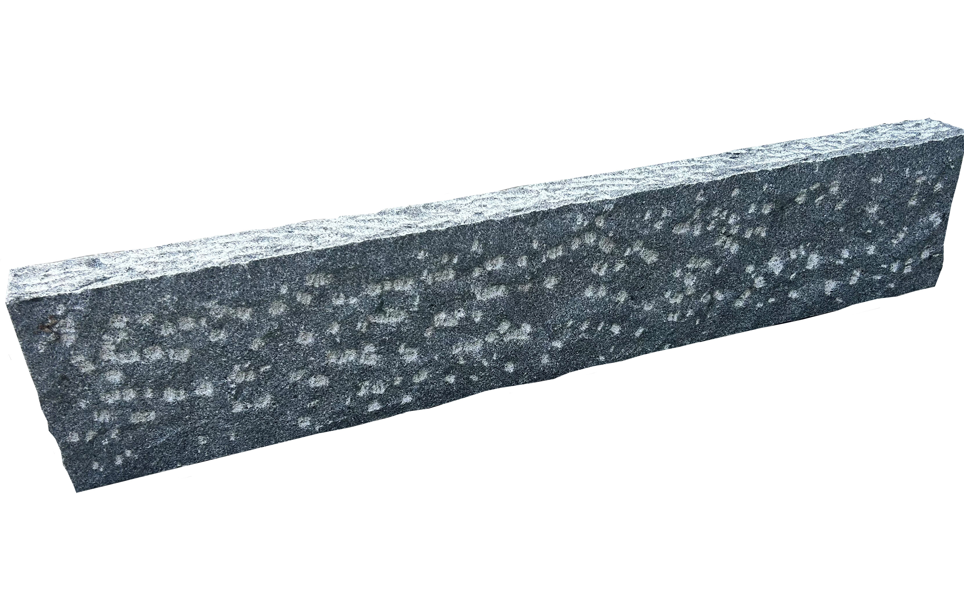 Granit kantsten i mørkegrå granit med kløvet overflade. Kantsten anvendes til mange forskellige formål - blandt andet areal adskillelse. Kant langs med grus eller som små trappetrin.