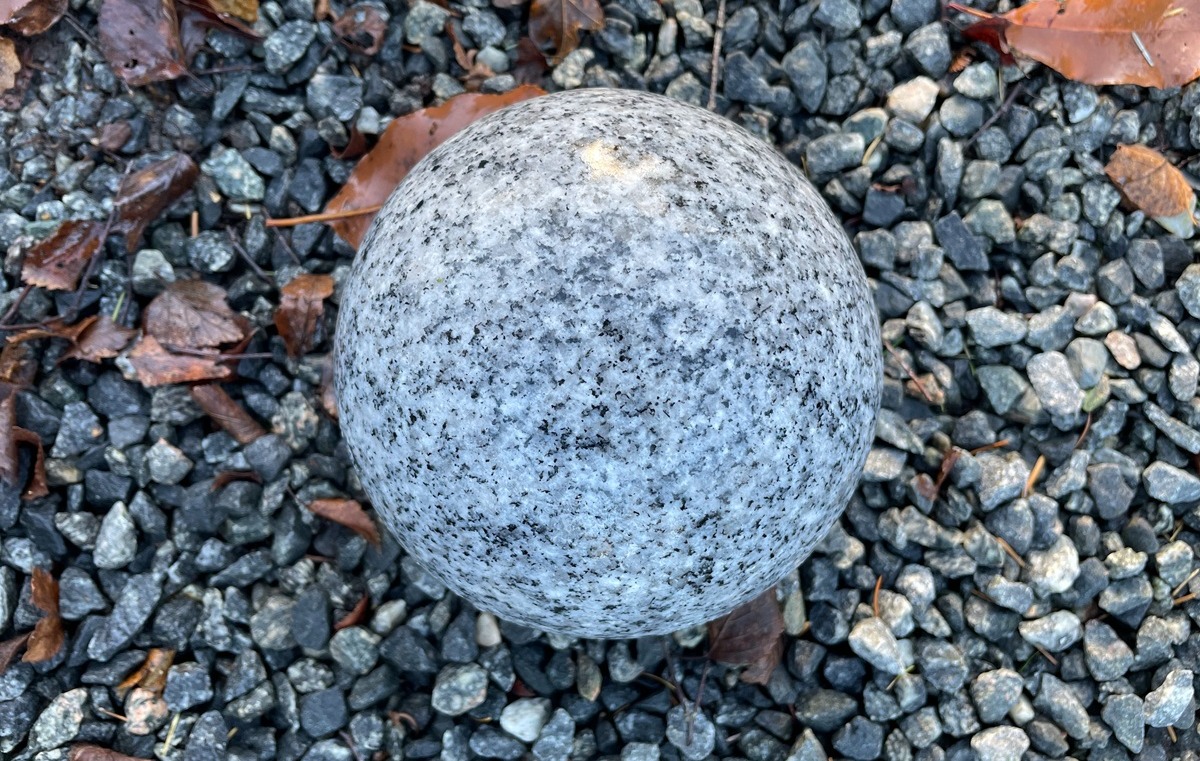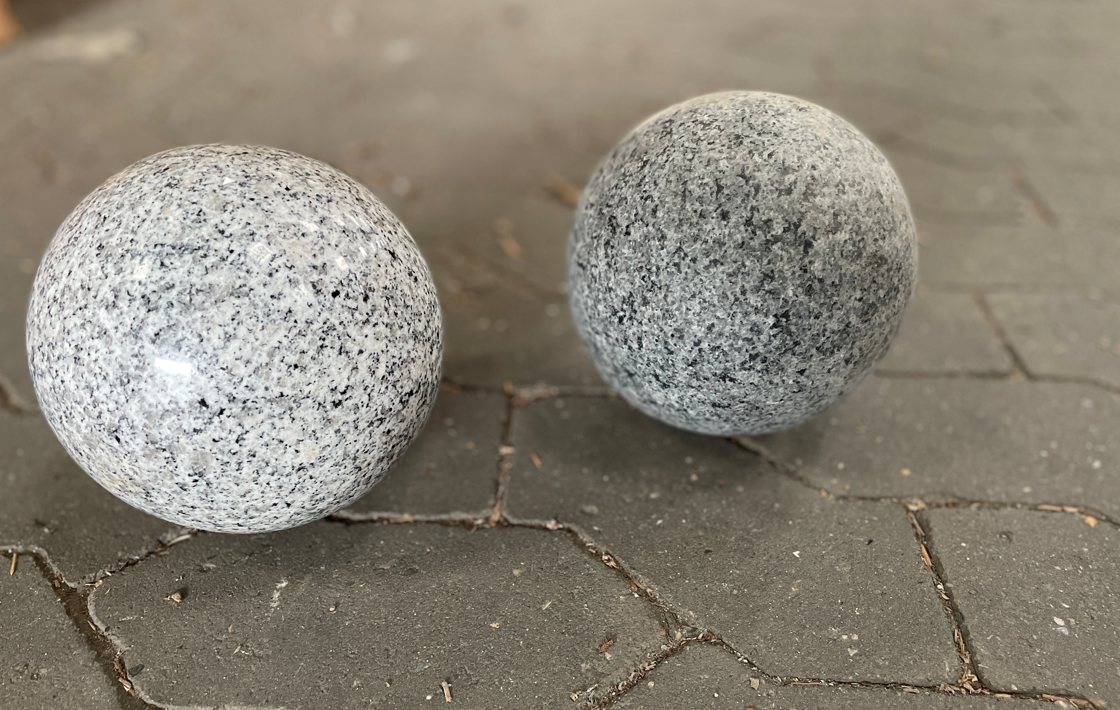 Granit kugle lavet i gråsort eller lysegrå granit. Kuglerne har en poleret overflade som frembringer granittens farvespil.
