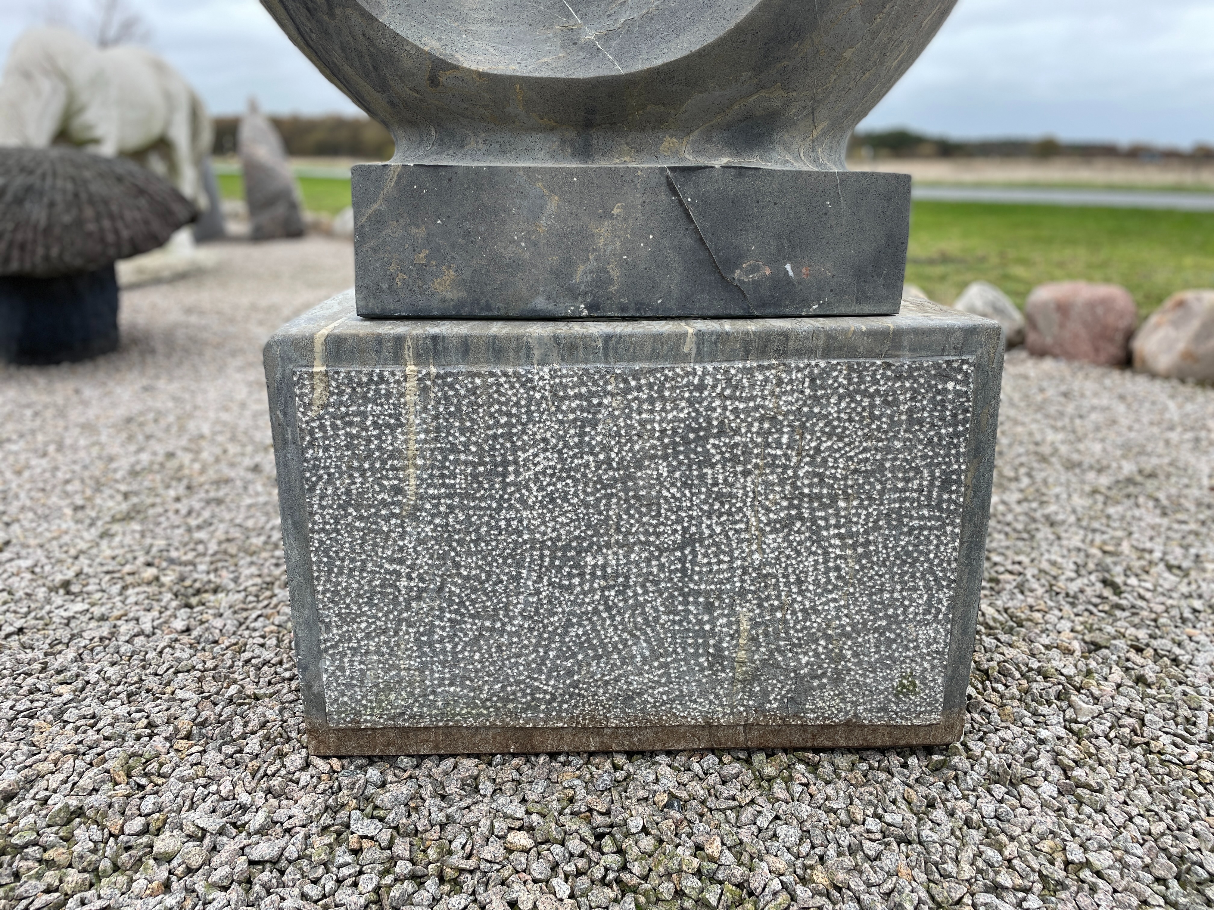 Æggeskulptur lavet i gråsort natursten. Skulpturen har et gennemgående hul, og er formet som et abstrakt og åbent æg. Den mørke sten har flotte lysere åretegninger og giver et look af patina.