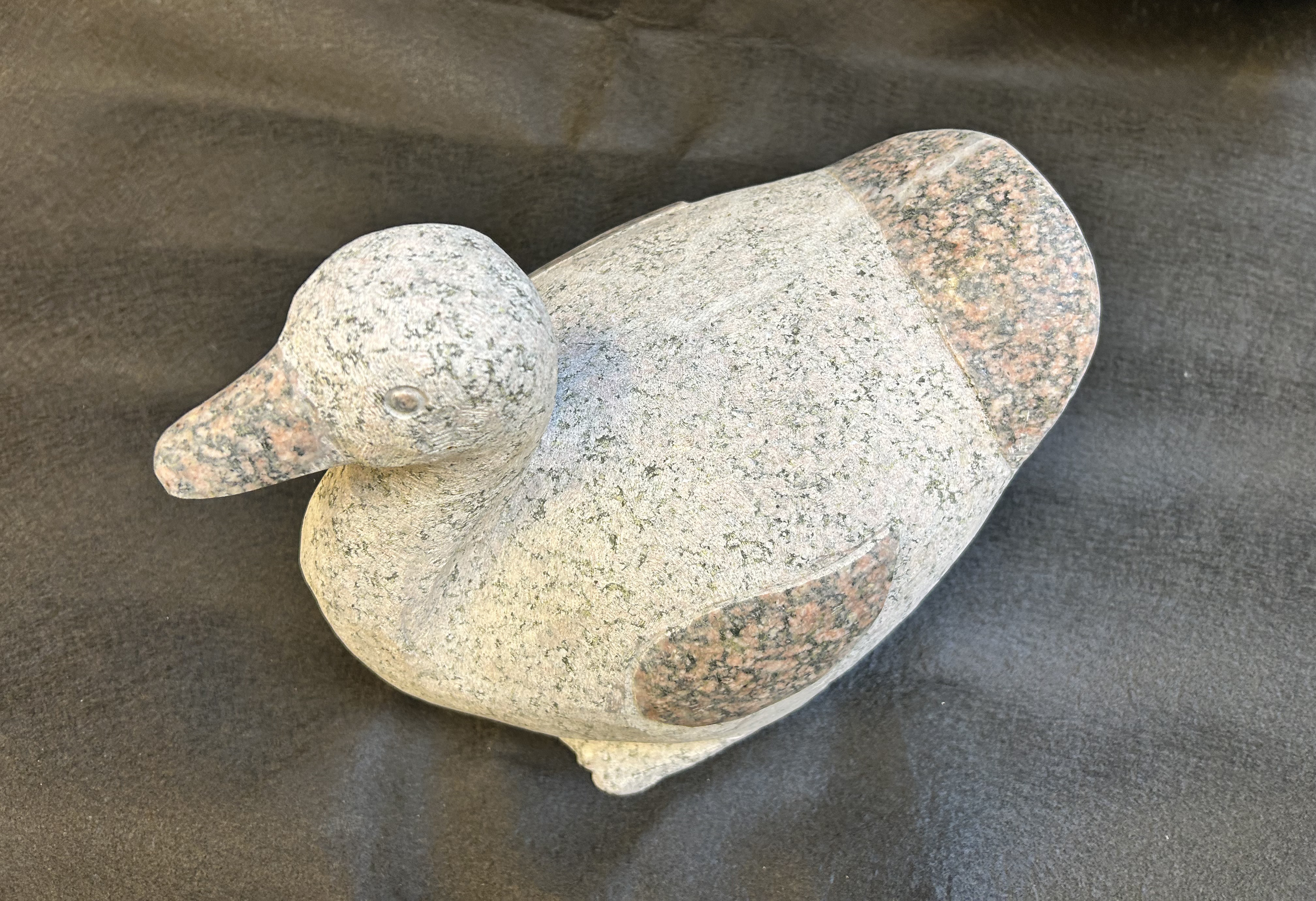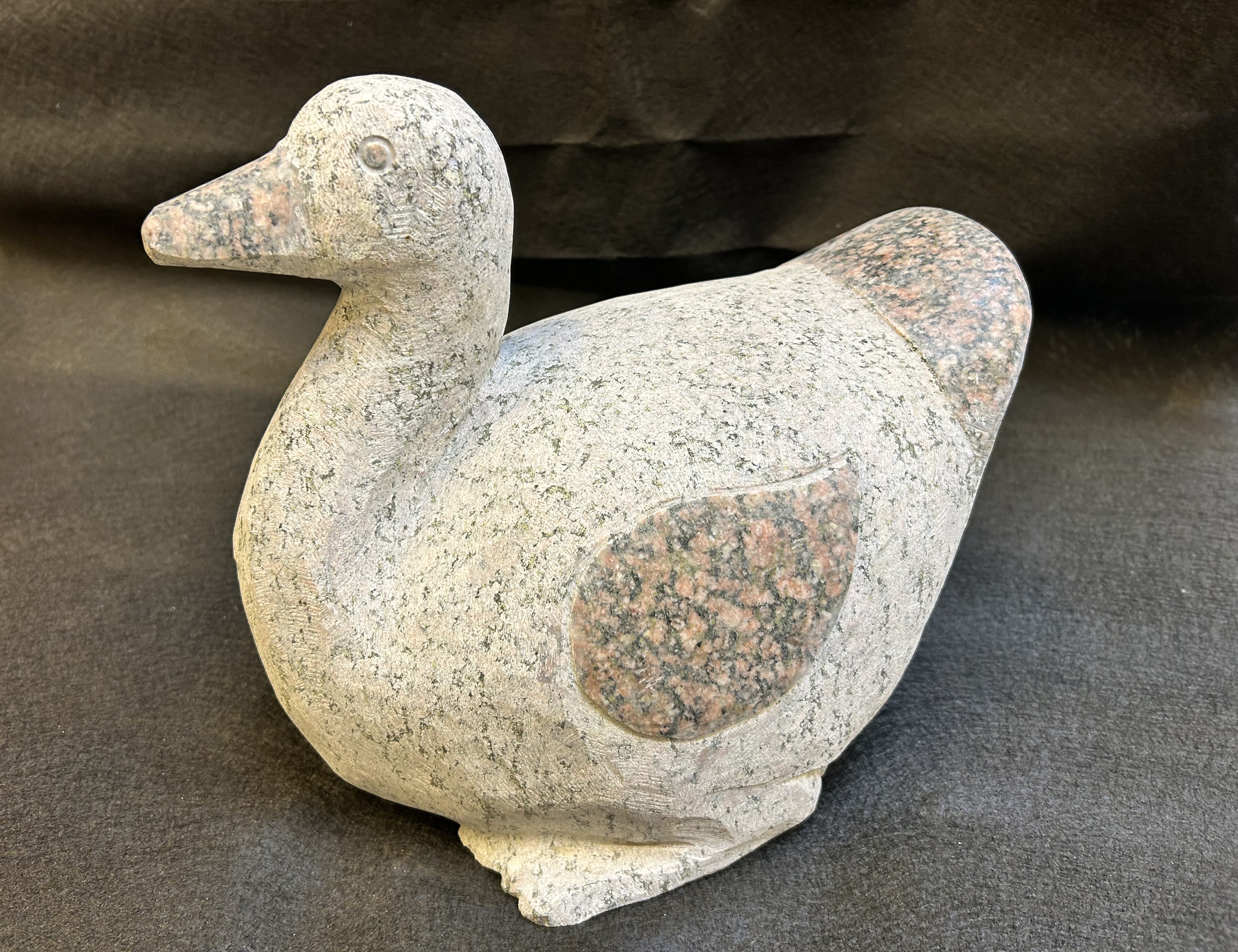 Andefigur i granit. Produceret i rød sten med polerede detaljer - vinger og næb. Fin haveskulptur