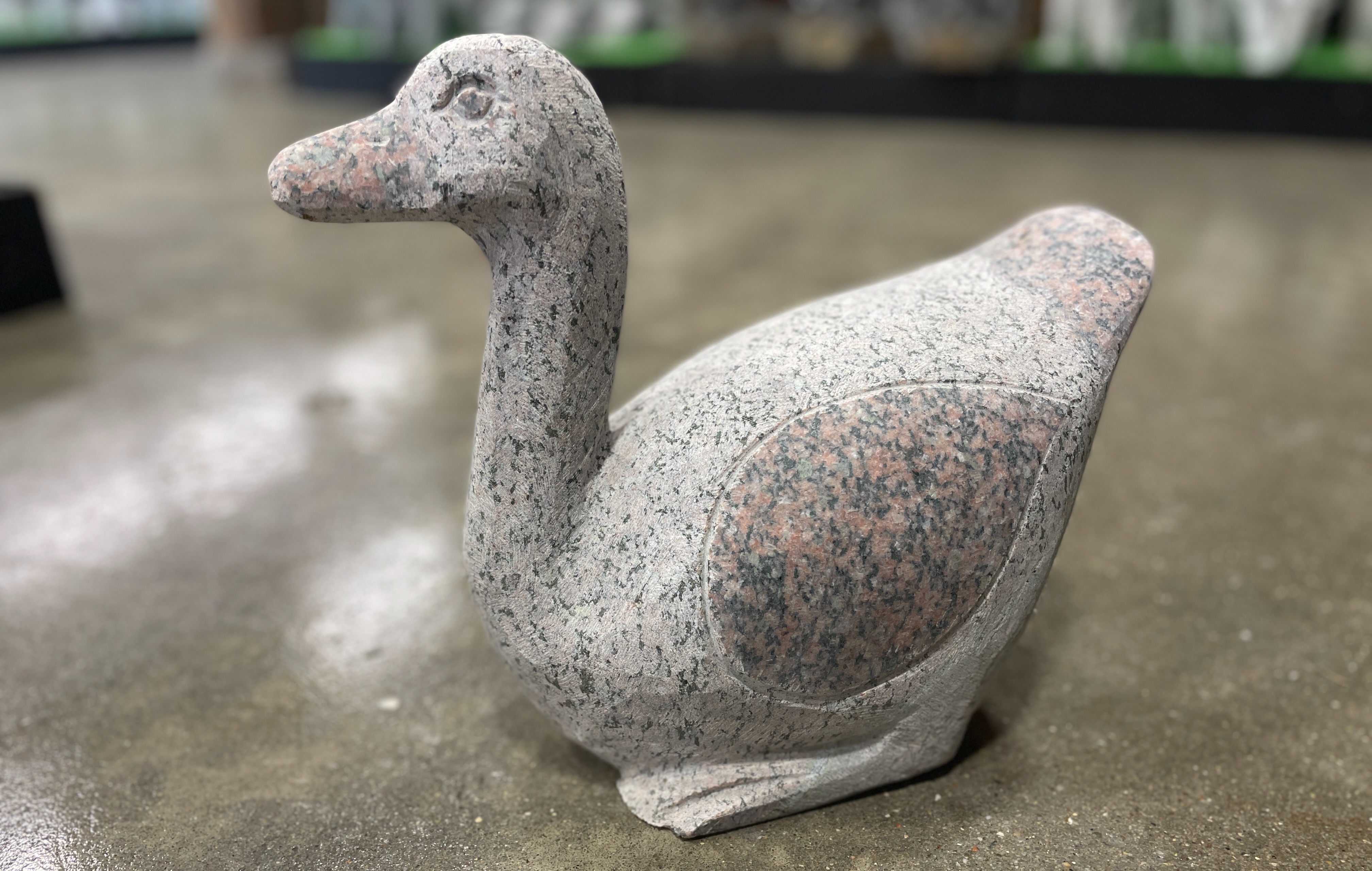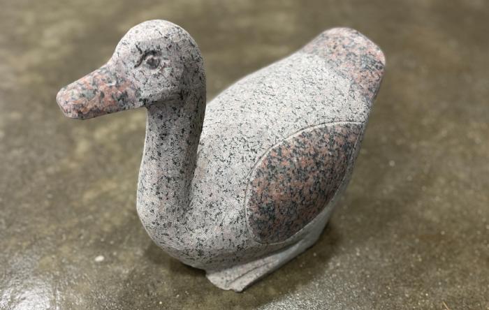 Andefigur produceret i rød granit med polerede detaljer ved næb og vinger
