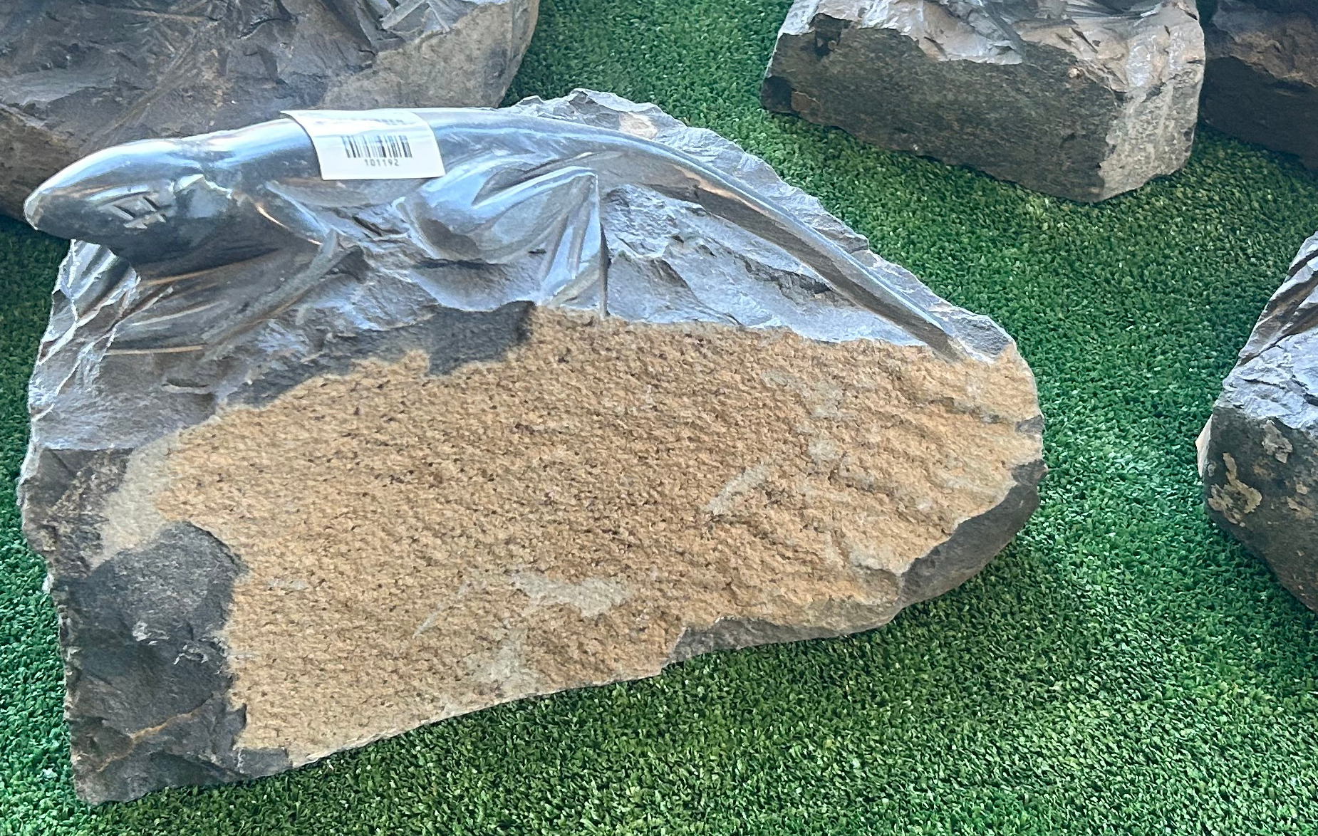 Firben udhugget i sort basalt. Blok/sokkel og firben er et stykke sten. Hver basalt blok er unik i størrelse og form. Firbenet kan derfor variere i størrelsen og hver enkelt er unik.