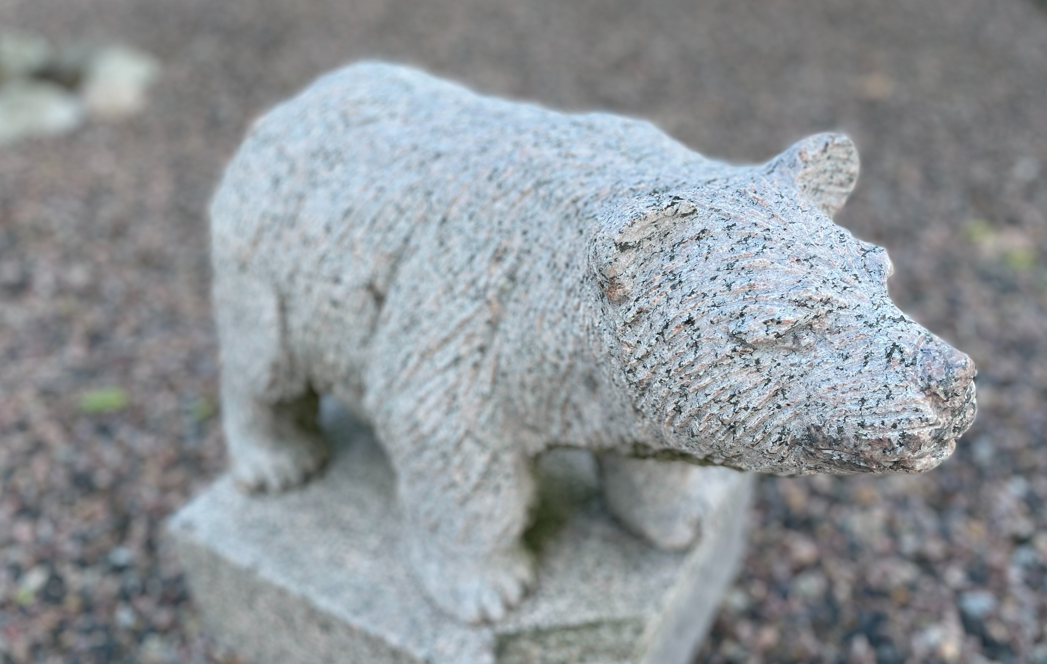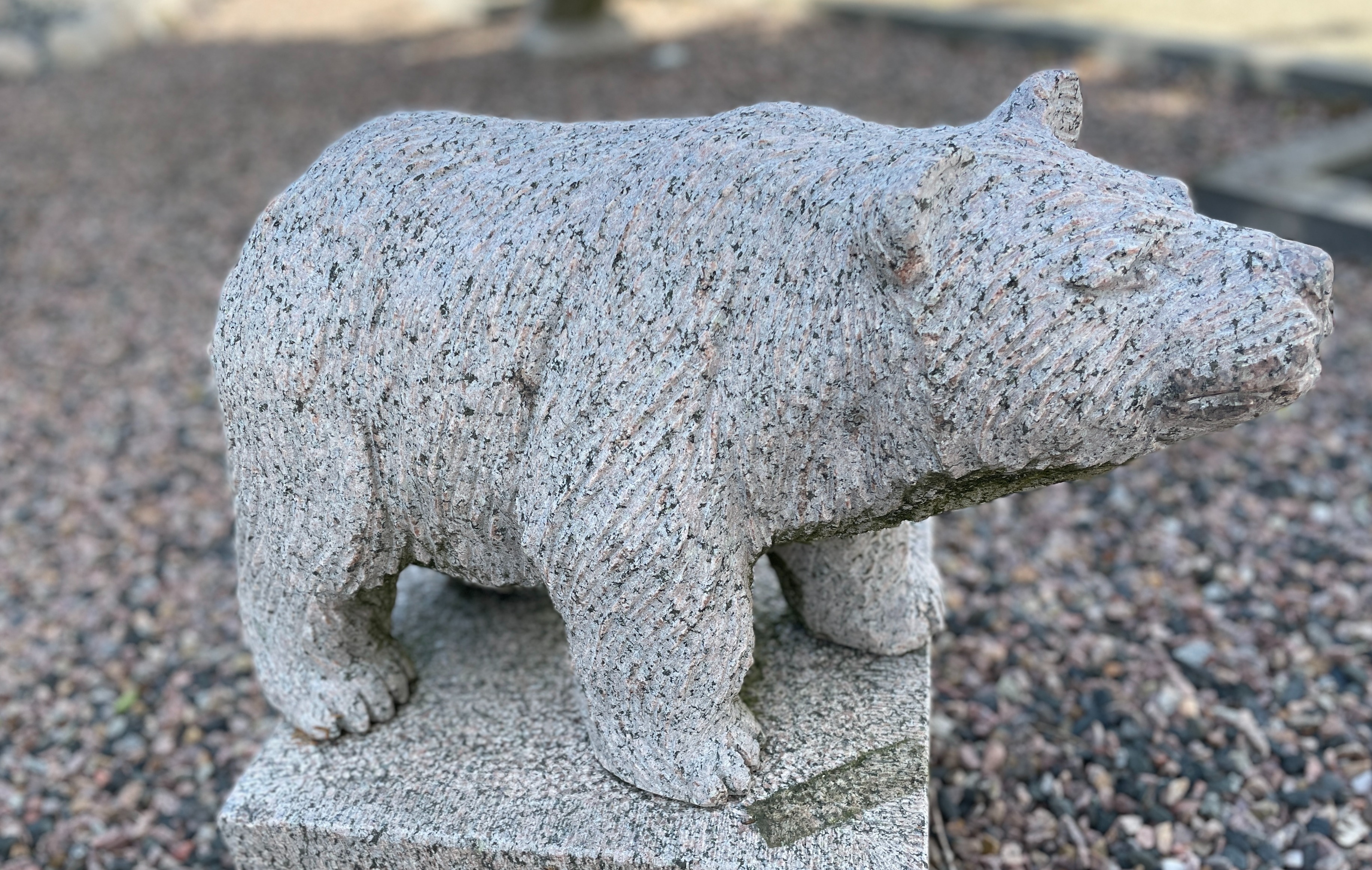 Bjørnen er håndhugget i rødligt granit, som virkeligt kommer til sit es når stenen bliver våd.