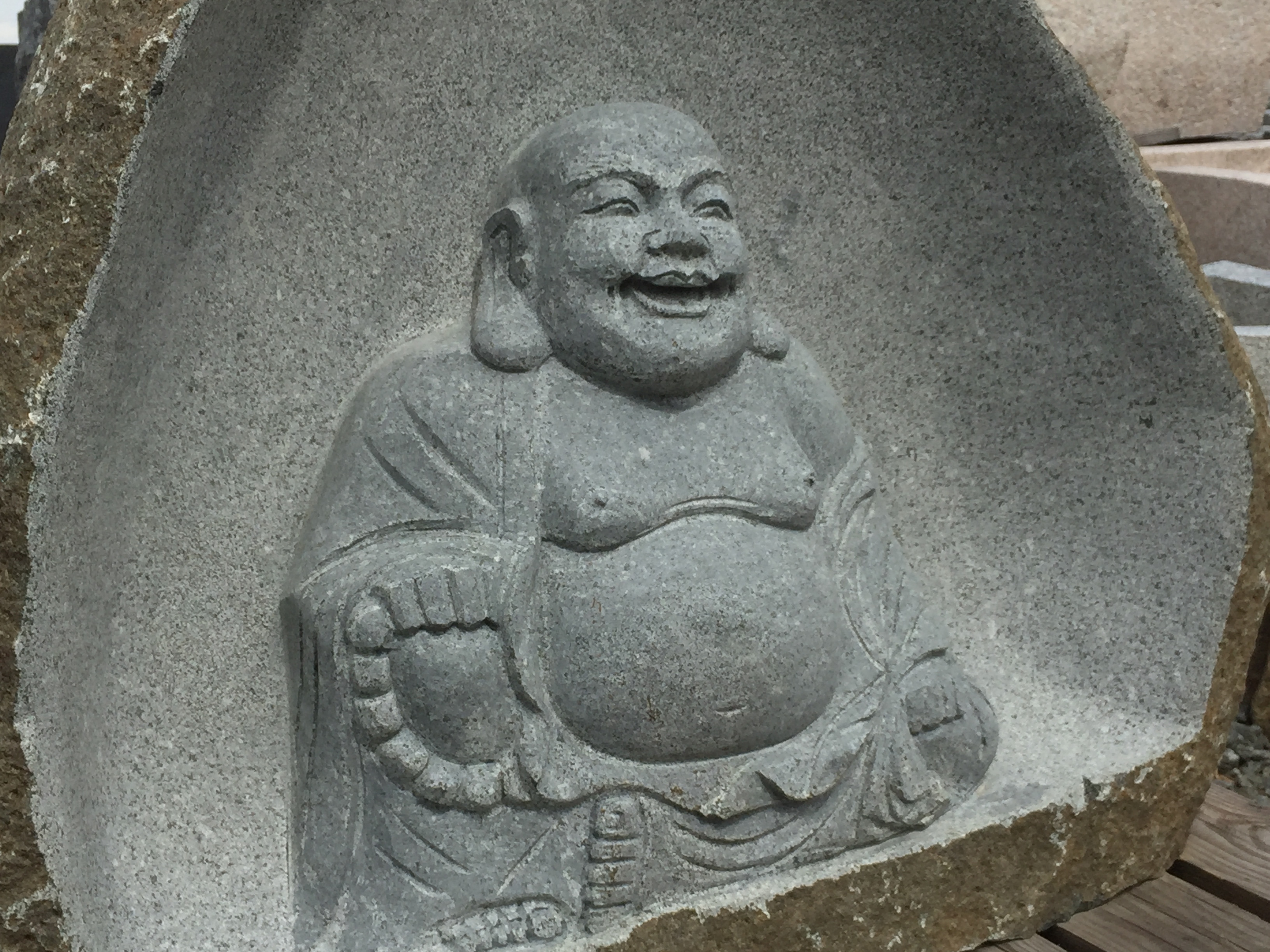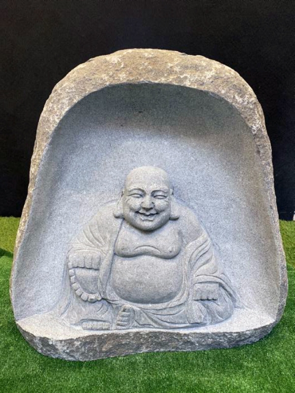 Buddha hugget ind i marksten også kaldet natursten. Den tykke budda frembringer glæde og positivt med smilet han har, og skal bringe lykke i alle hjem og haver. Denne figur er perfekt, hvis man ønsker en mere naturlig figur til at pynte i haven.