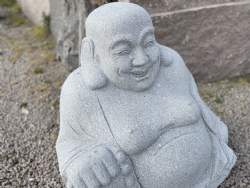 Buddha lavet i grå granit. Denne siddende buddha vil frembringe glæde og positivitet, med det store og kærlige smil. Han skal bringe lykke i alle hjem og haver.