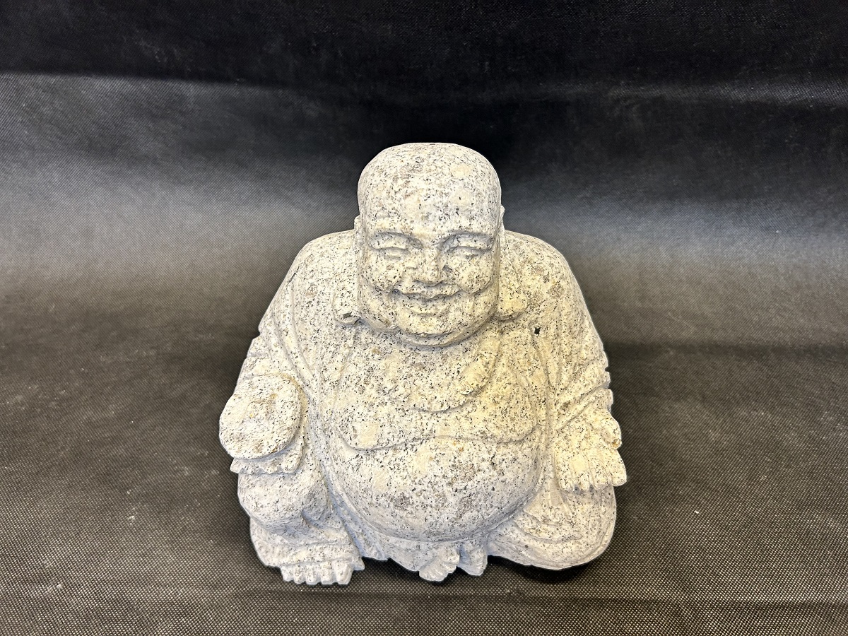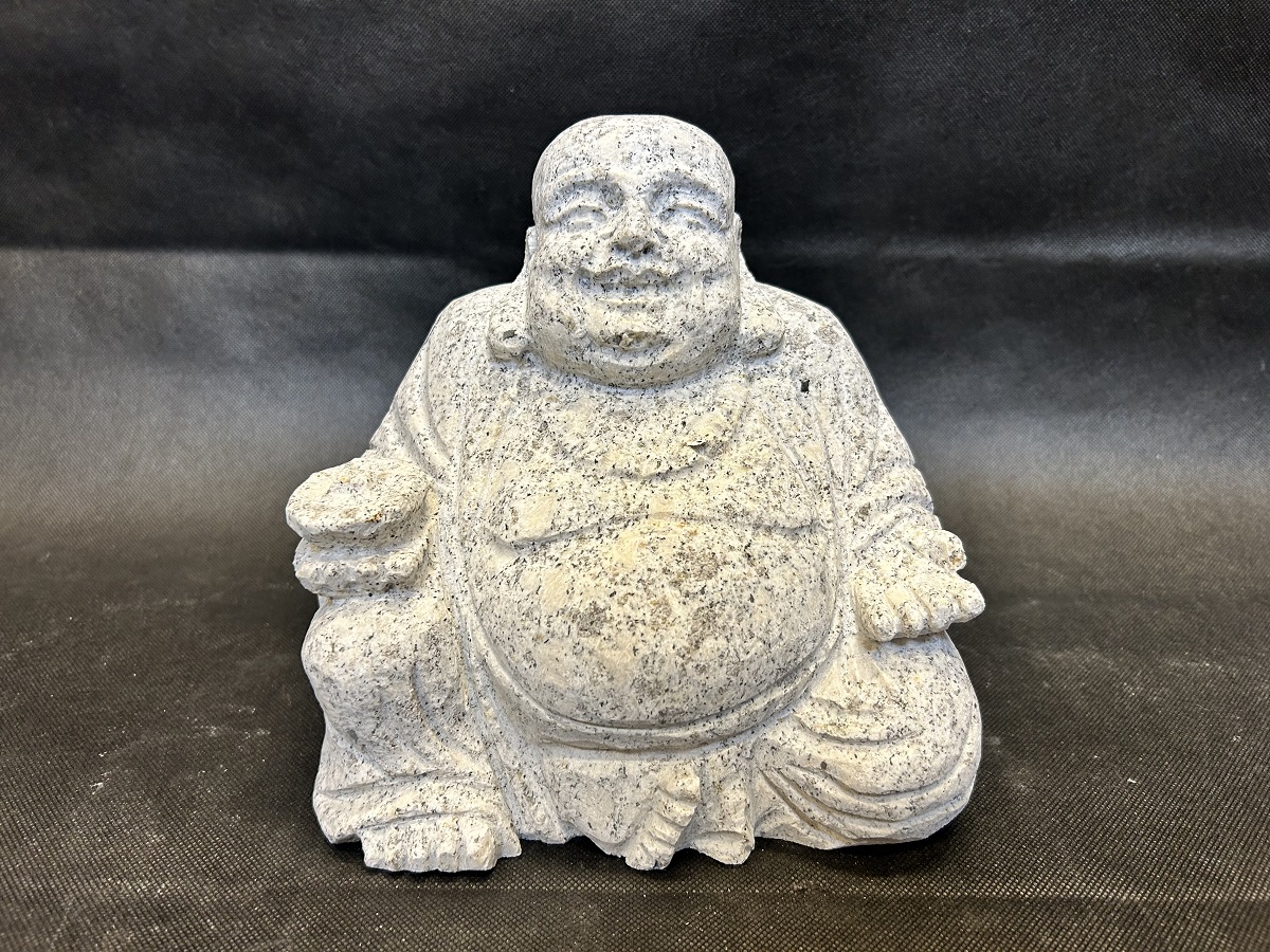 Buddha i lys grå granit. Figureren er et symbol på velstand, lykke og tilfredshed her i livet.