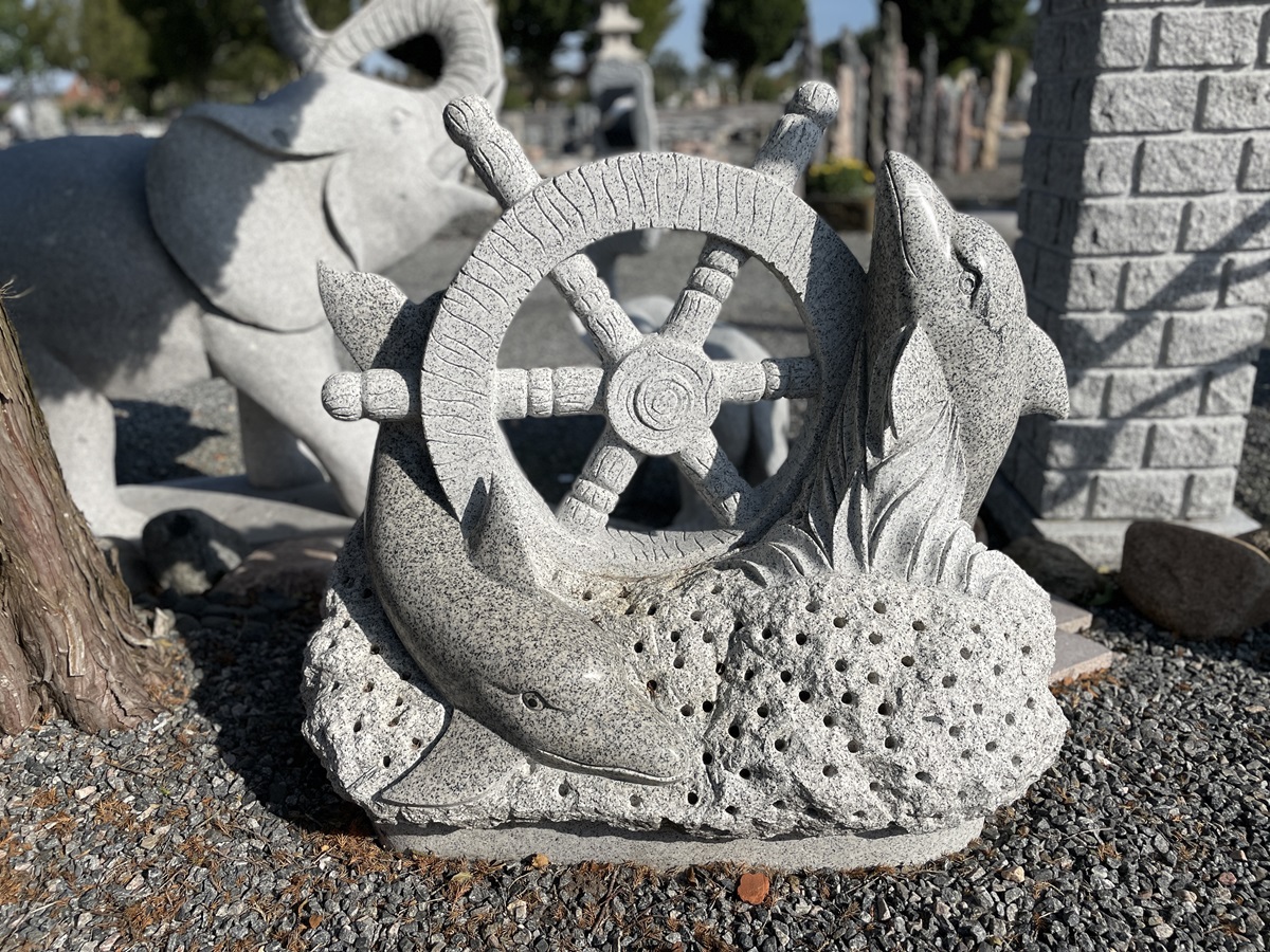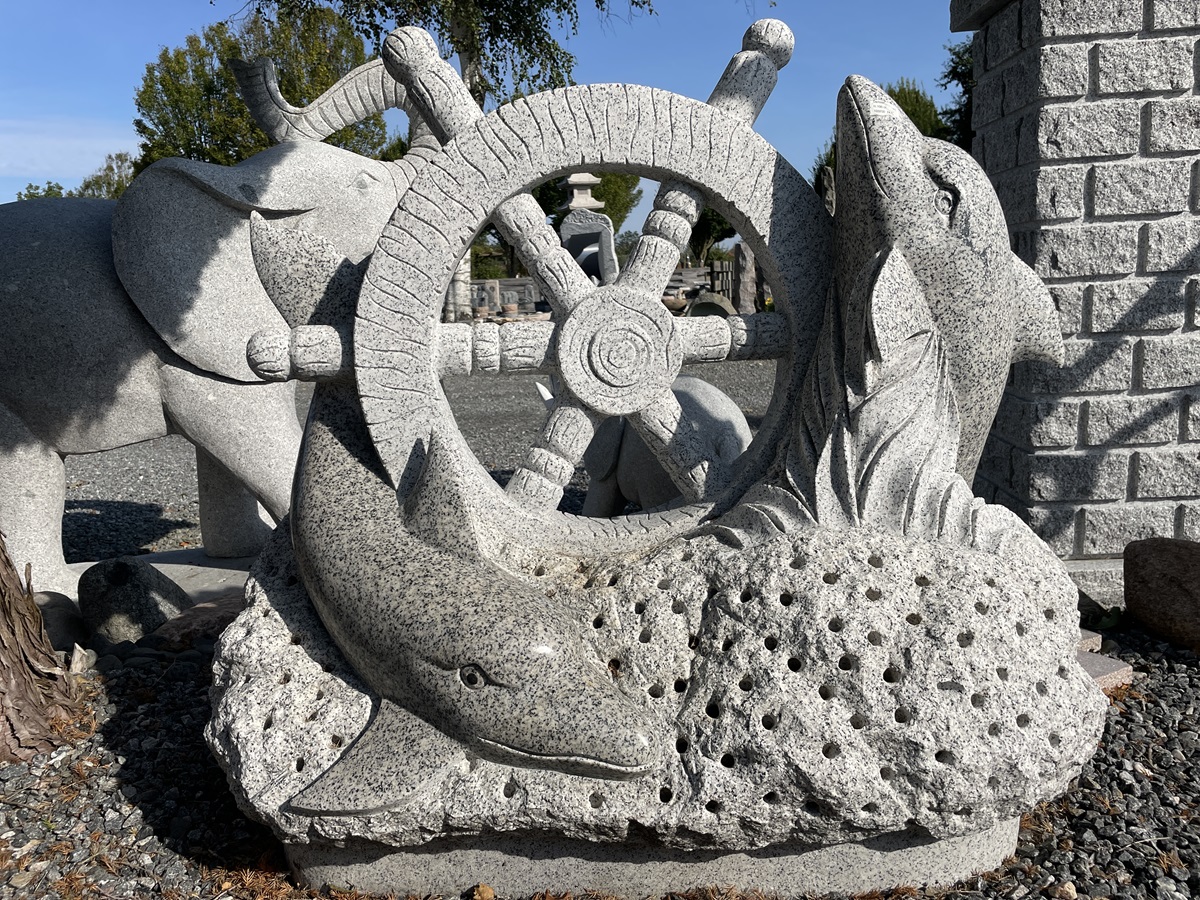 Granitskulptur af legende delfiner omkring et ror, omkranset af bølger og vand. Skulpturen er detaljeret og kunstnerisk udført i lysgrå granit med polerede elementer.