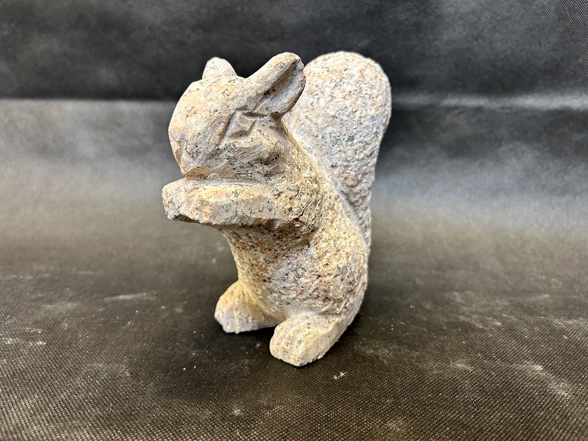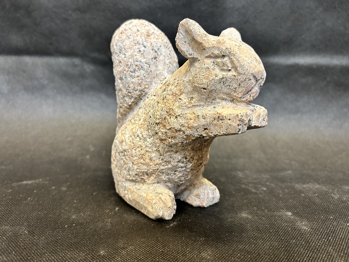 Granitegern i færd med at spise en nød. Sød figur der er idéel til at pryde et bed eller på terrassen. Det søde egern skaber liv i haven og tiltrækker på den måde forhåbenligt flere dyr i haven.