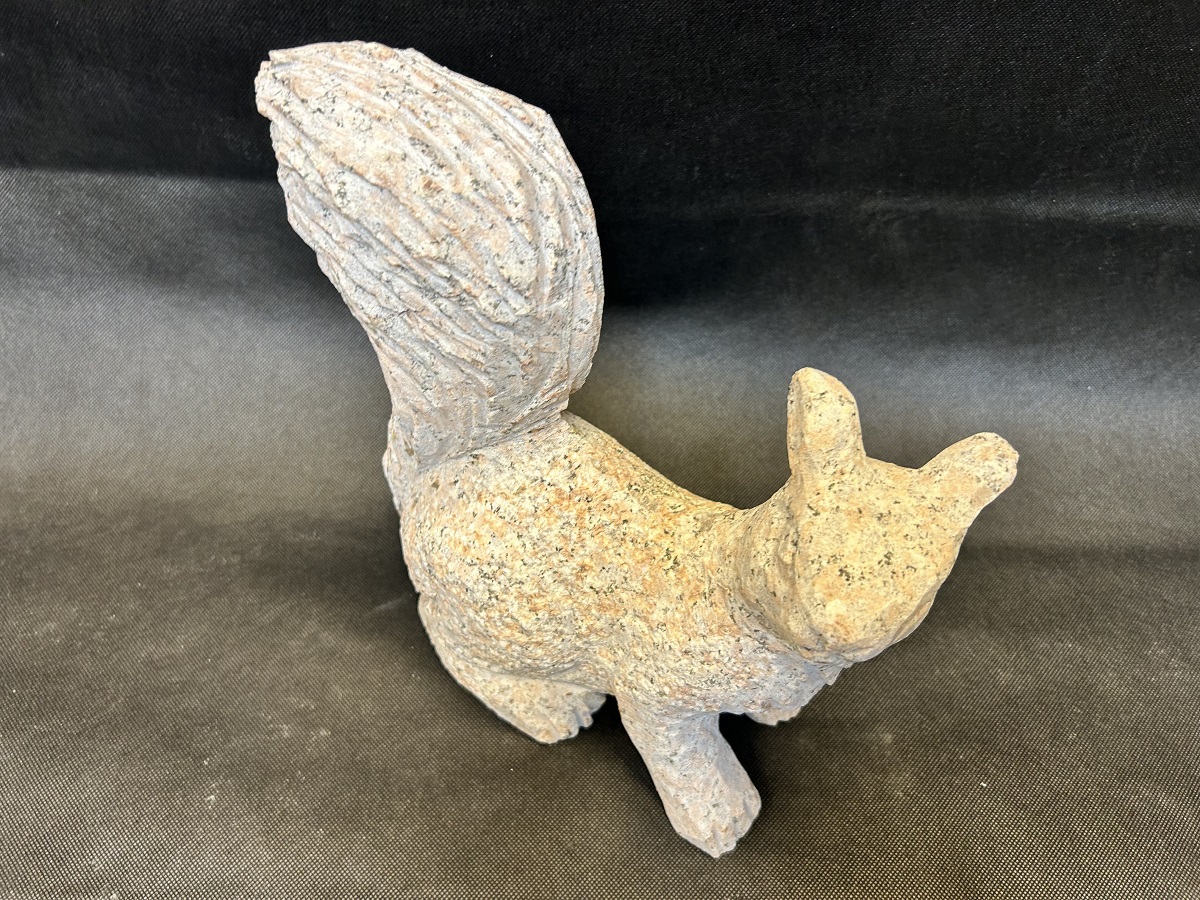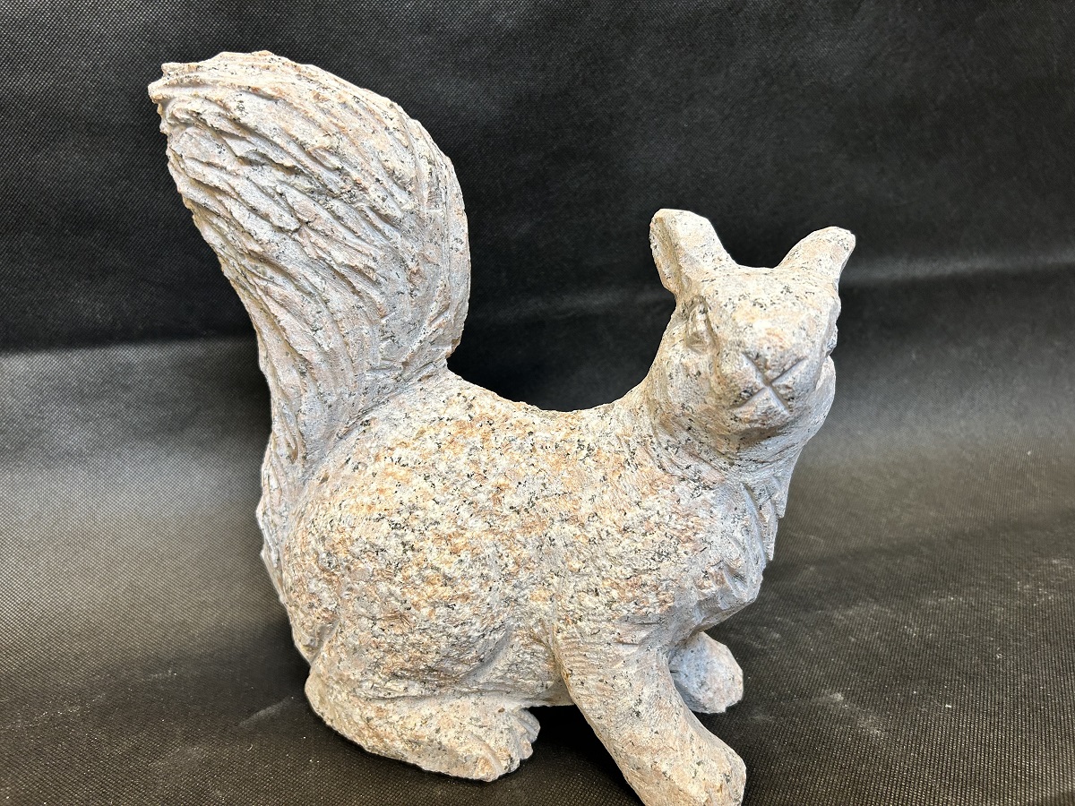 Egern i rosa granit. Det fine egern står og kigger - måske på jagt efter noget at spise. Det rosa granit egern passer perfekt til haven.
