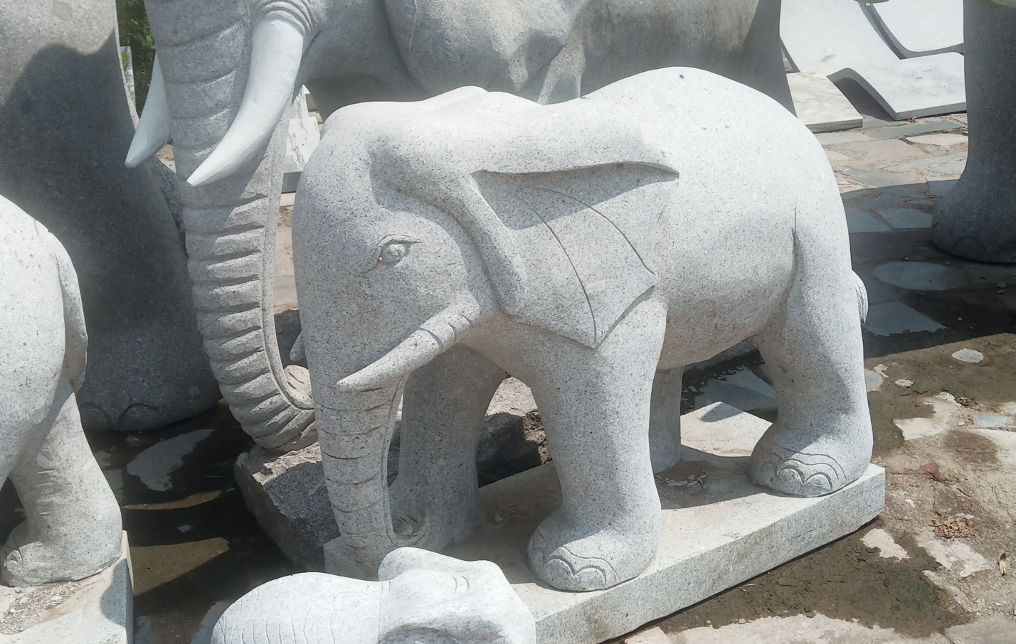 Elefanten står på en sokkel med snablen hvilende langs forbenet.