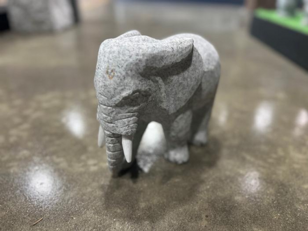 Elefant i lysegrå granit med marmor stødtænder. Stødtænderne på elefanten er lavet i hvid marmor for at gøre den mere livagtig at se på. Disse stødtænder er ikke monteret ved modtagelse, så man selv har mulighed for at placere og montere evt. med tokomponent lim.