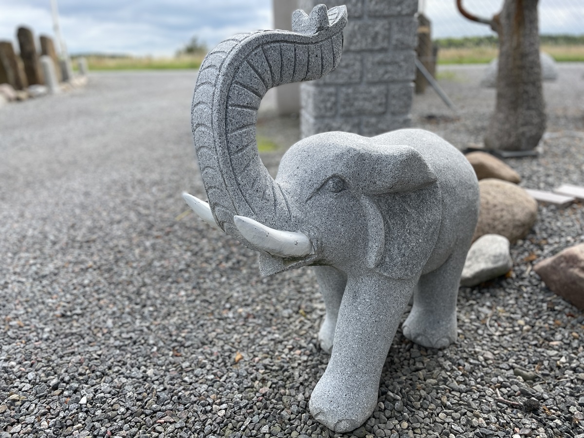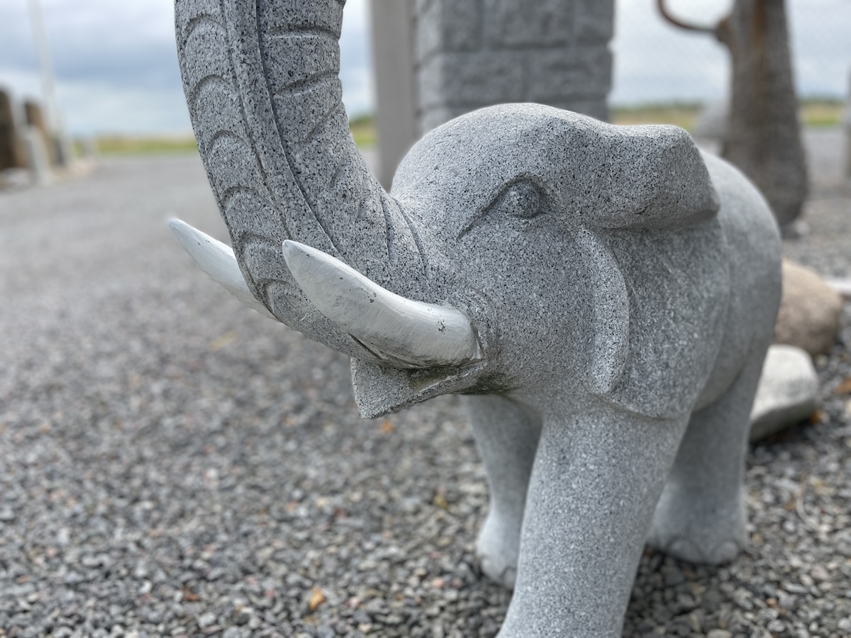 Grå granitfigur formet som en elefant med oprejst snabel og stødtænder. Stødtænderne er malet men hugget i samme sten helt tæt til snablen og kan derfor ikke fjernes.