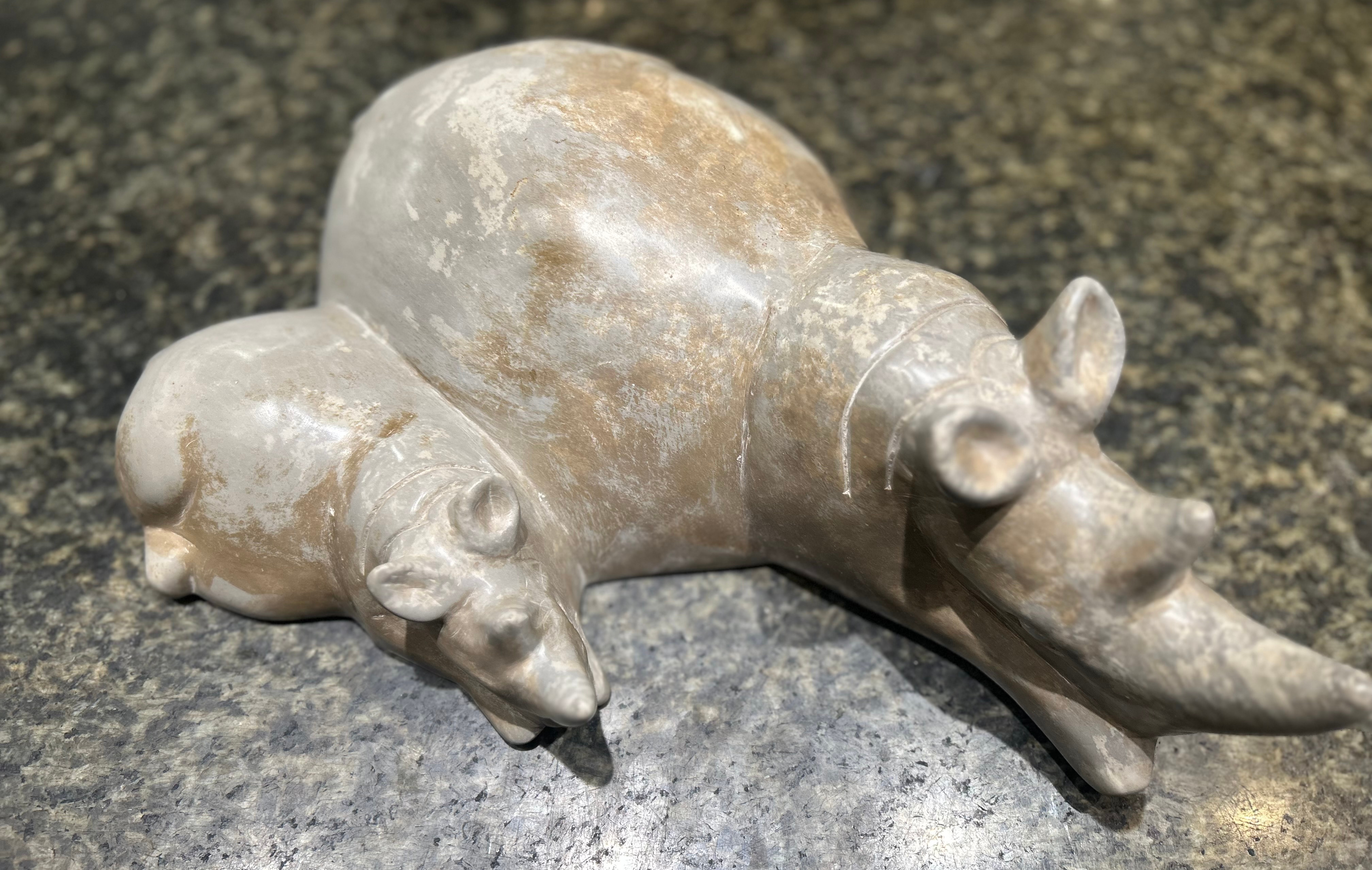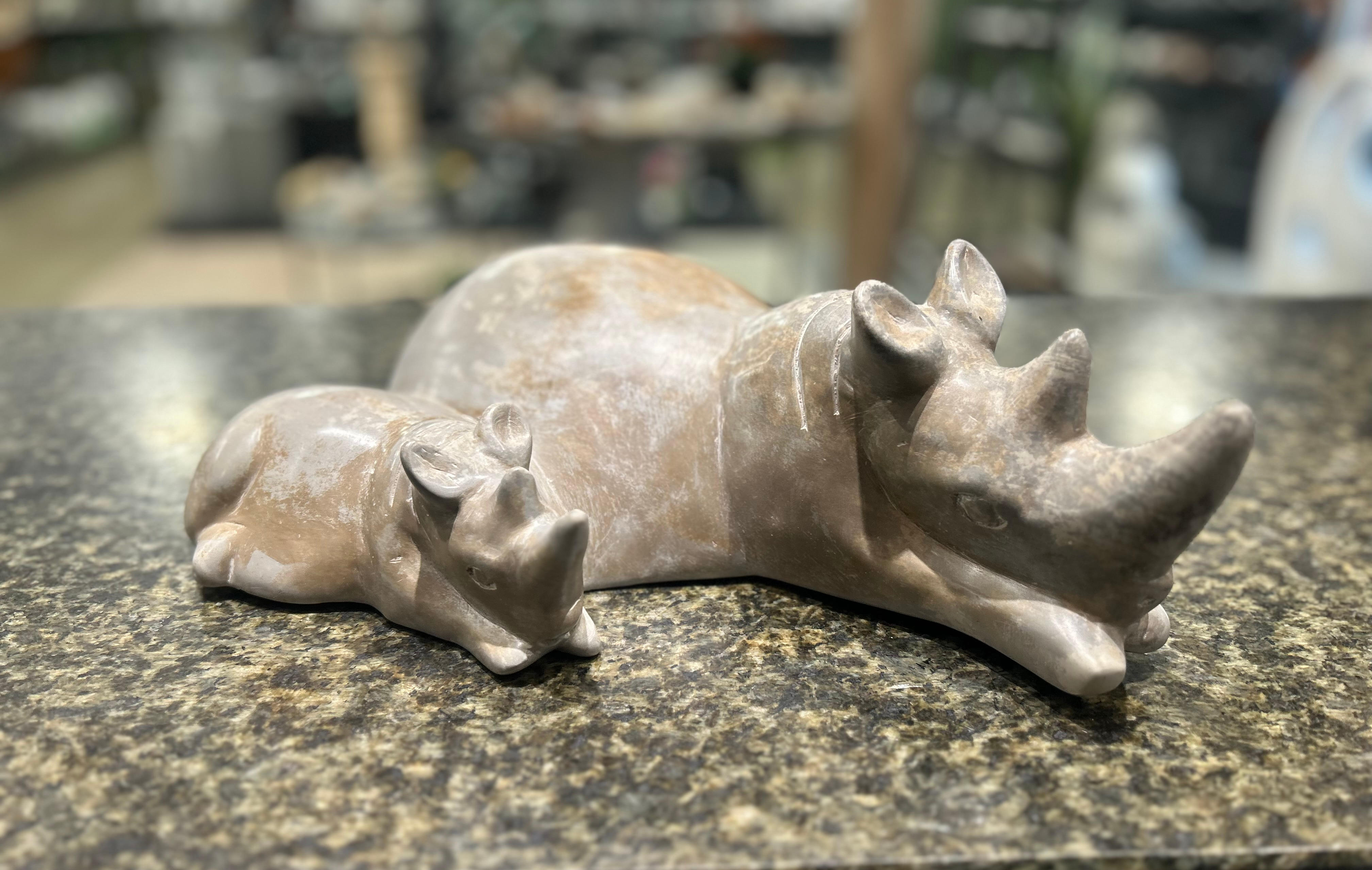 Fedsten næsehorn mor med unge. Figuren er lavet i fedsten, som har et varierende farvespil i den grålige nuance.