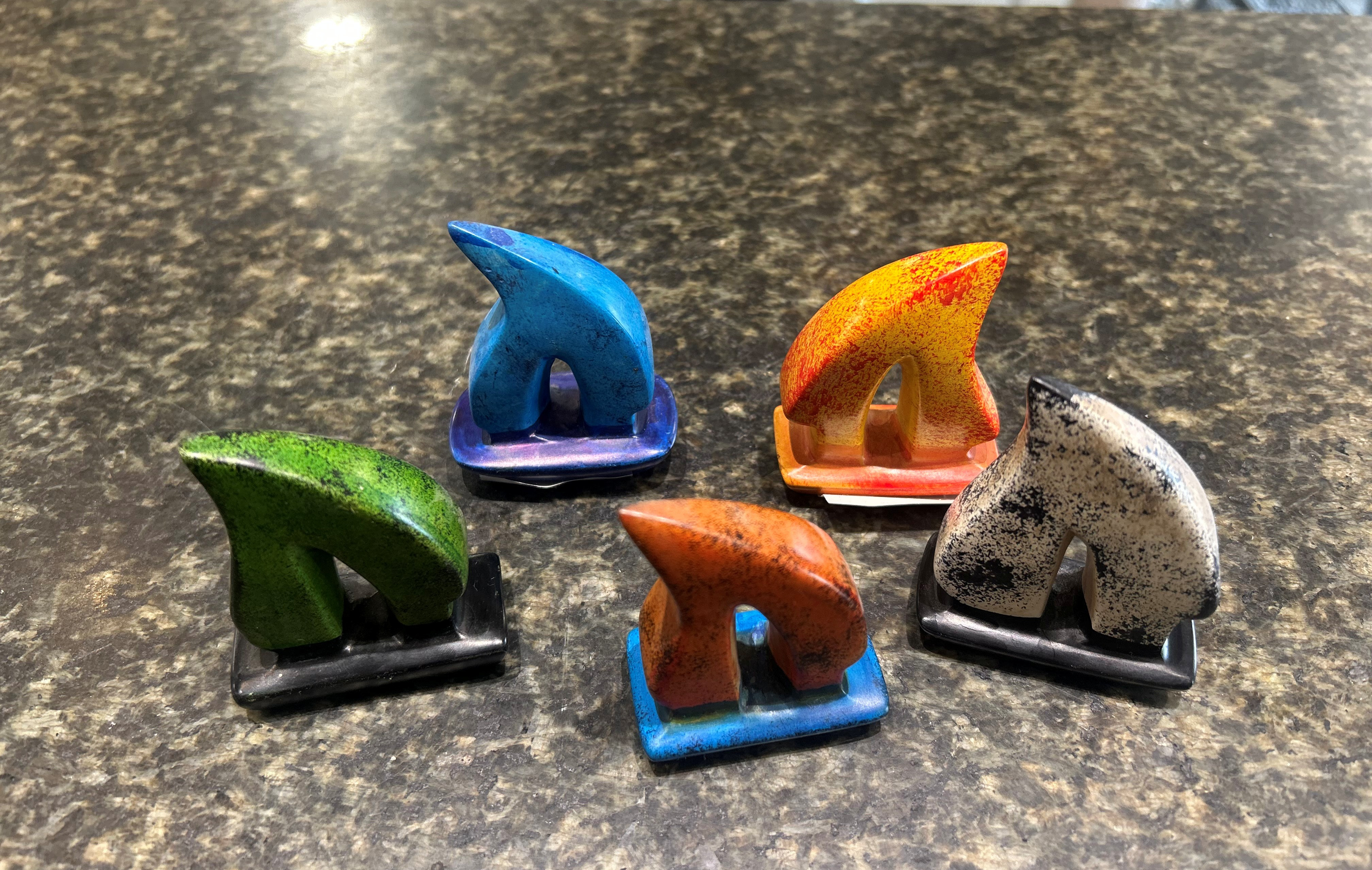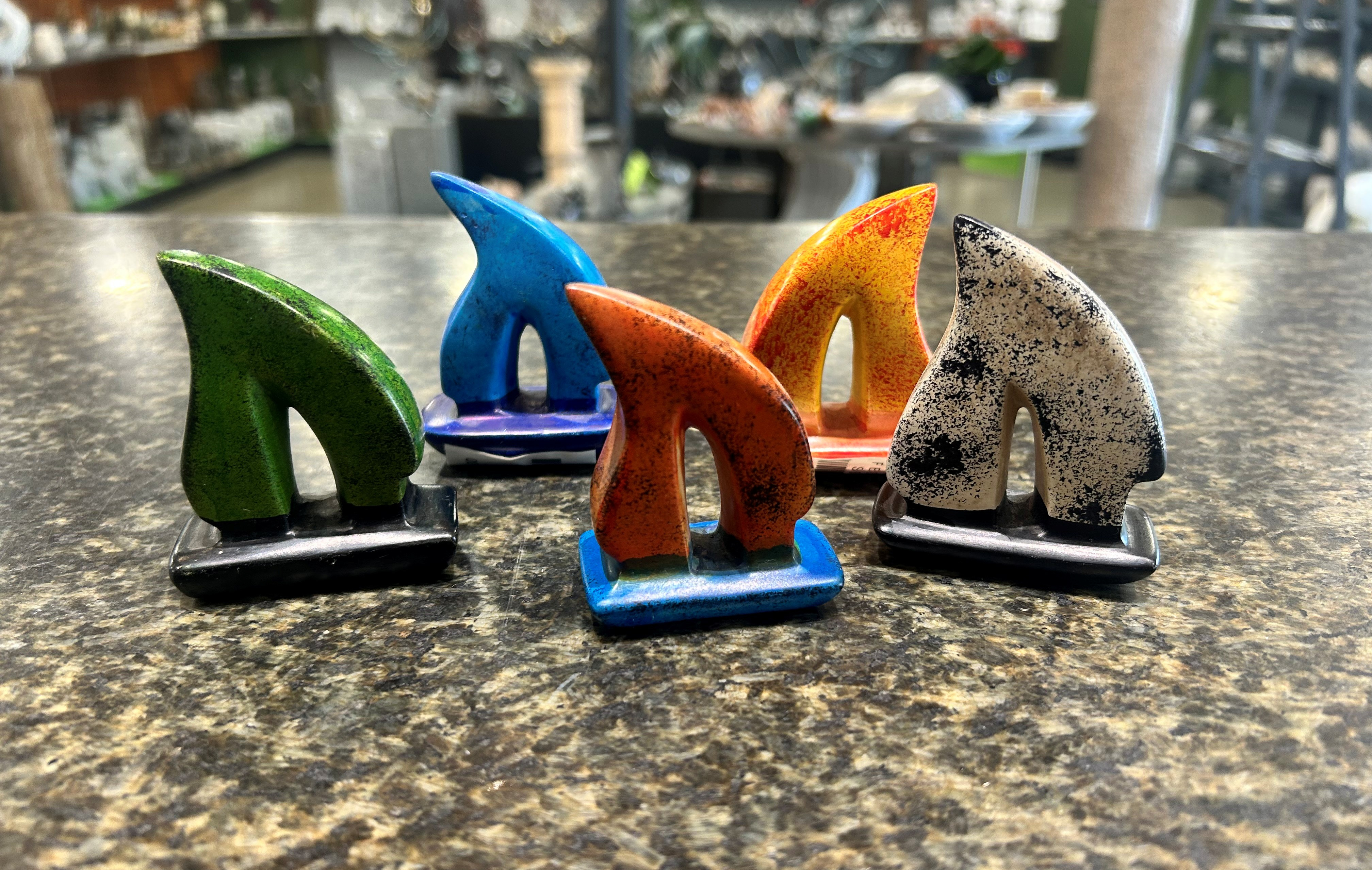 Sejlbåd i fedtsten malet i forskellige farver bl.a. blå, sort, grøn, gul og orange.