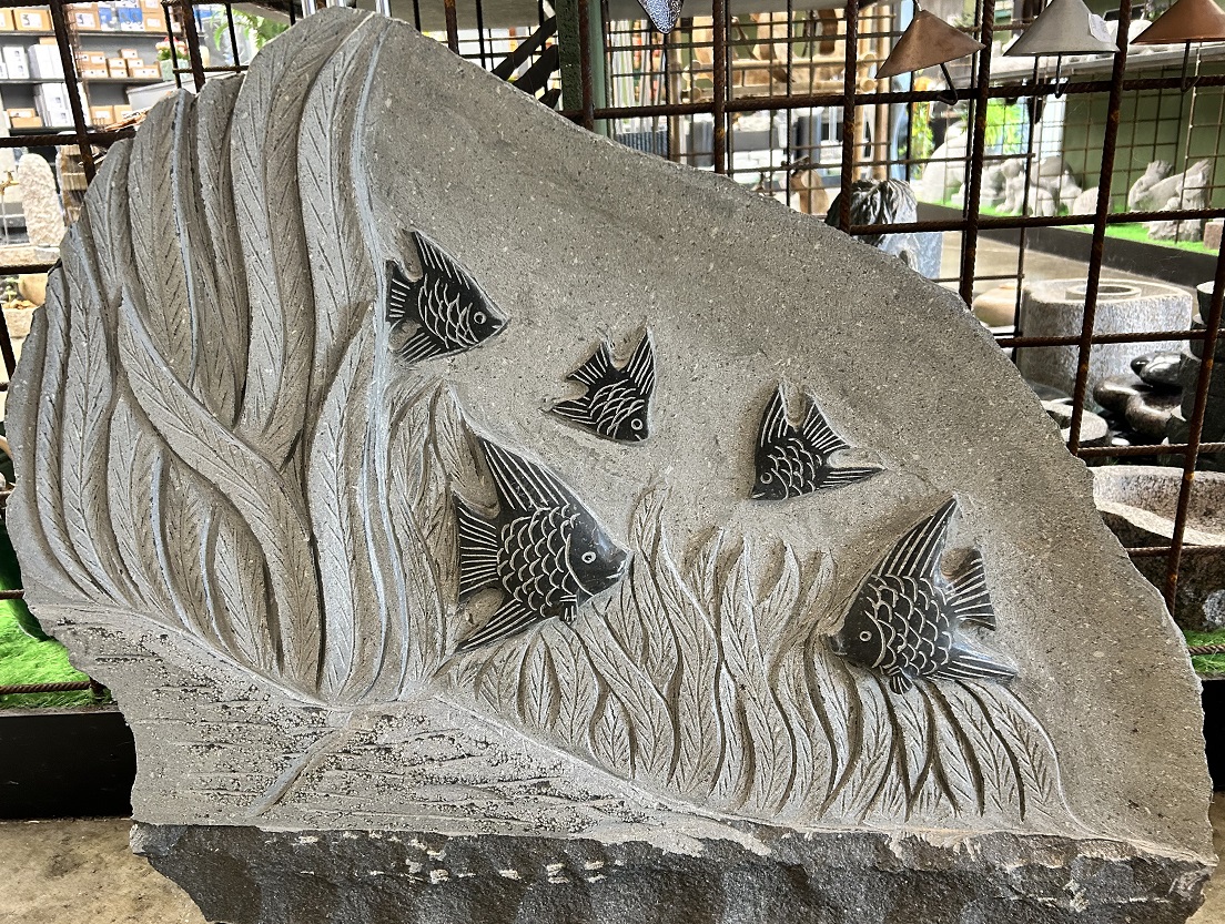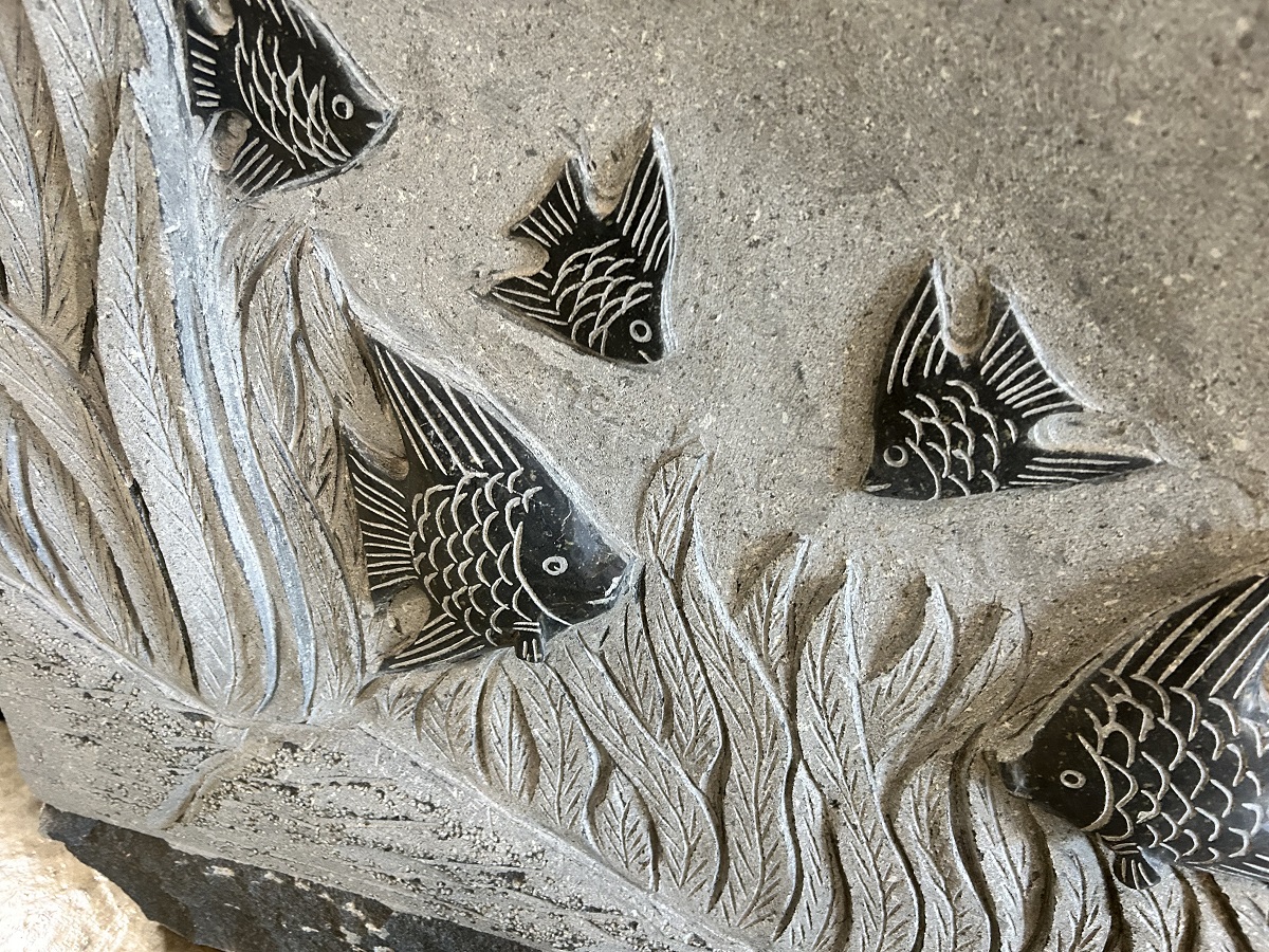 Fiskeskulptur/væg i sort basalt. Den fine skal/væg af basalt er forarbejdet til et kunststykke; næsten som et akvarie. Der er 5 polerede fisk på væggen.