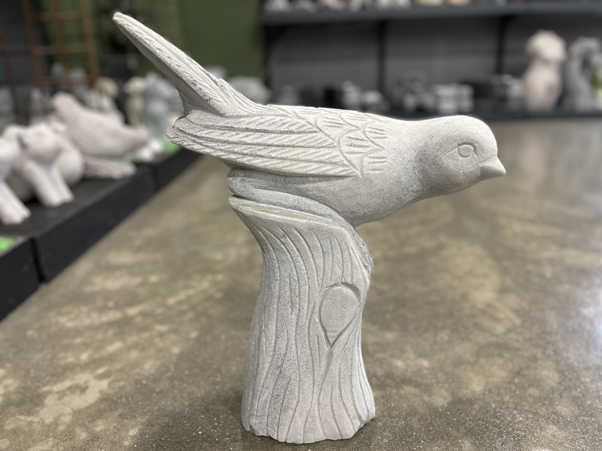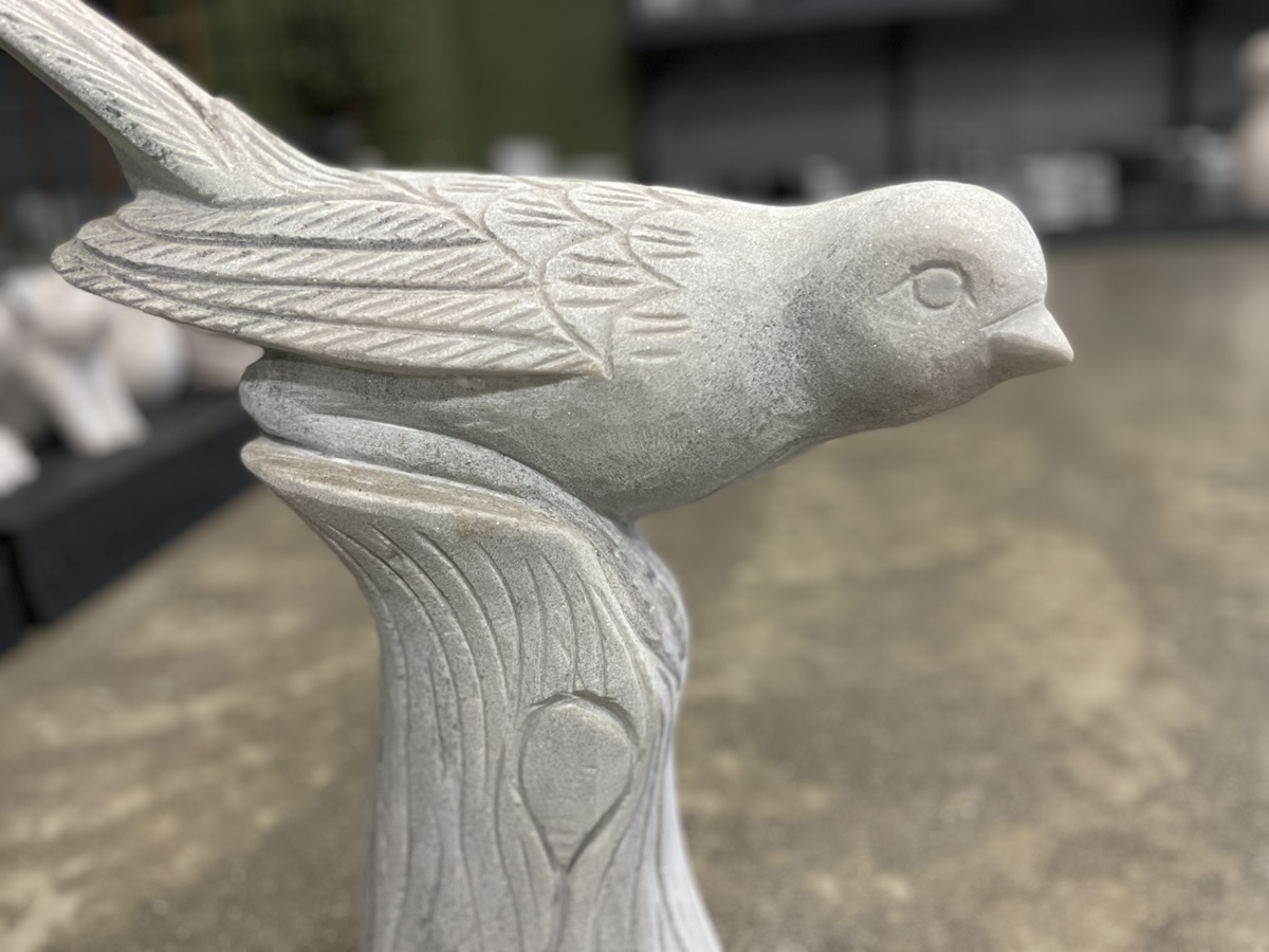 Fuglen og grenen har flotte detaljer, og figuren vil passe ind på de fleste terrasser og indretninger.