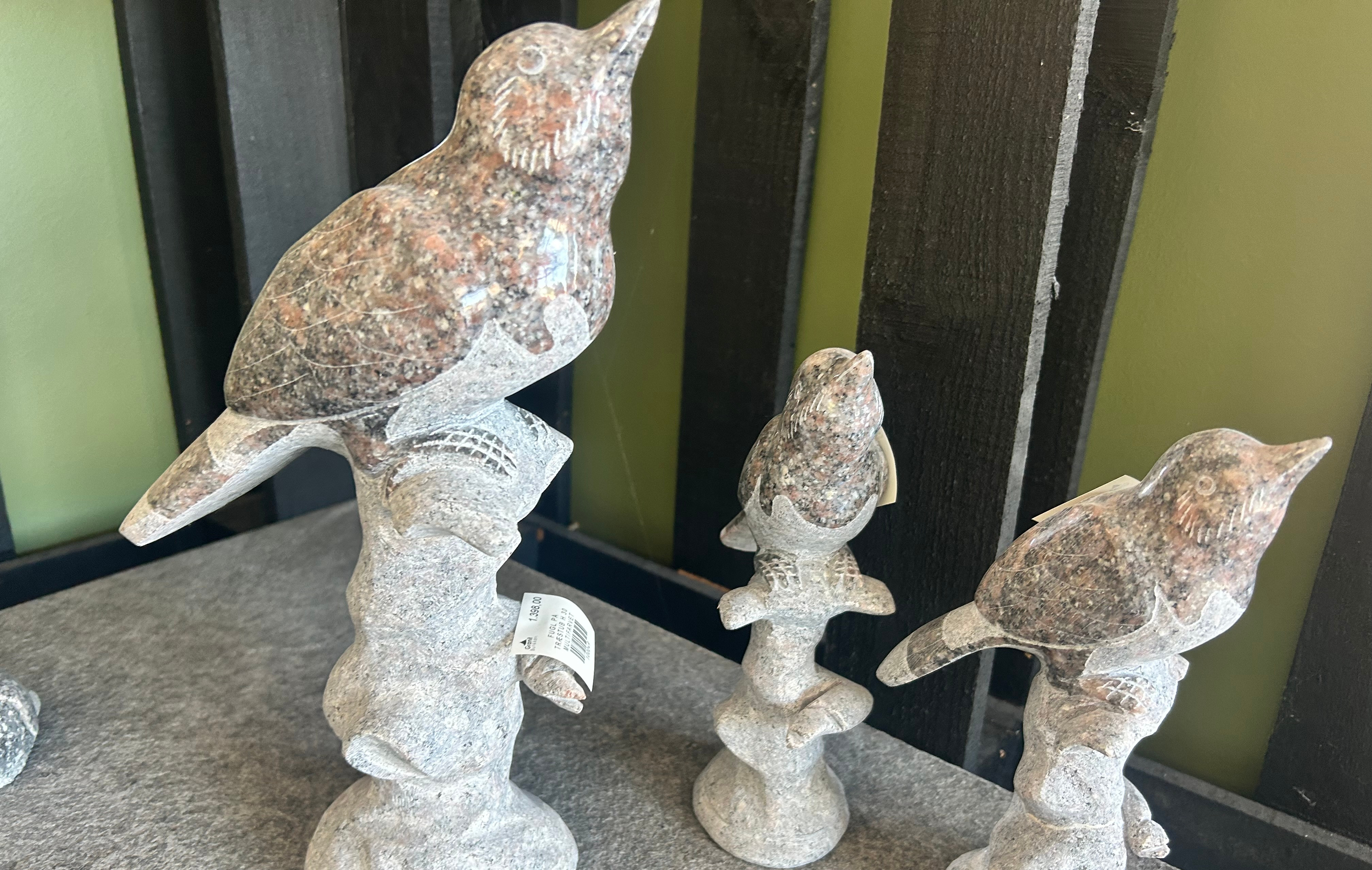 Poleret fugl i rødlig granit på træstub i flere størrelser.
