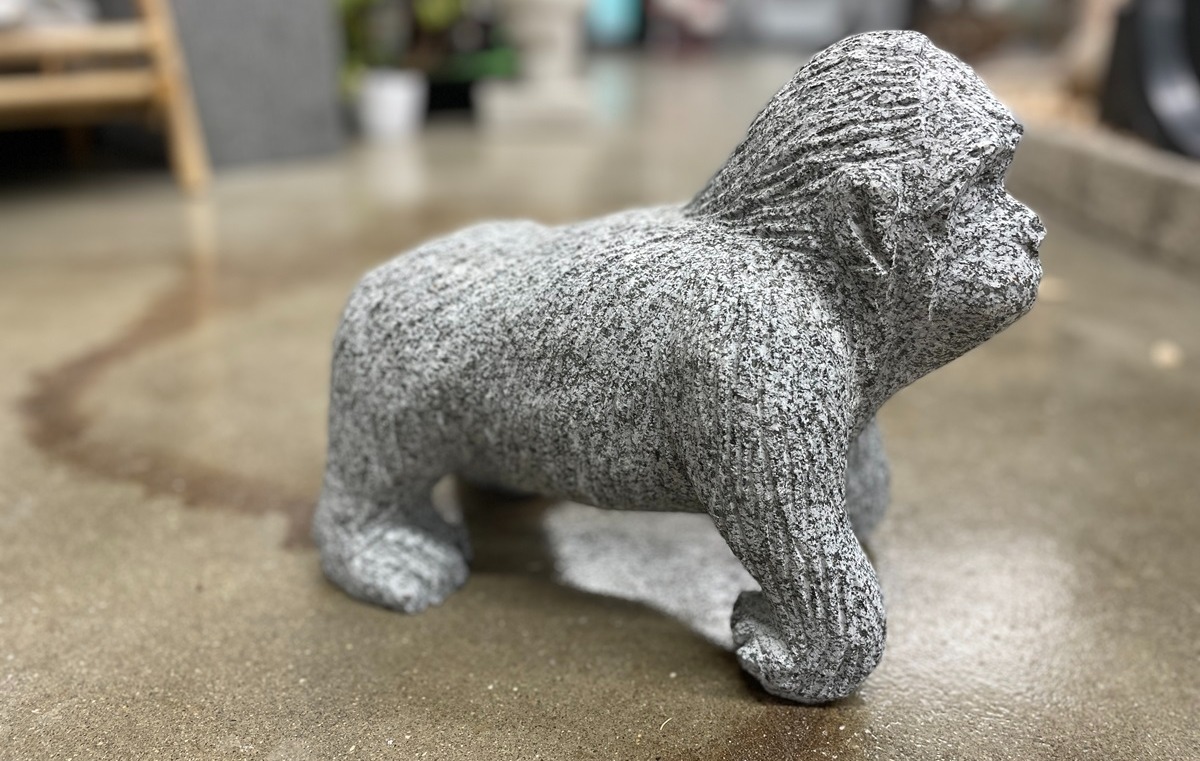 Gorilla udformet i gråsort granit. Figuren er udhugget med imponerende detaljer og fremstår med naturtro træk, såsom figurens holdning, det karakteristiske hoved og den muskuløse abekrop.