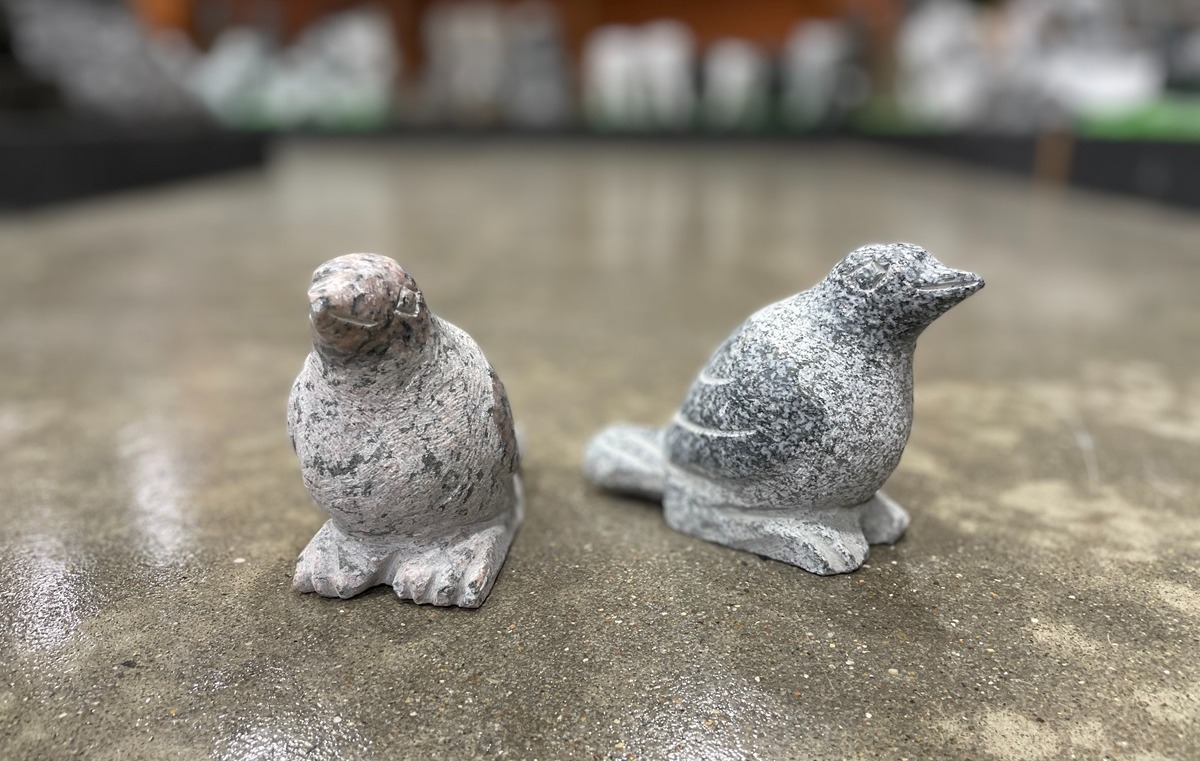 Lille granit fugl i grålig eller rødlig granit. Den lille fugl har en længde på 12 cm, og fås i enten en grå eller rød granit.