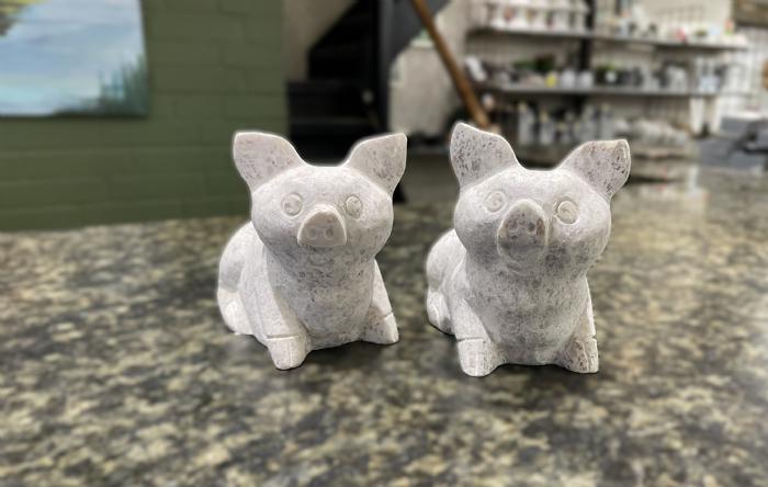 Grisepar lavet i gullig granit. Grisene har farvevariationer, som ses på billederne - med polerede og matte detaljer der får granittens farver til at stå frem.