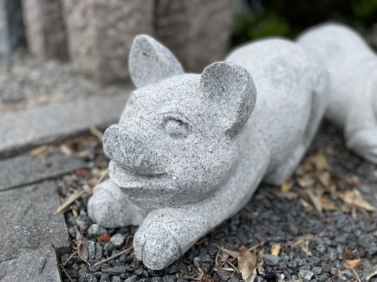 Sød og sjov granitfigur af en gris i lysegrå granit.