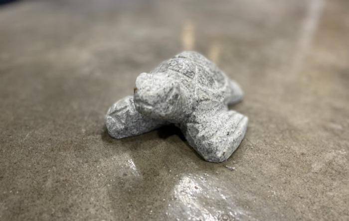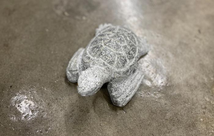 Havskildpadder lavet i lysegrå, rød, gul, gråsort og sort granit med poleret skjold hvor detaljerne er skåret ud.
