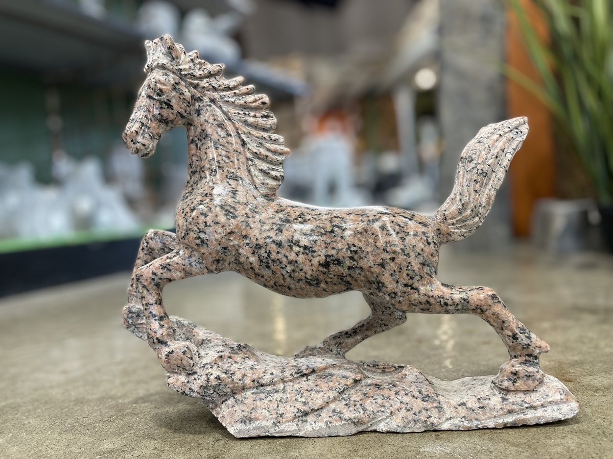 Hesten står stolt med hovedet løftet, ørerne spidse og øjnene vågne og opmærksomme. Dens detaljerede krop er smukt poleret i rød, pink eller grå granit som giver et spil i granittens forskellige farver.
