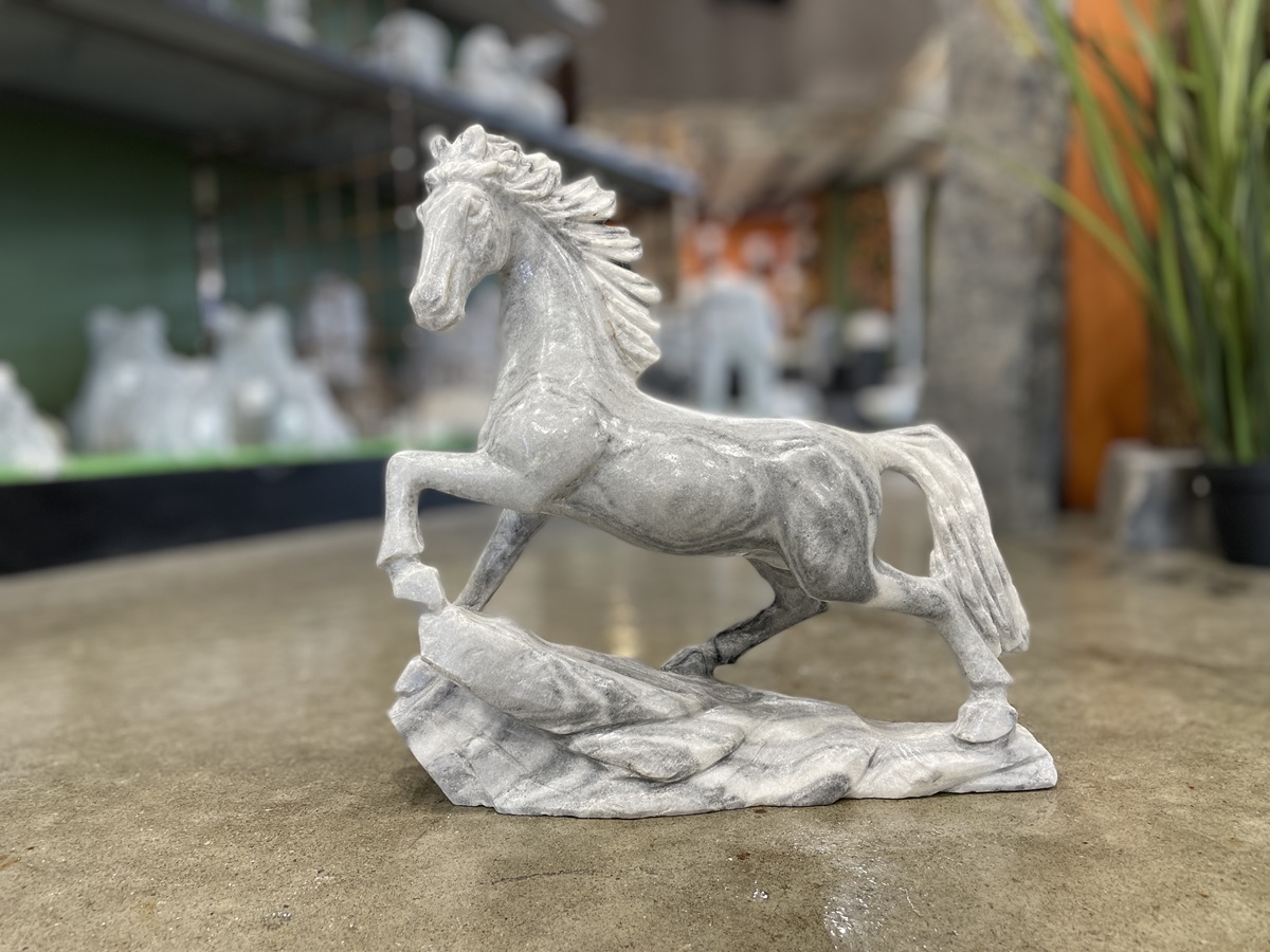 Den smukke granitskulptur af en stående hest med vinden, der leger gennem manke og hale, har en position der giver hesten et majestætisk og dynamisk udtryk.