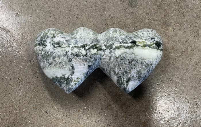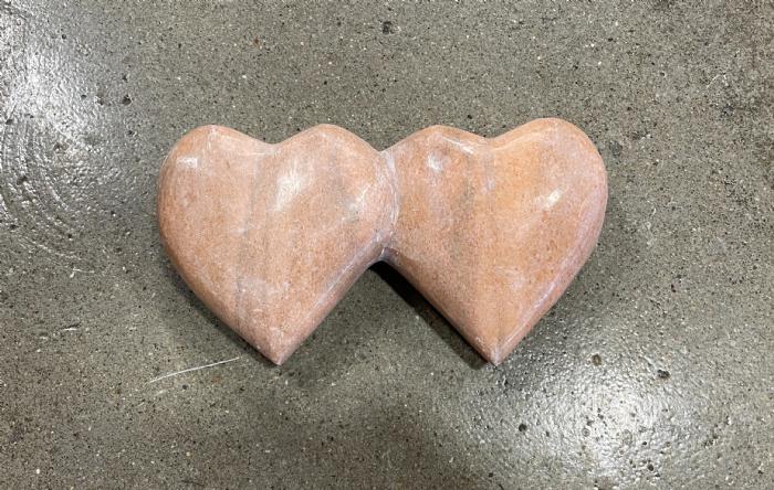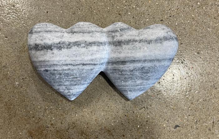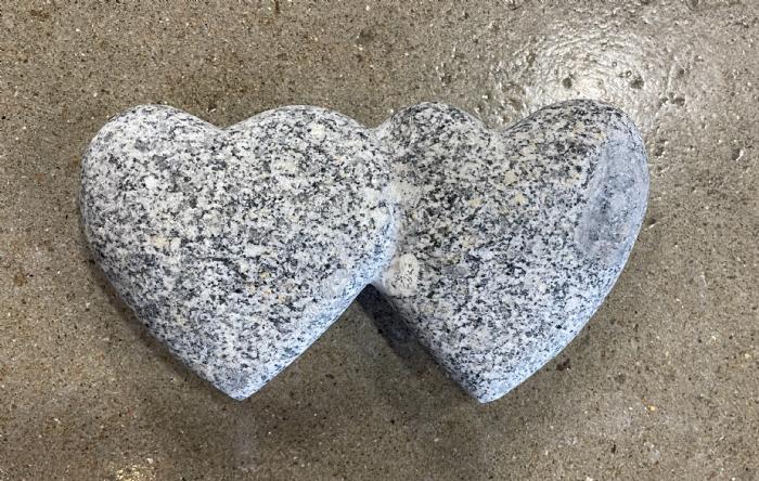Polerede dobbelthjerter lavet i sort og lysegrå granit, samt grøn, grå eller rosa marmor.
