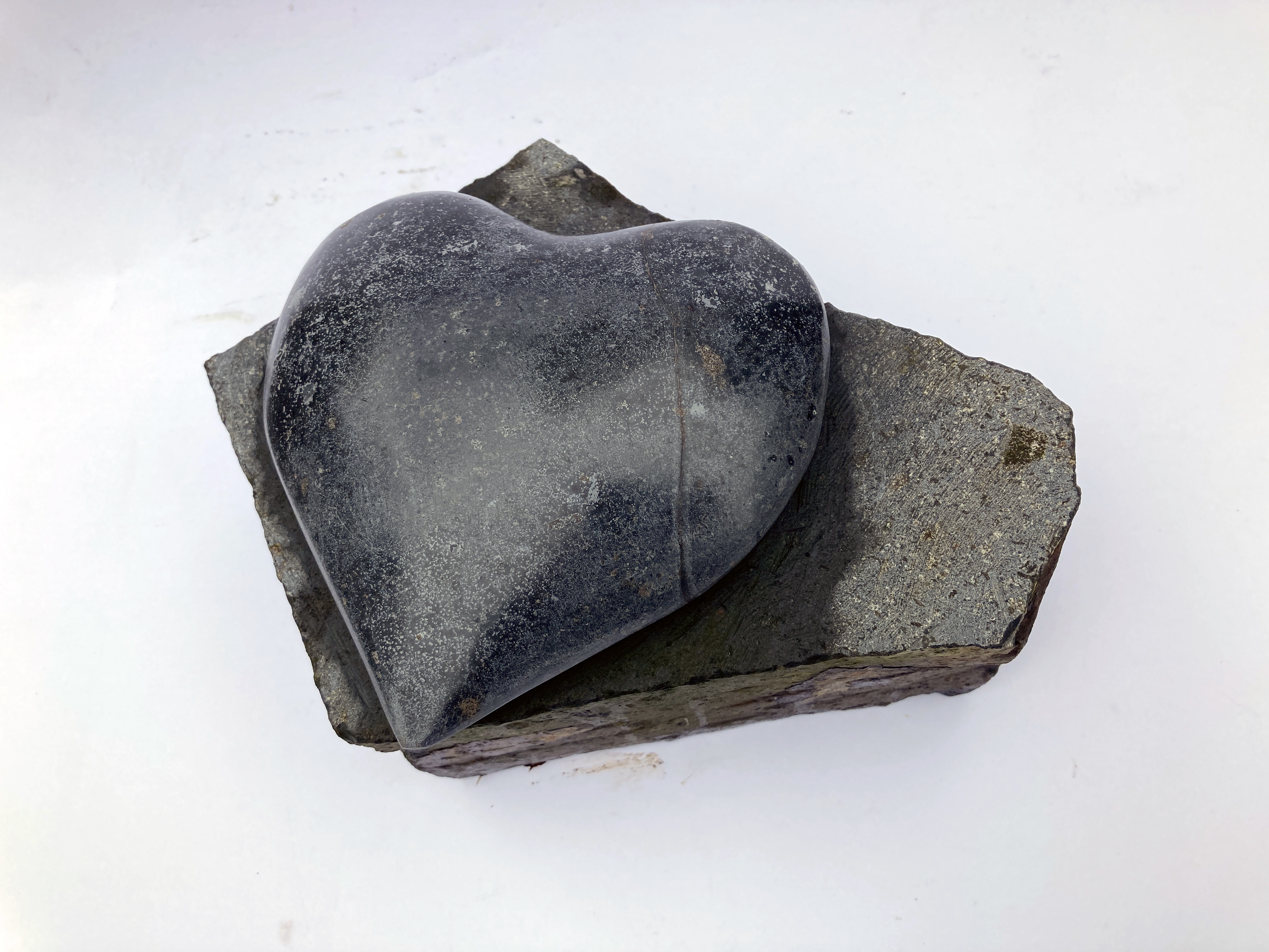 Poleret hjerte af sort basalt på rå sokkel - produceret i et stykke sten. Stenens sokkel står rå med det rustne look fra uforarbejdet basalt, mens selve hjertet danner kontrasten med den sorte polerede overflade.