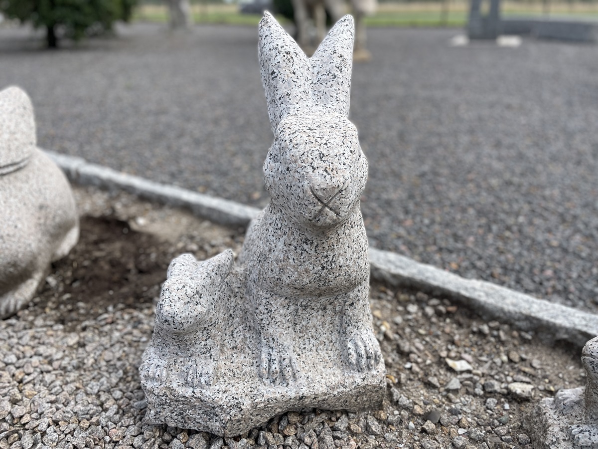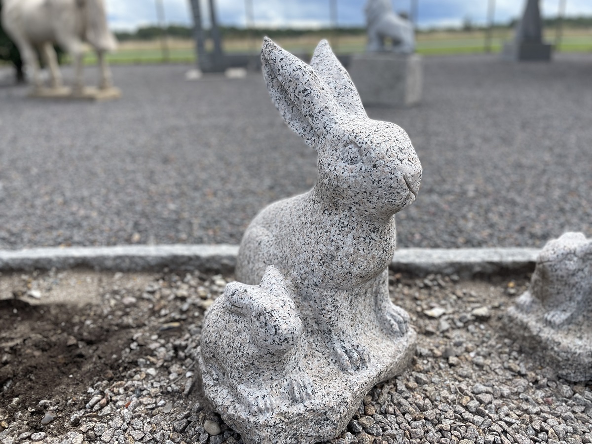 Granitfigur af en kanin med en unge tæt ved sin side. Granitfiguren er lavet i rosa granit og har bløde former og afslutninger, samt strittende spidse ører, som giver kaninerne det karakteristiske look.