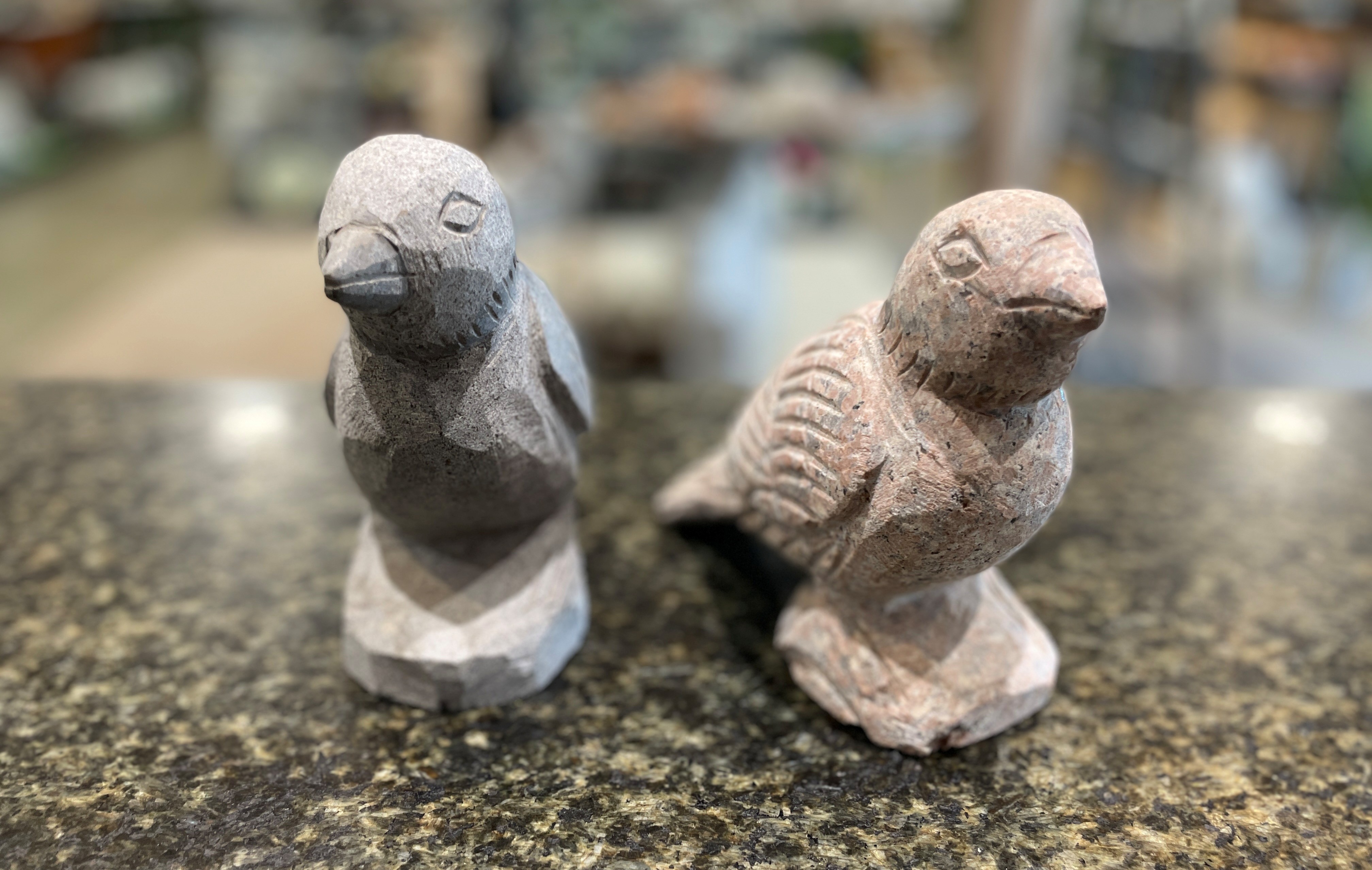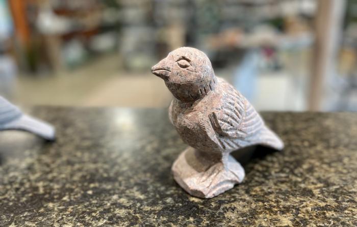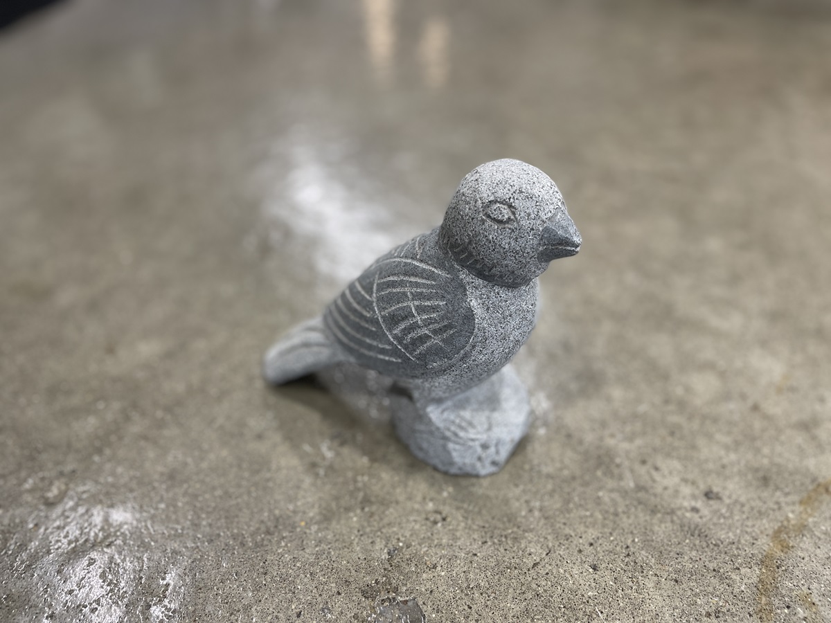 Fugl lavet i grå og rosa granit, med polerede detaljer, på vinger og næb.