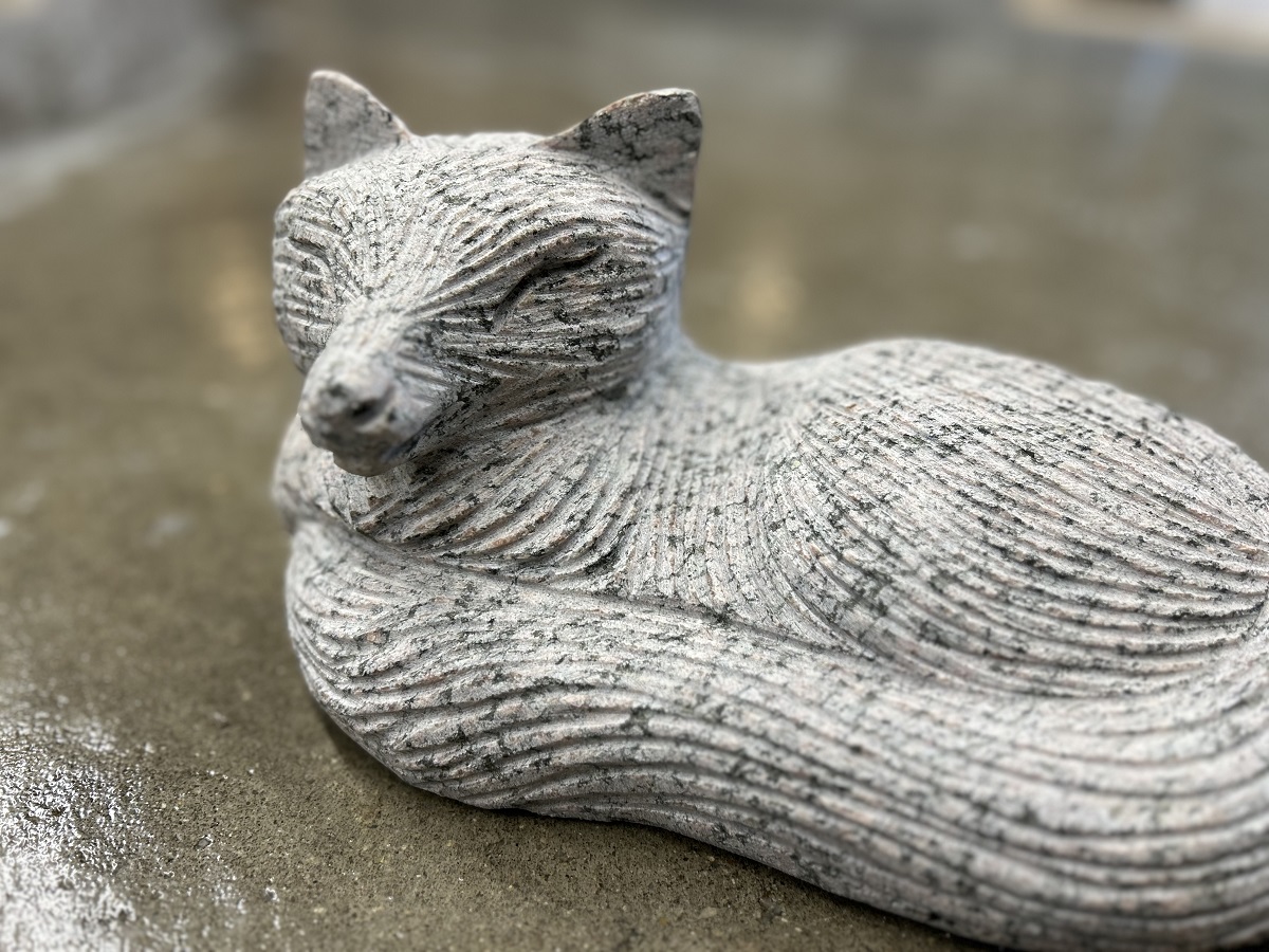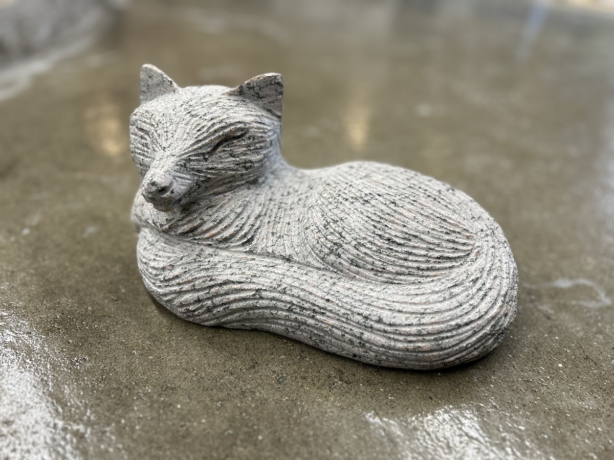 Ræven er et utroligt flot dyr med den lange hale og flotte rødlige pels. Denne granitræv er muligvis mere ønsket i haven end en rigtig ræv. Den er livagtig og ligger fint og forsøger at holde varmen. Den rødlige granit, som fremstår lysere, når den er tør, får ræven til at virke mere naturtro. Ræven skræmmer ingen væk, men ligger blot helt stiller og iagttager sine omgivelser.